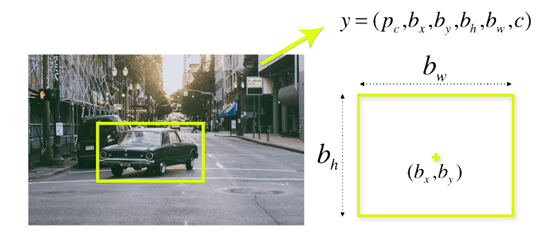 Bounding box란 이미지 안의 물체를 강조 표시하는 박스임모든 Bounding box는 다음과 같은 속성을 가짐$폭(b_w), 높이(b_h), 박스 중심점(b_x,b_y), Class(c, 사람, 자동차, 고양이 등), p_c(해당 클래스에 대한 확률)$