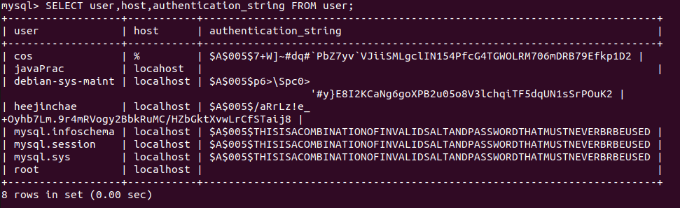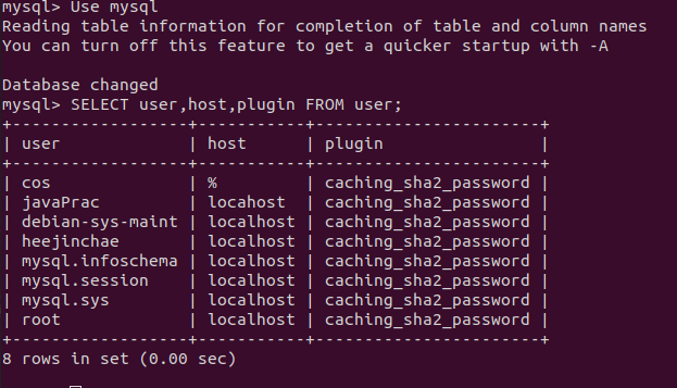 위에 보시면 root의 plugin만 auth_socket으로 되어 있는 것을 볼 수 있습니다. 제가 원래 참조한 사이트에서 다른 user의 plugin은 mysql_native_password으로 되어있어야 하는데, 제가 뭔가 설정해서 비밀번호 암호화에 걸려버린거 같습니다.