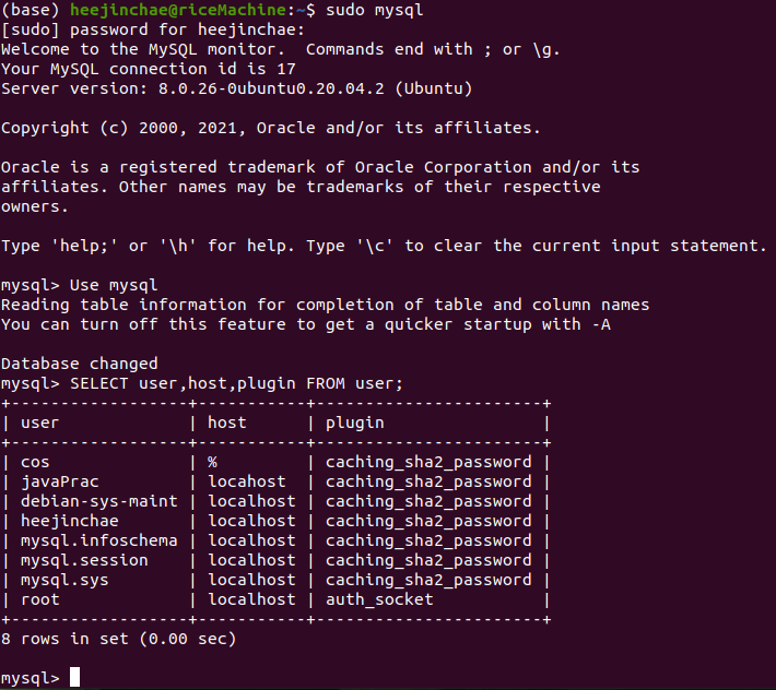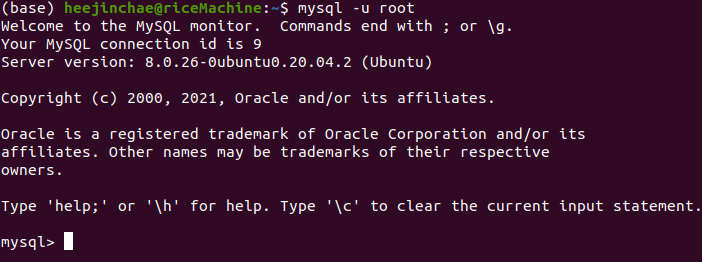 (base) heejinchae@riceMachine:~$ mysql -u root