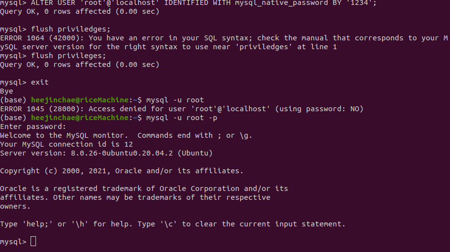 (base) heejinchae@riceMachine:~$ mysql -u root -p