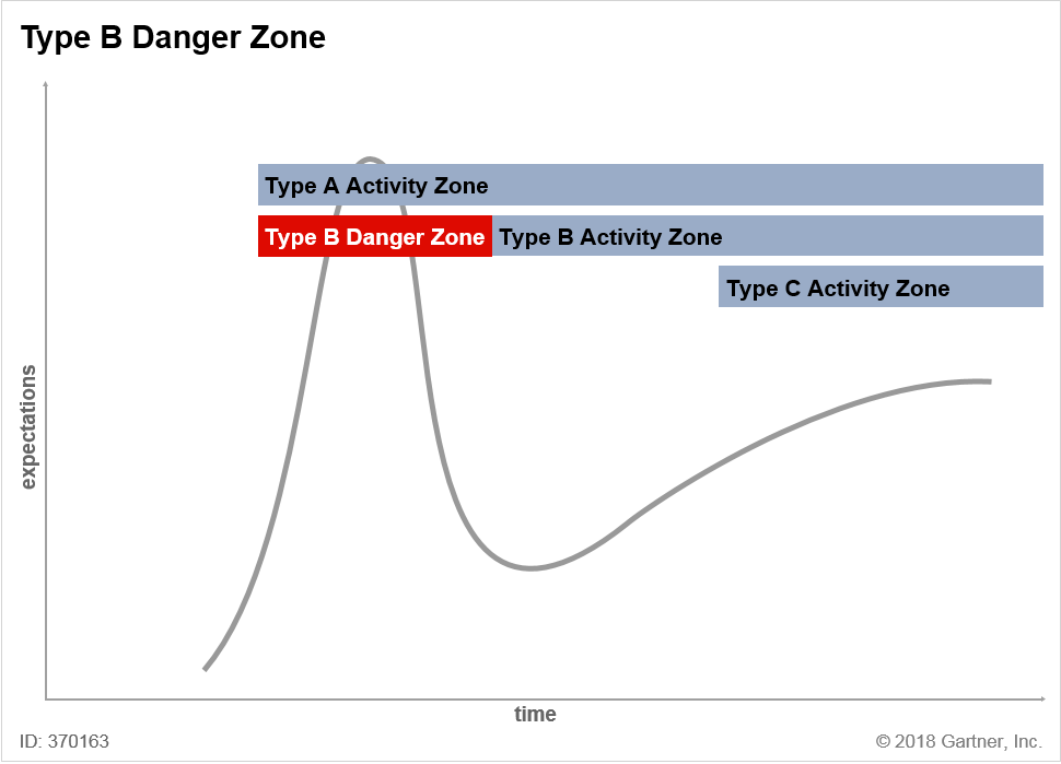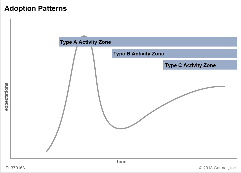 - 유형 B(대다수): 이러한 조직은 과대 광고 사이클의 중간에 혁신을 채택하려고 합니다. 그렇게 함으로써 그들은 유형 A 조직의 경험에서 배우지만 경쟁자보다 뒤쳐져 유형 C 조직이 될 정도로 오래 기다리지 않습니다.