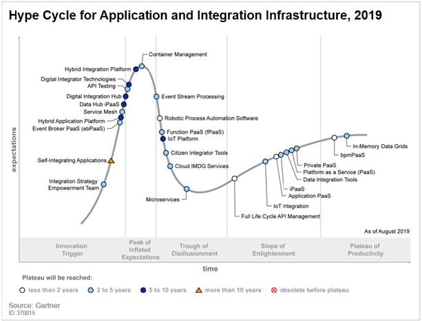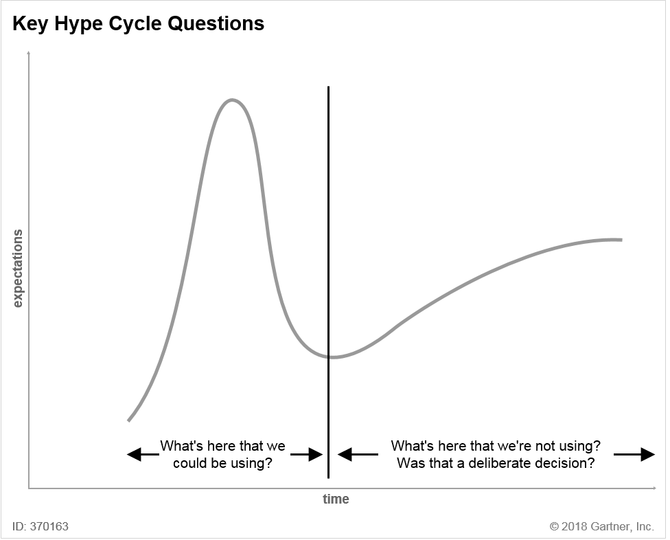 Hype Cycles는 과도한 열광에서 환멸의 기간을 거쳐 시장 또는 영역에서 혁신의 관련성과 역할에 대한 궁극적인 이해에 이르기까지 혁신의 전형적인 진행을 특징으로 합니다(그림 1 참조).