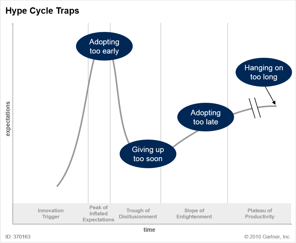 - 긍정적이고 부정적인 과대 광고의 끊임없는 공세는 종종 조직이 리소스를 최대한 활용하지 못하는 방식으로 행동하게 만듭니다. Hype Cycle의 최고점과 최저점은 조직이 잠재적 가치를 모른 채 위험한 기술이나 혁신을 채택하도록 압력을 가합니다. 또한 관련성이 높을 수 있는 덜 가시적인 혁신을 수용할 기회를 가립니다. 이것은 Hype Cycle의 네 가지 함정으로 이어집니다. 너무 일찍 채택, 너무 빨리 포기, 너무 늦게 채택 또는 너무 오래 매달립니다(그림 5 참조).