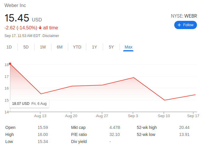 SEC filing(Securities and Exchange Commission)에 의하면, 웨버의 창립자, George Stephen(조지 스테판)은 "거의 70년전에 고유한 석탄 그릴을 발명했으며, 수년간 "전세계의 뒷마당에서 바비큐와 그릴링 열성자와 전문가들의 신임을 구축했다"라고 한다. 웨버의 제품은 작년에 78개국에 판매되었고, 업계의 판매 선두주자이며 가장 크고 수익성이 큰 세계적인 지형도를 가지고 있다