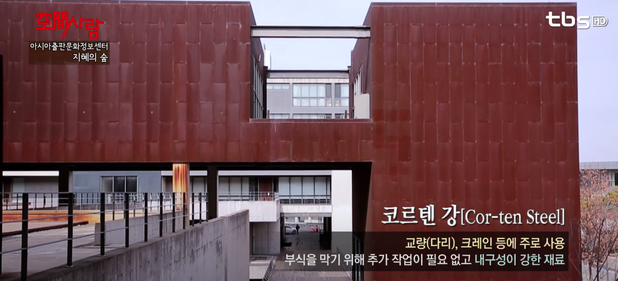 여기서는 크게 두가지로, 코르텐 강판이라는 재료와 벌판위에 서있는 건물에 대한 이야기를 합니다. 건축을 할때 주변 환경을 어떻게 활용할지는 중요한데, 여기서는 습지 위에 올림으로서 조화를 이루었다고 합니다. 그런면에서 보면 코르텐 강판은 녹이 슬면서 굉장히 강렬한데, 이건 또 어떻게 받아들여야 할지는 약간 난감한 부분입니다.