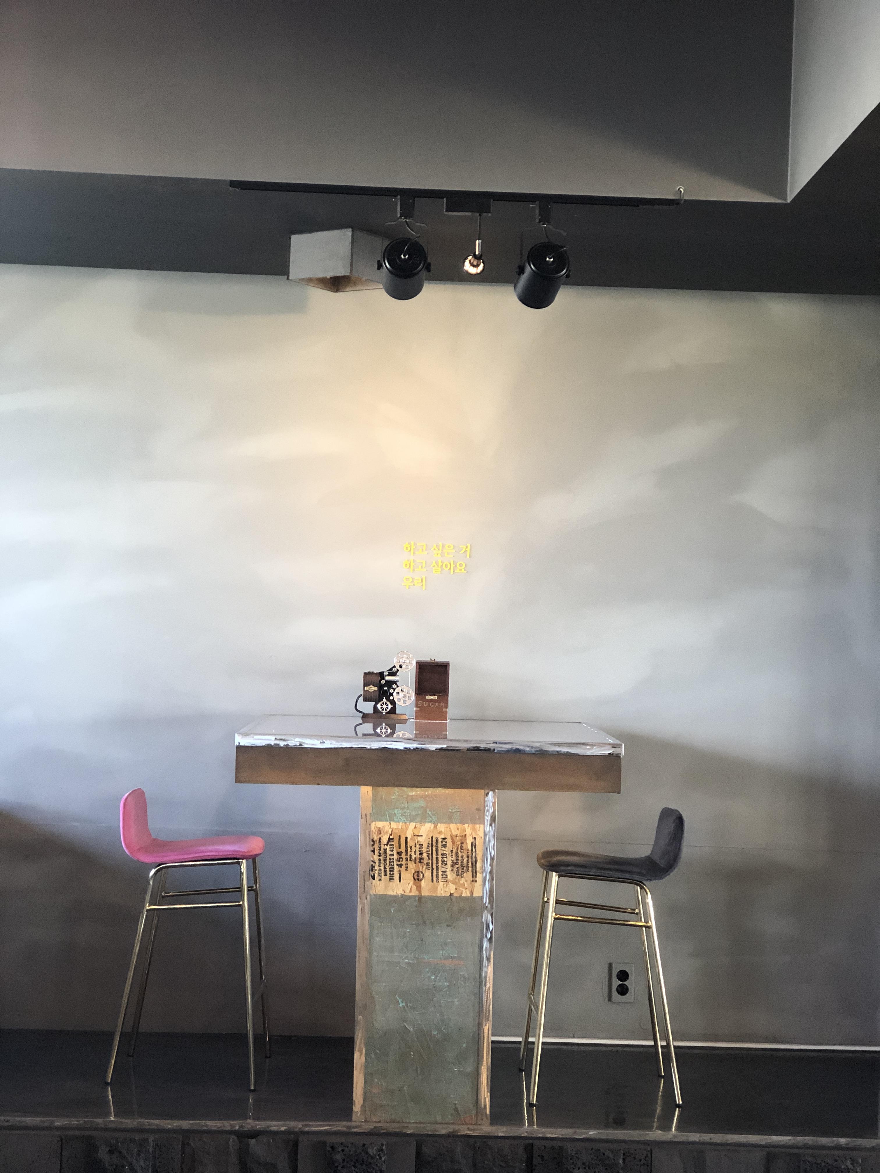 사일리커피를 방문했을때 가장 눈에 띄는 것은 내부 인테리어 였습니다. 요즘 유행하는 인테리어의 느낌이 있기는 했으나 그래도 균형있게 구성되어 있었습니다. 시멘트 벽돌 사이에 넣은 노란 전등은 밤이되면 좀더 은은하지 않을까 하는 생각이 들었습니다.