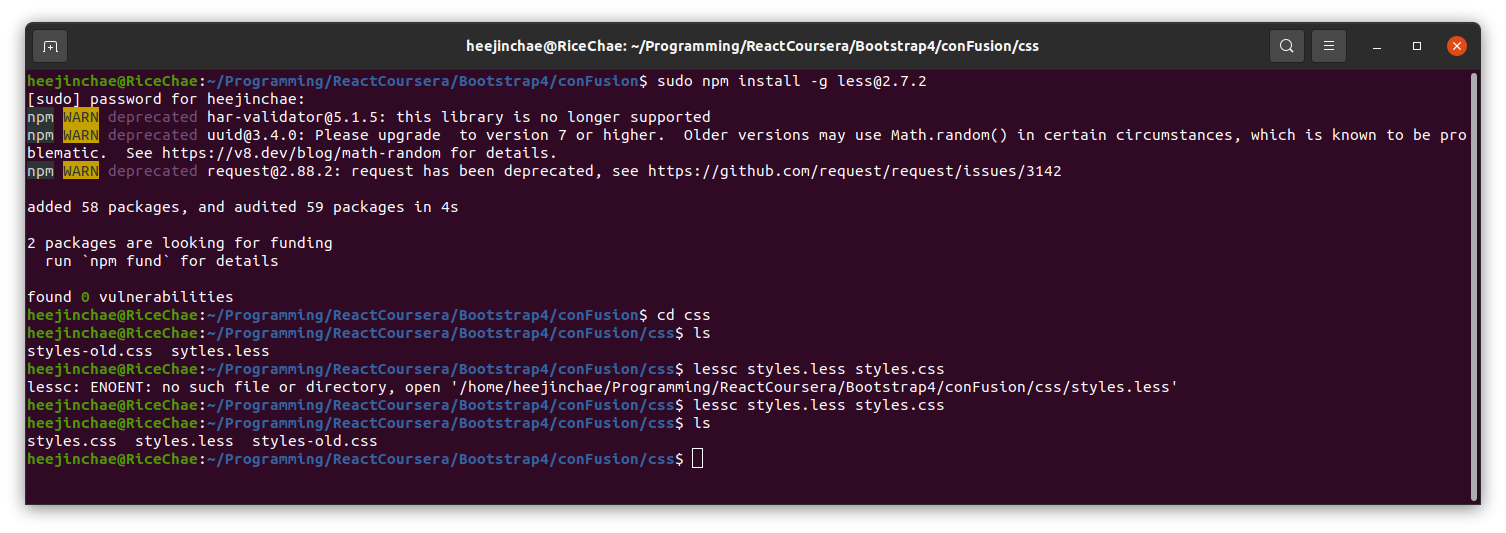 사용 시나리오는 세가지로, less설치, less파일 작성, less->css 전환입니다. 터미널에서 쓰게되는 커맨드는 아래 스크린샷으로 첨부하였습니다.