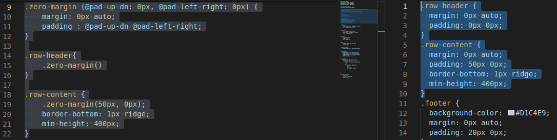 맨 위에 .zero-margin이 정의 되어 있으며, .row-header와 .row-content에서 .zero-margin이 쓰이는 것을 볼 수 있습니다. 둘의 차이점은 .row-content에서는 원하는 값을 입력했다는 것입니다.