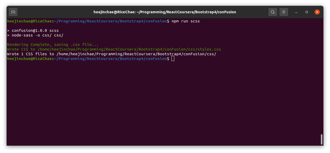 앞에서 설정이 잘 되었다면 위의 명령어를 css폴더 상위에서 실행하면 됩니다. 성공시 아래와 같은 초록 글자를 볼 수 있습니다.