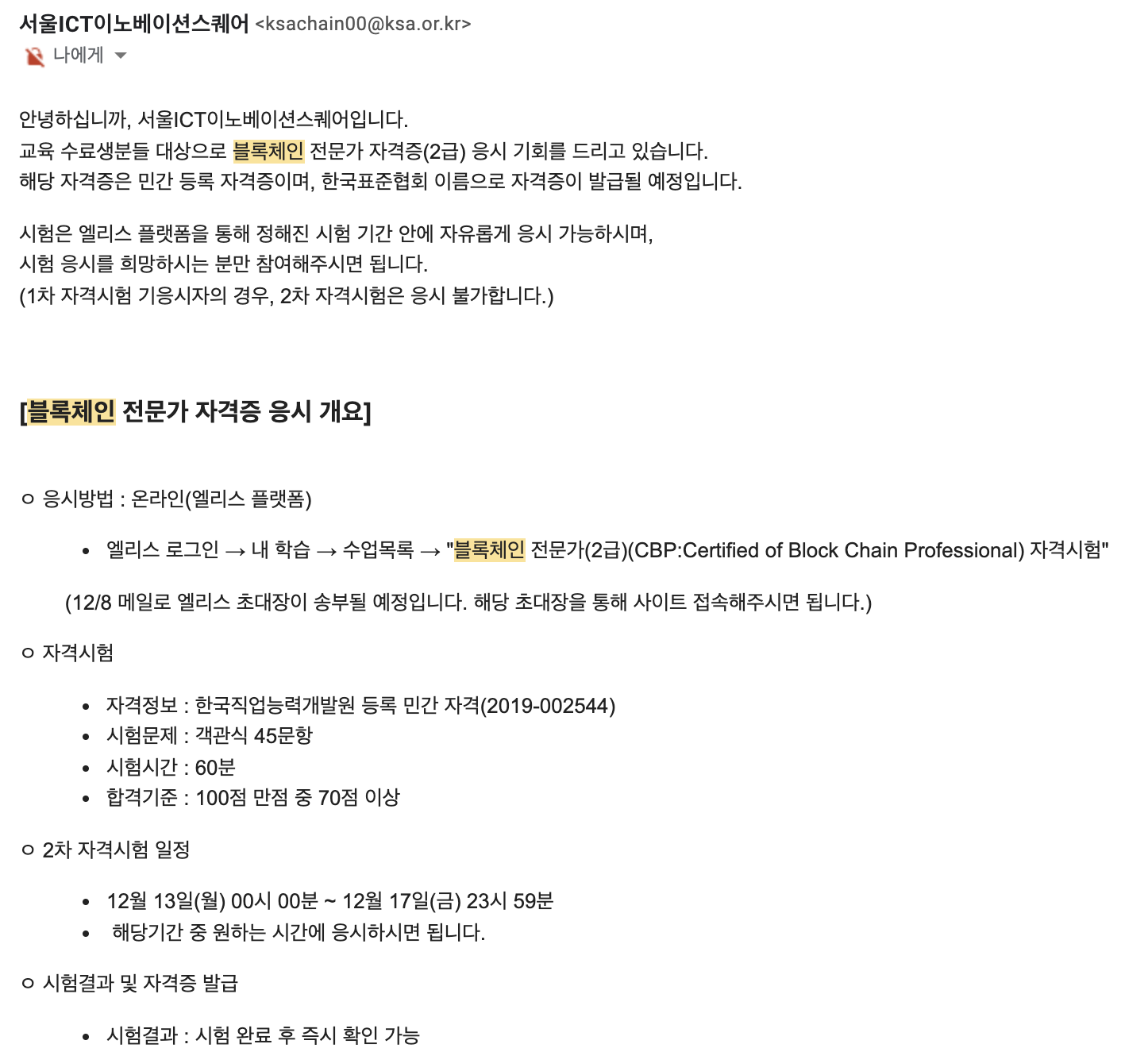 ICT 이노베이션 스퀘어에서 블록체인, 정확히는 Hyperledger Fabric에 관한 수업을 수강하고 평화로운 시간을 보내던 나날중, 메일이 날라왔습니다. 무슨 시험을 보게 해준다는 내용이었습니다. 마음속 깊은곳에는 자격증이 실력을 대변해주지 않는다는게 있었지만, 때로는 자격증 자체가 중요한 때도 있다는 마음으로 시험을 보기로 하였습니다.
