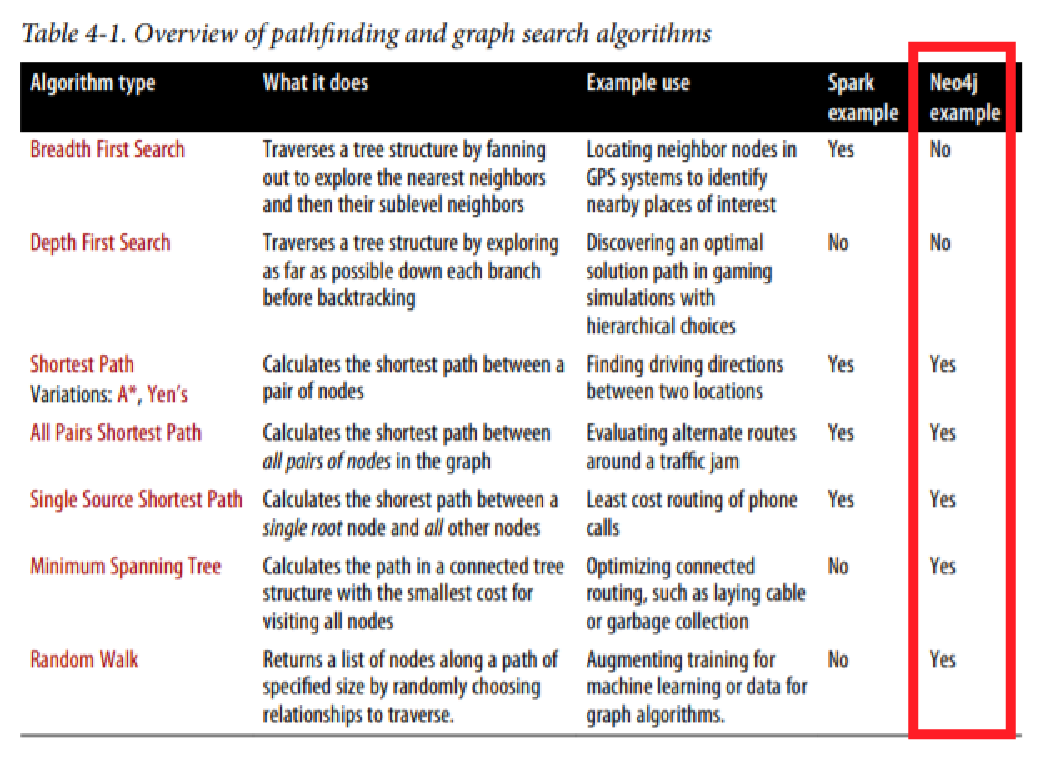GDS 라이브러리는 그래프 알고리즘에 집중된 다양한 분석 능력을 제공한다. 이 라이브러리는 데이터 사이언스 워크플로우, 그래프 위의 머신러닝을 돕도록 설계된 카탈로그된 절차 뿐만 아니라, 커뮤니티 디텍션, 중앙화, 노드 유사점, 길찾기(path finding) 그리고 연결점 예측을 포함한다. 모든 수행은 graph-global 계산과 매우 최적화된 압축 메모리 구조를 다루기 위한 맞춤형 그리고 일반적인 API와 함께, 커다란 스케일과 평행화(병렬 계산?)을 위해 제작 되었다.