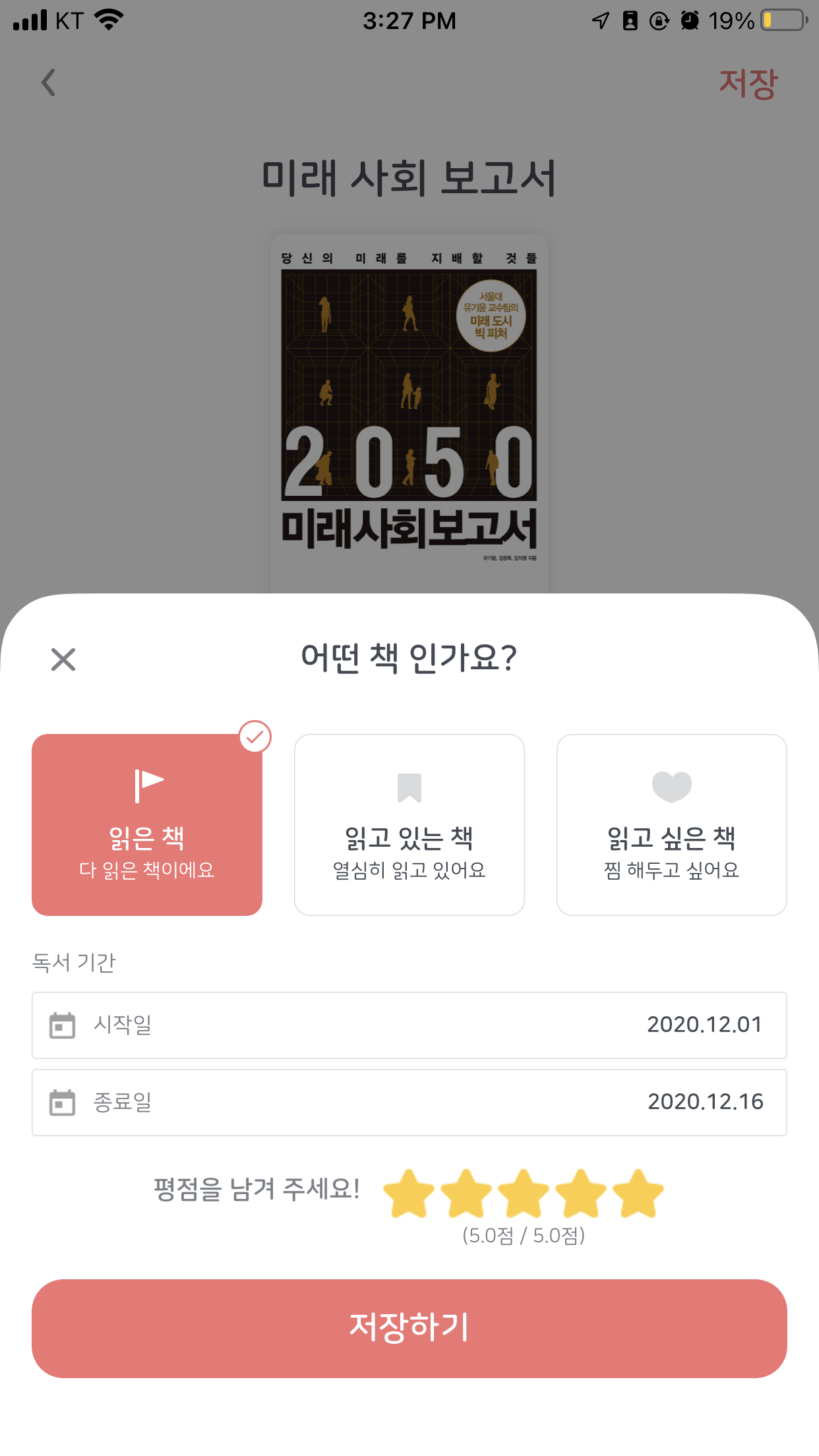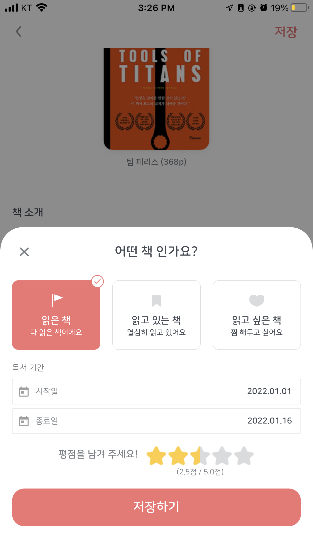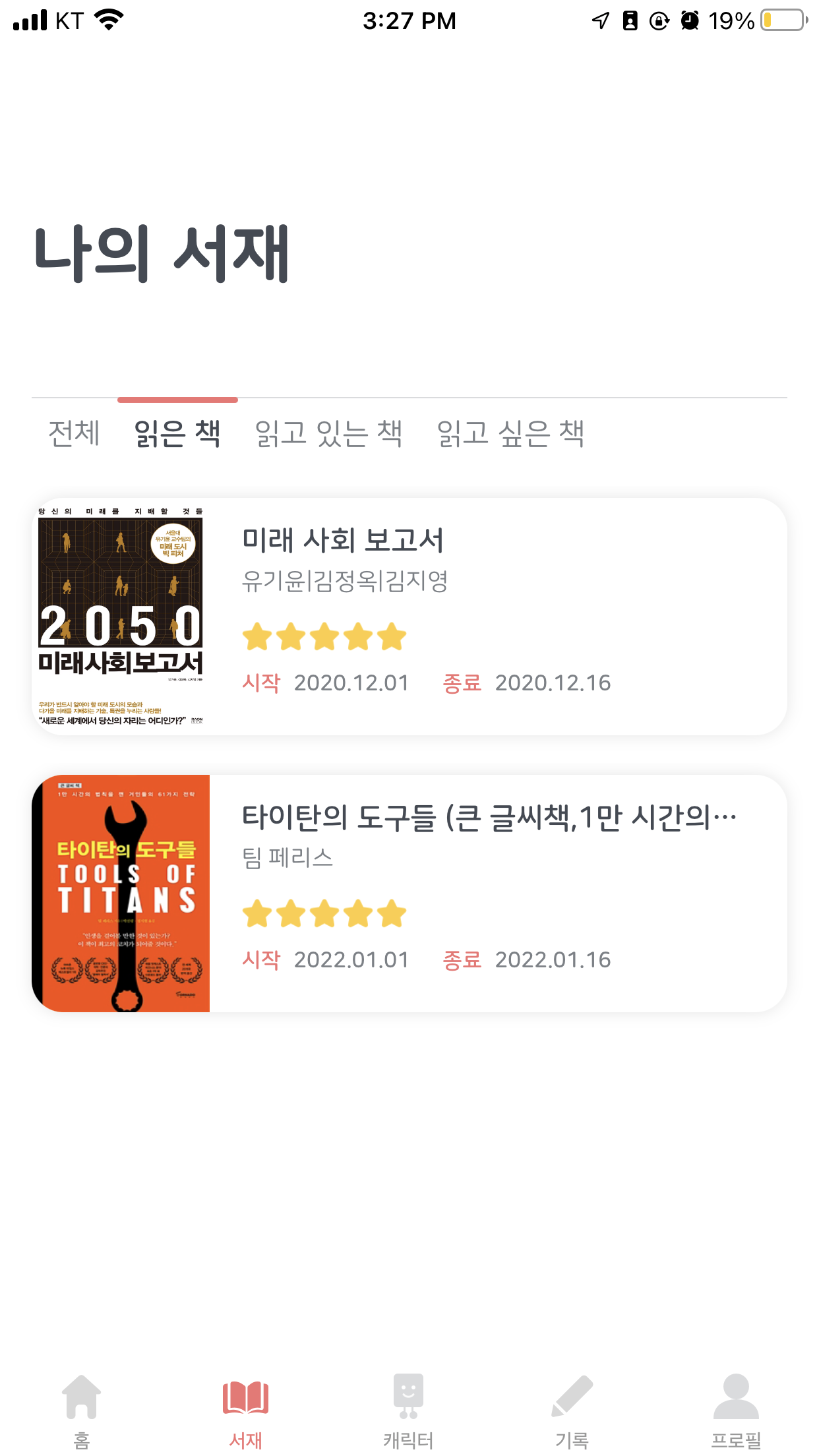 위와같이 책을 검색해서 내 서재에 추가가 가능하다. 읽은 후 평점을 남길 수 있음. 읽은 책의 경우 얼마나 걸렸는지 체크 가능함.