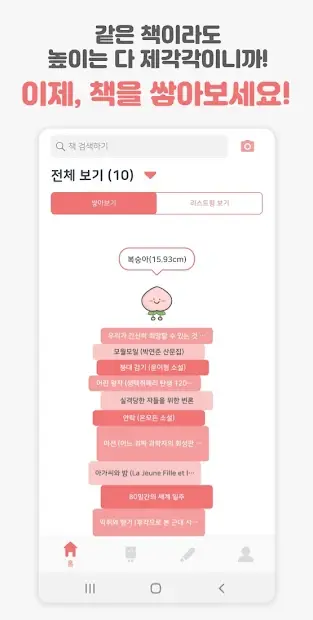 또한 쌓아보기 형식을 통해 얼마나 많은 책을 읽었는지 볼 수 있다. 책을 쌓은 수에따라 캐릭터 레벨업 가능하다.
