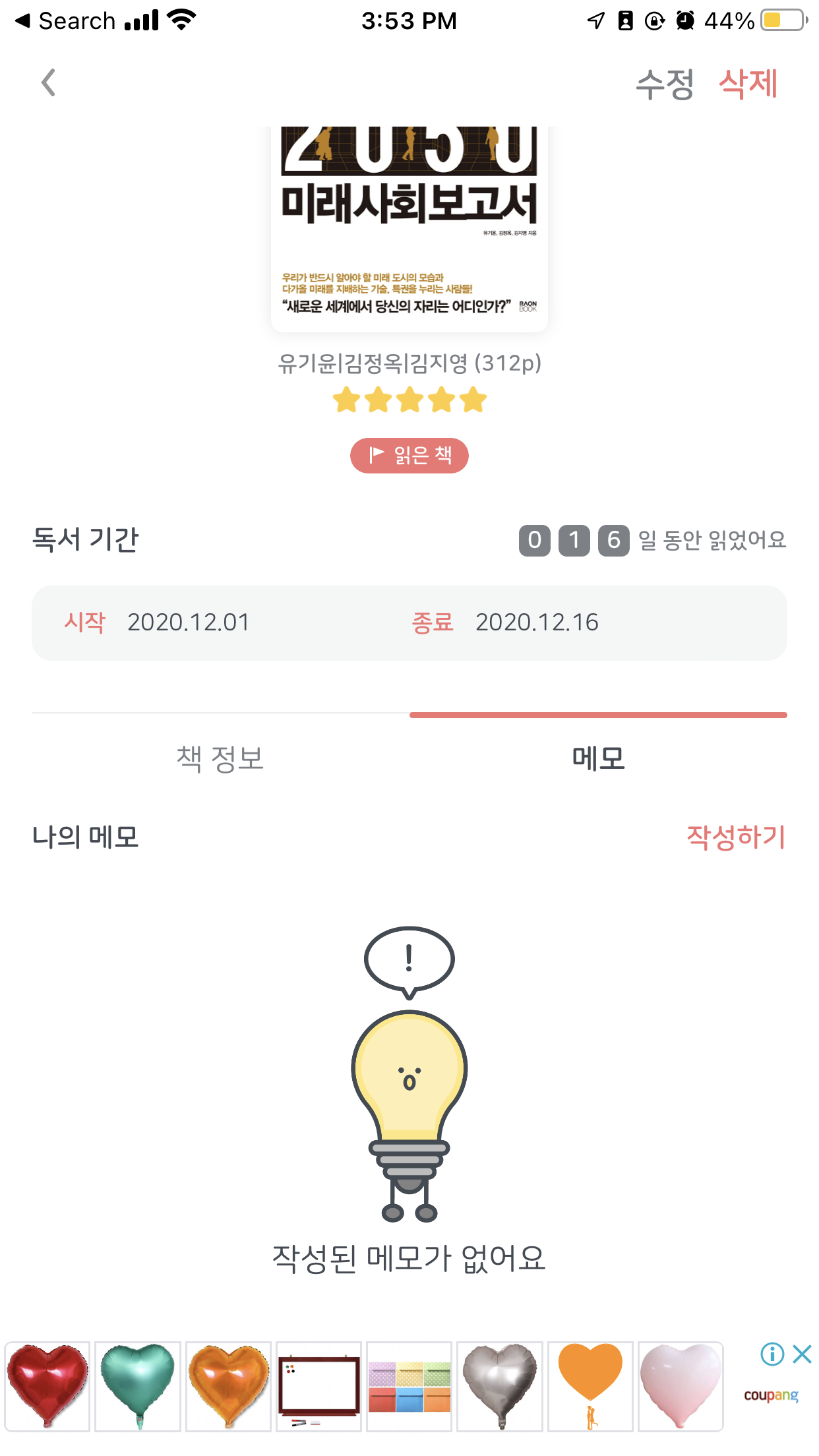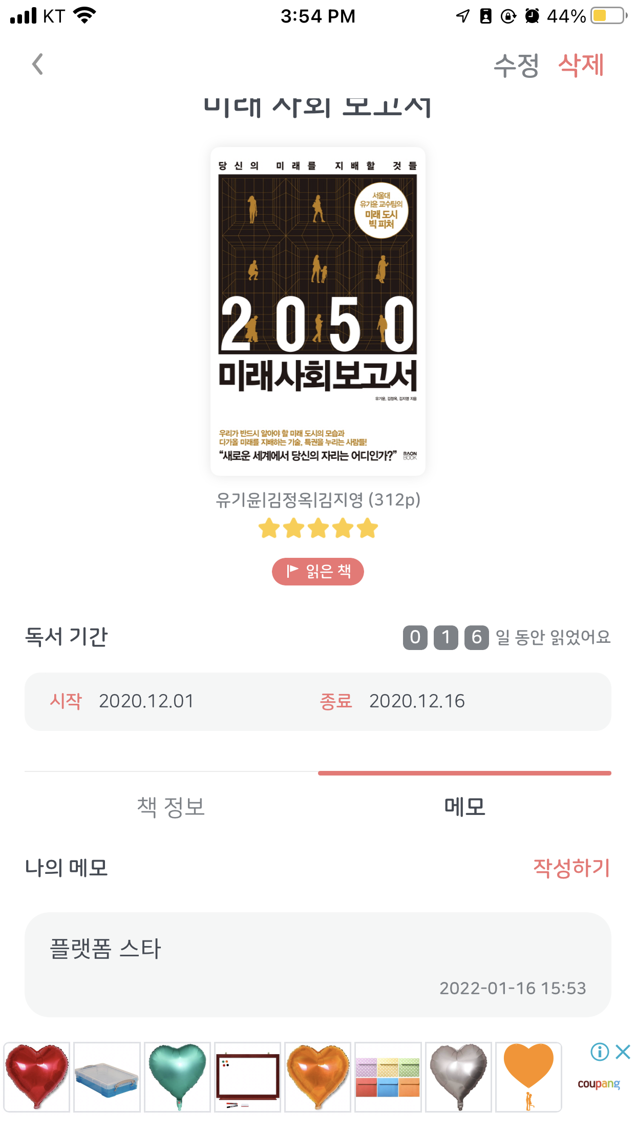 여러 플랫폼에서도 제공하는 기능. 아쉬운 점은 리디북스와 비교할때 책을 밑줄 긋고 표시하는 것이 아닌 본인이 직접 타이핑 해야한다는 점.