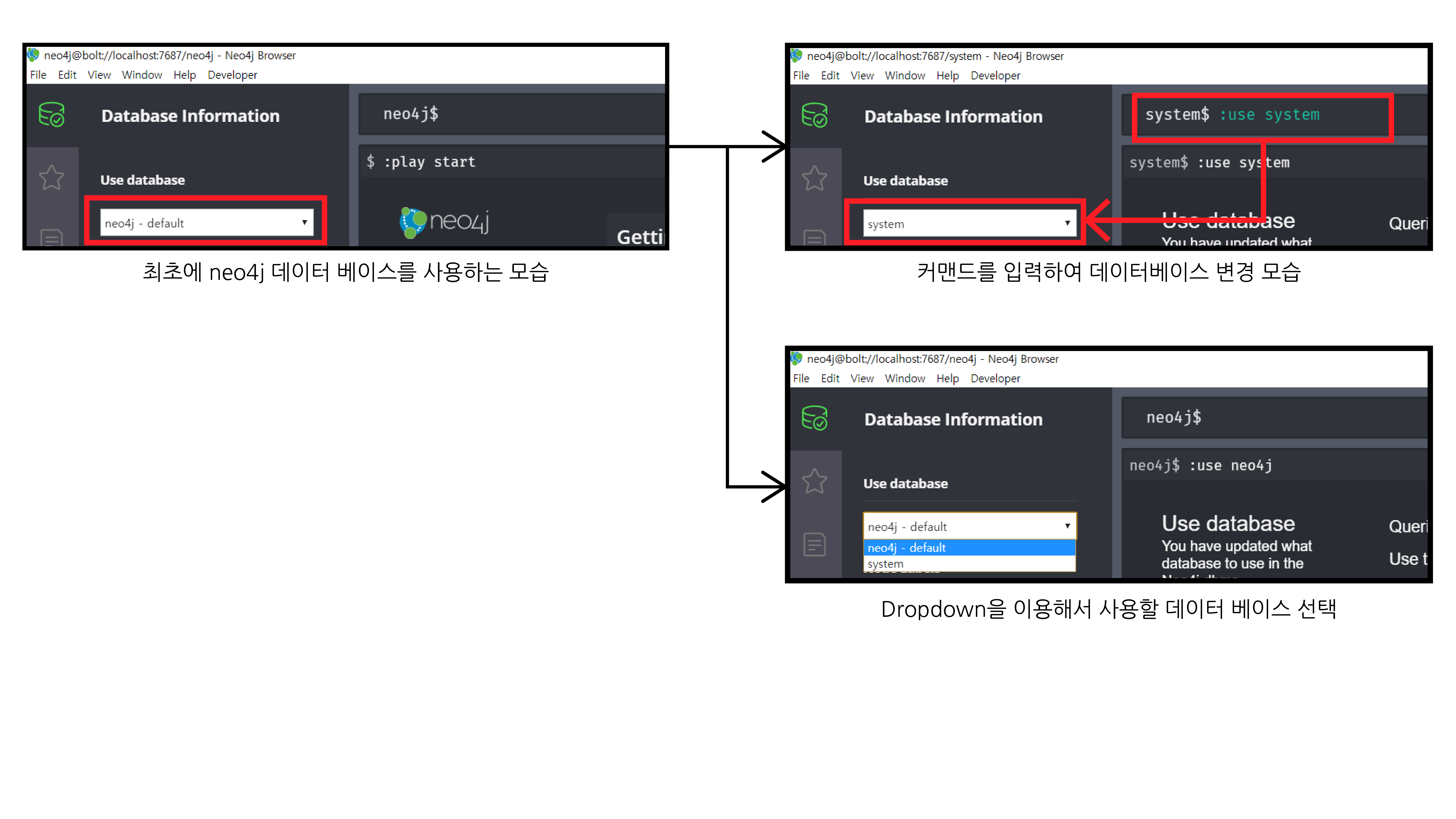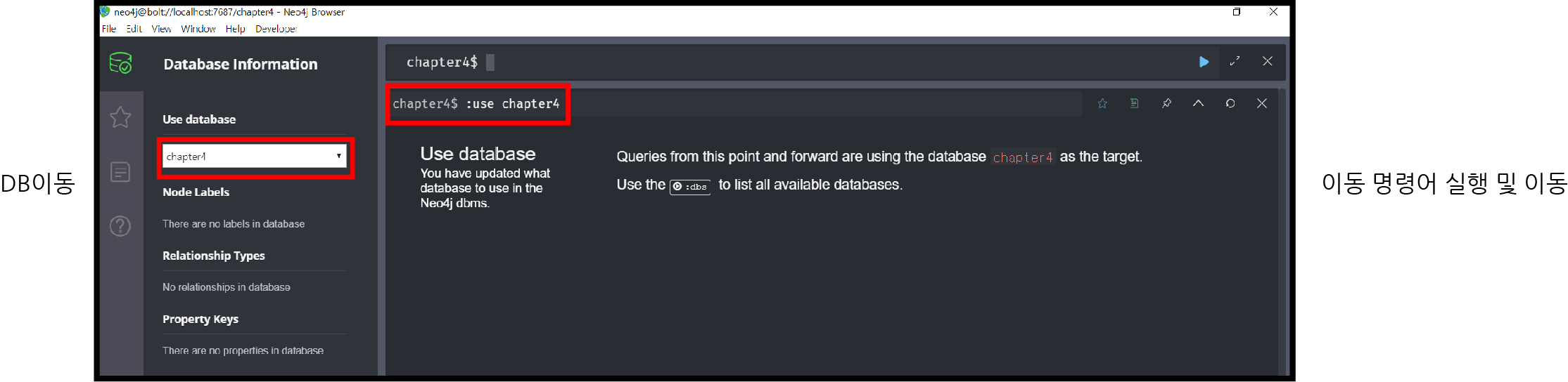 데이터 베이스는 본인이 작업을 할 영역이라고 보면 될 것 같습니다. 기존 RDBMS로 본다면 테이블에 가까워 보입니다. 작업을 하기전에 반드시 데이터베이스를 제대로 선택했는지 확인하고 진행하도록 합시다. 데이터 베이스를 이동하는 방법은 크게 두가지로, 하나는 커맨드를 입력하는 방식이고, 나머지는 마우스를 선택하는 것입니다.