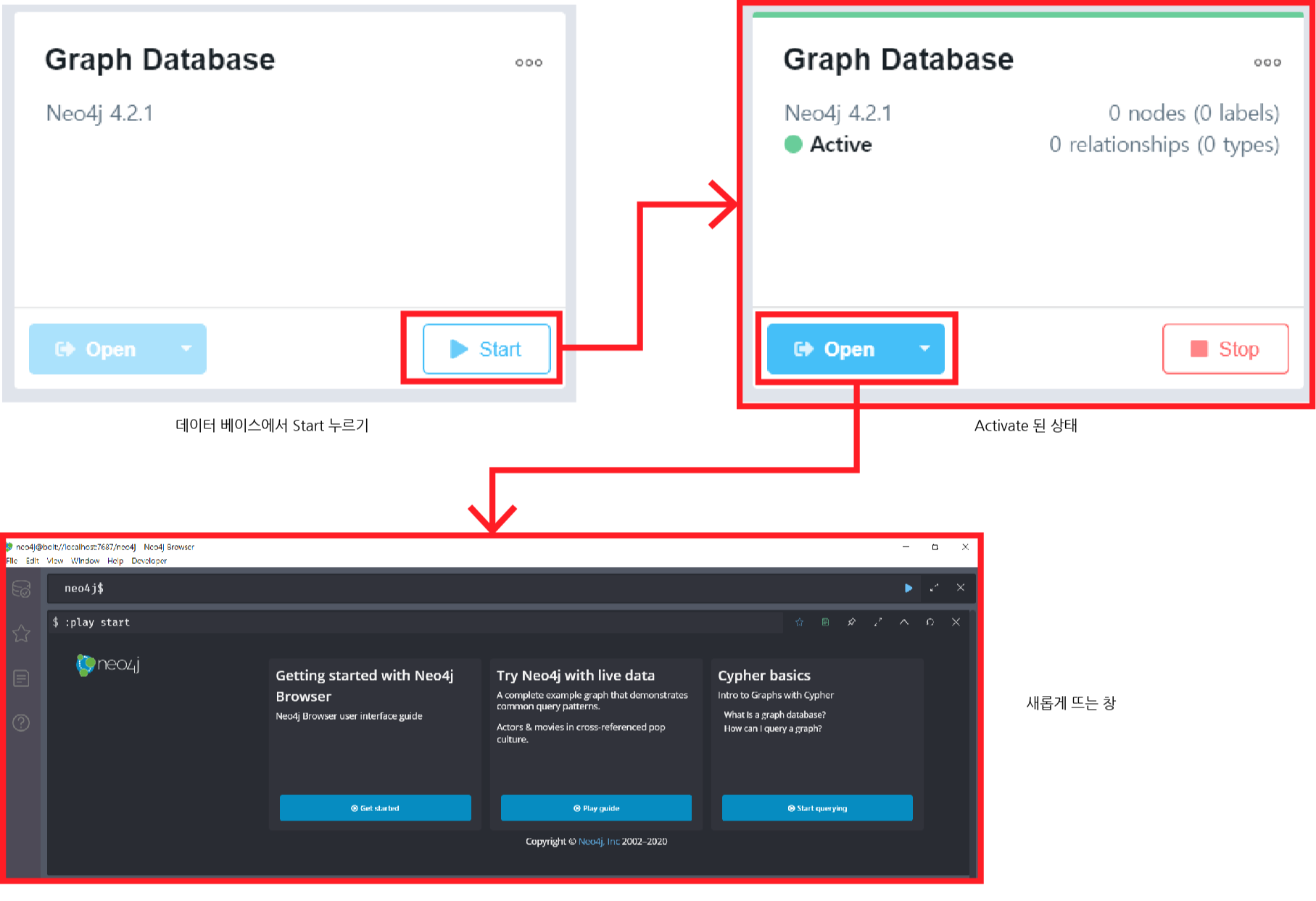 Neo4j에서 데이터 베이스 콘솔을 띄우기 위해선 몇가지 단계를 거쳐야 합니다. 그리 어렵지 않습니다.