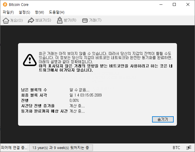 여러가지 내용을 실행하고 나면 위와같은 화면이 나온다. 이 직전에 본인의 하드디스크중 몇 기가를 쓸지 선택하는 화면이 나온다. 나는 2gb로 설정했다. 그래서 최신 블록으로 부터 2gb가 소진될떄 까지 내용을 로컬에 다운로드 받는다고 보면 되겠다. 아마 블록내용이 많아서 로딩시간이 좀 걸리는것 같다.