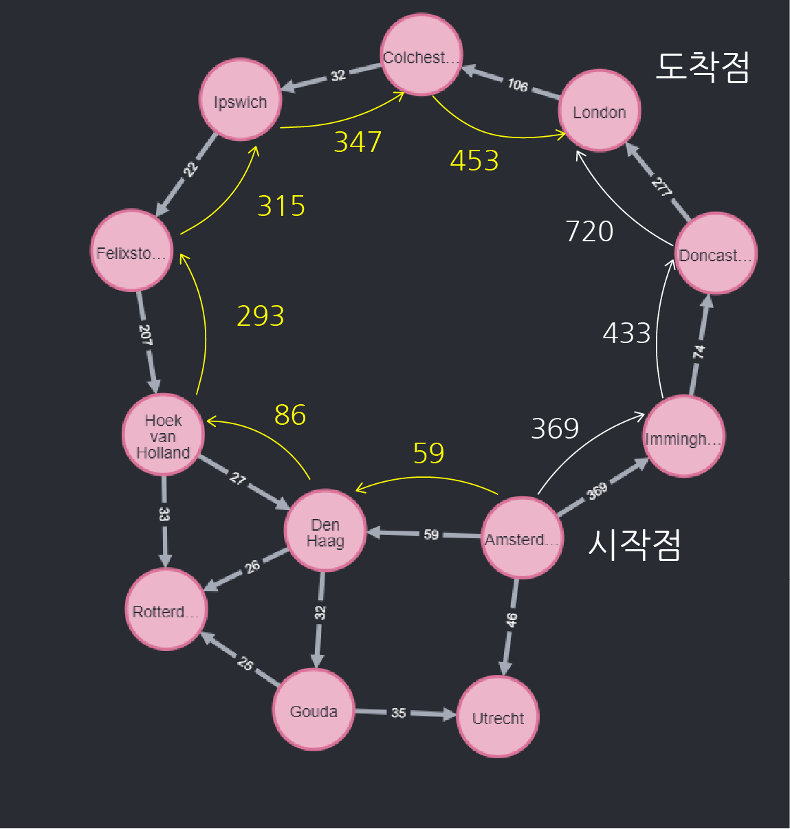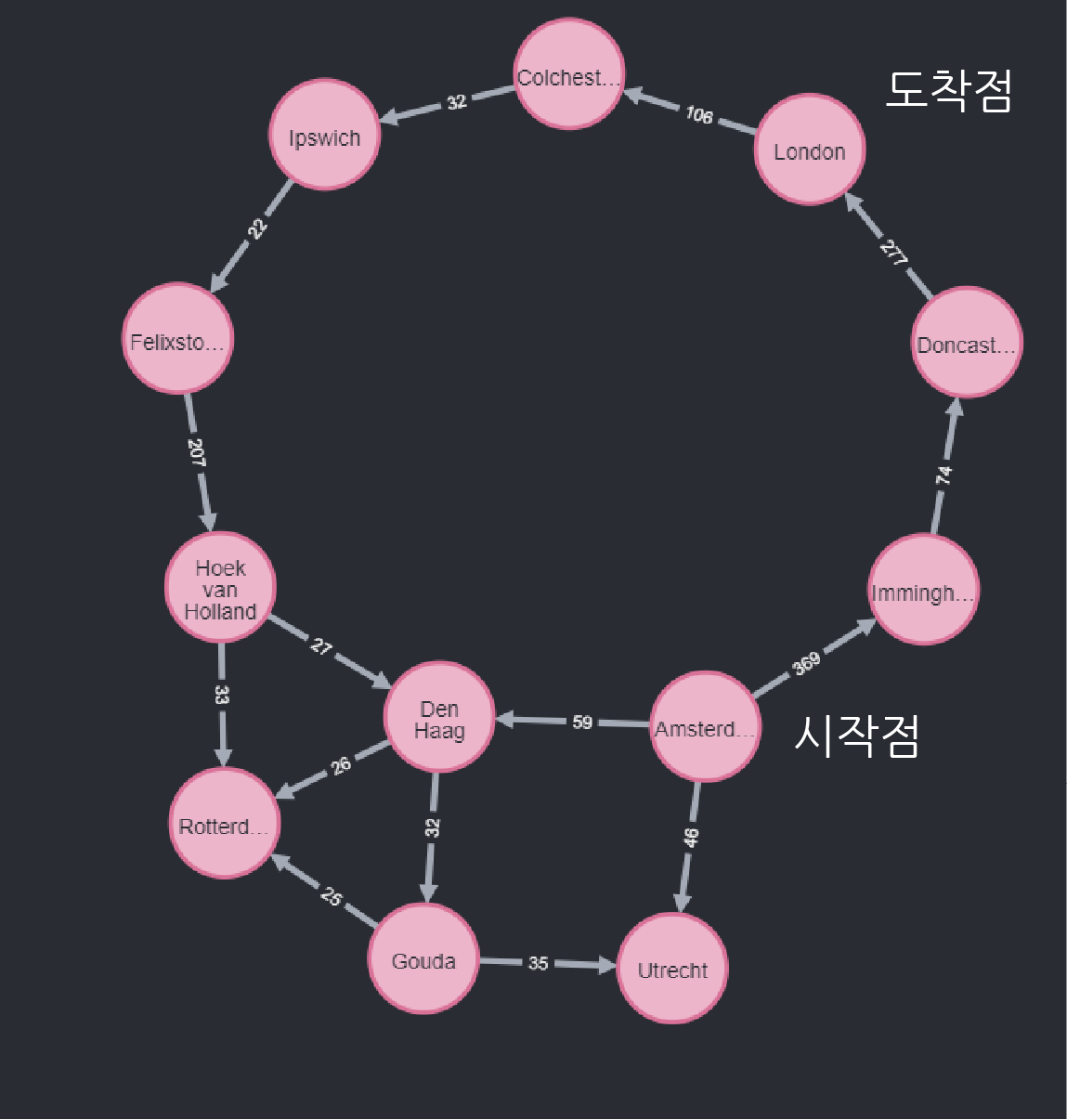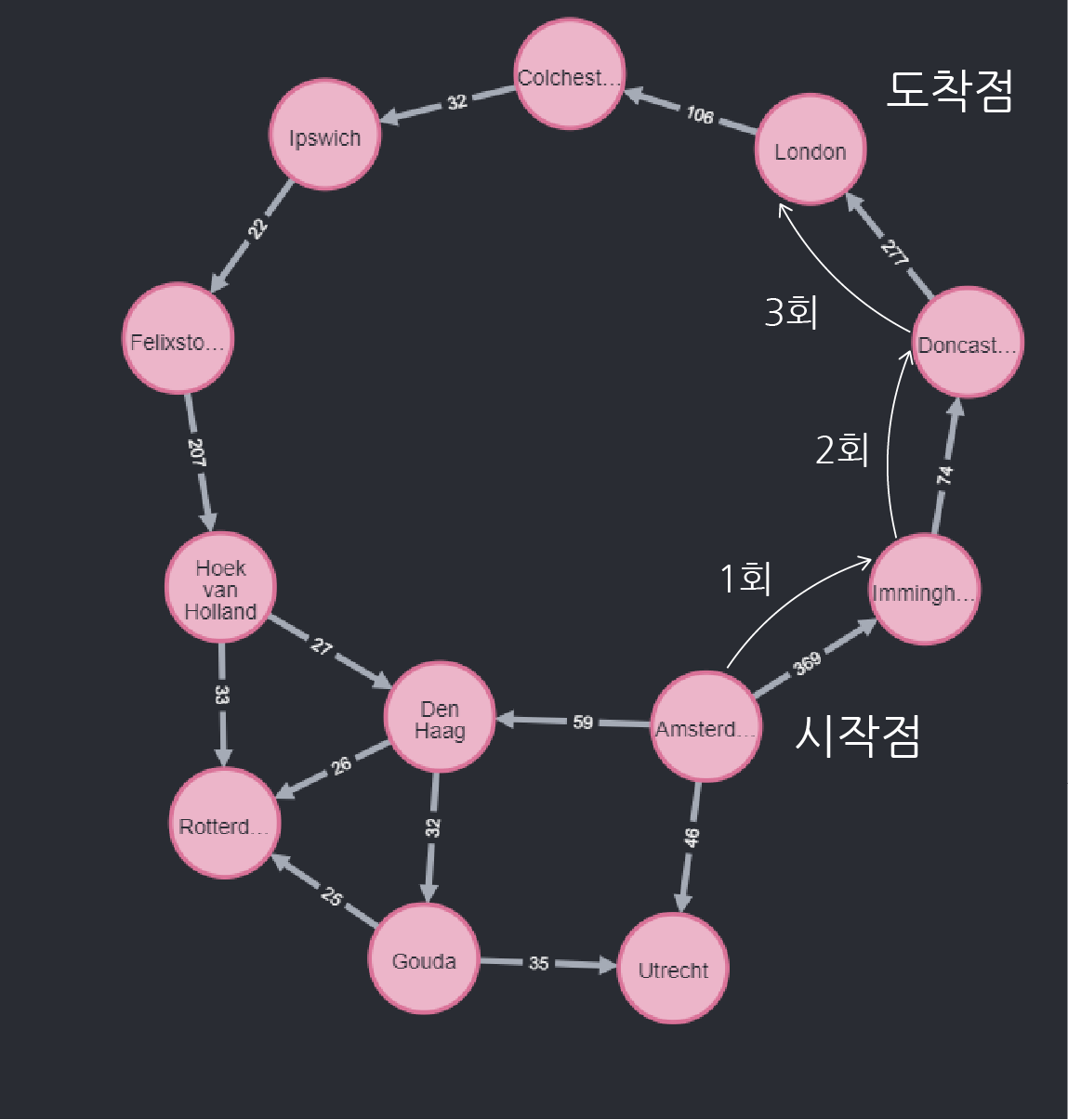 위와 같이 암스테르담에서 런던까지, 2개의 도시거치는 다시말해 3번 이동 하면 도달할 수 있는 것을 볼 수 있습니다.