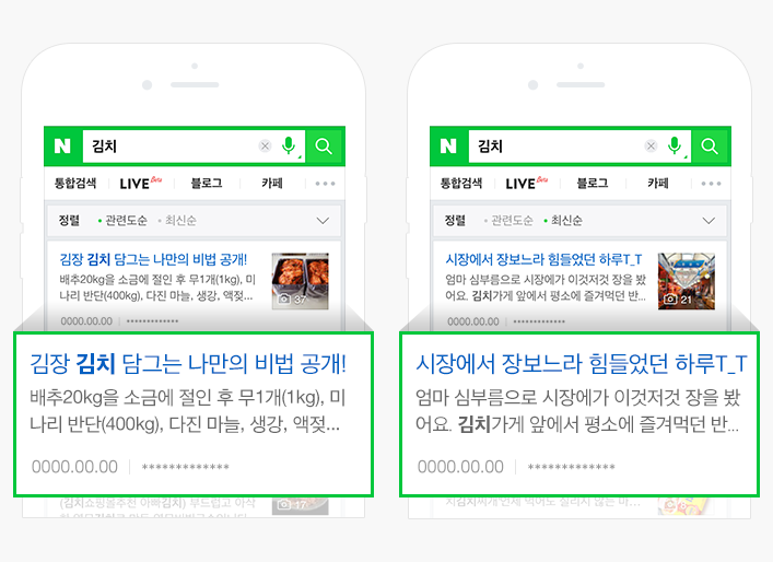 "김치"라는 키워드를 검색한다면 관련도가 가장 높은 글이 제일 위로 올라와야 할 것이다. 위의 예시를 보면 왼쪽에는 관련도순, 오른쪽은 최신순으로 정렬된 것을 볼 수 있다. 문서 안의 내용들을 파악해서 가장 관련이 높은 문서를 제일 위에 보여주는 것이 핵심이다. 만약 이런 과정이 없다면 글이 올라온 순서대로 내 눈앞에 펼쳐질 것이다.