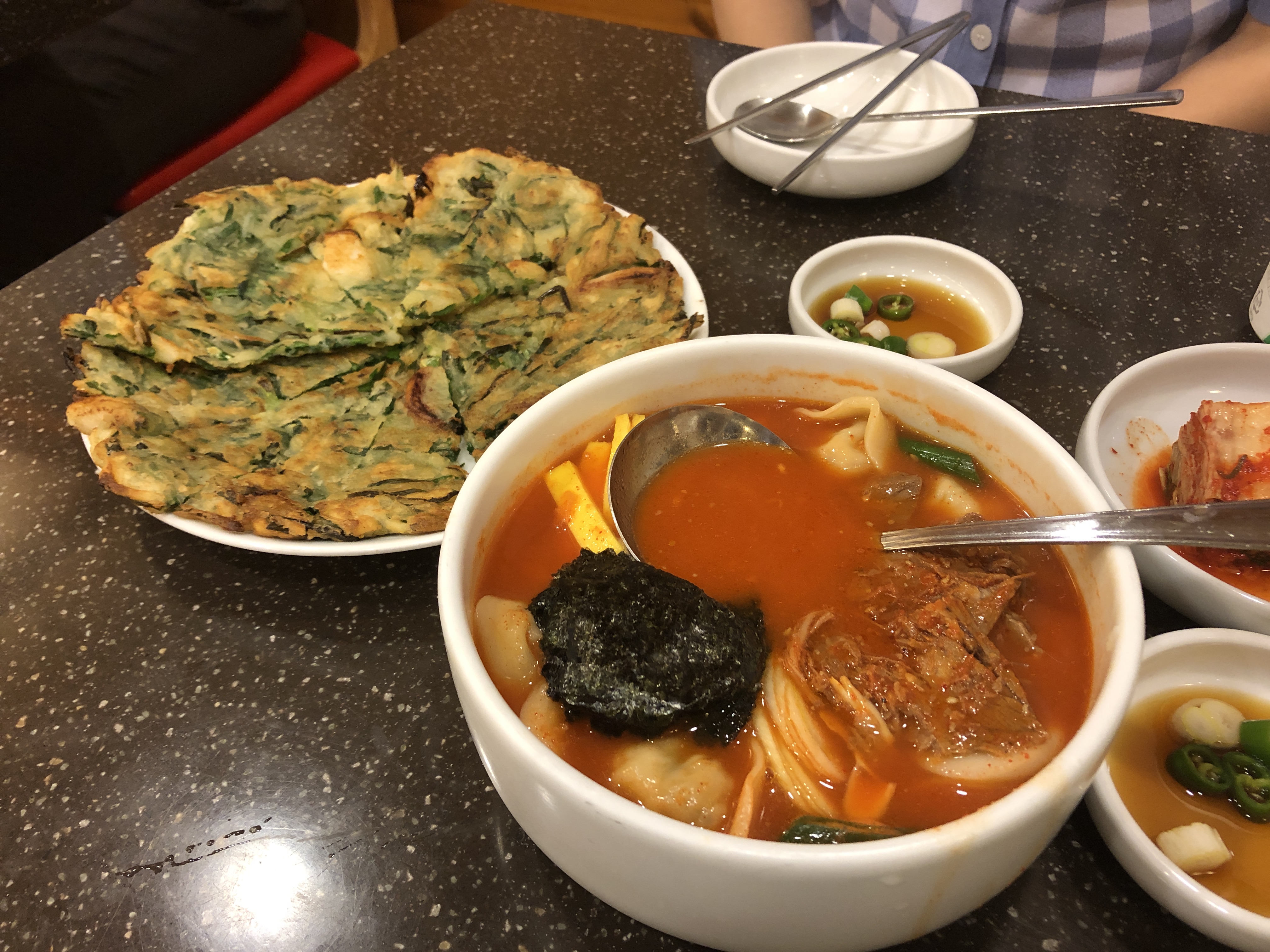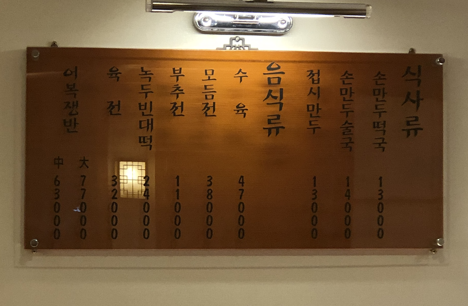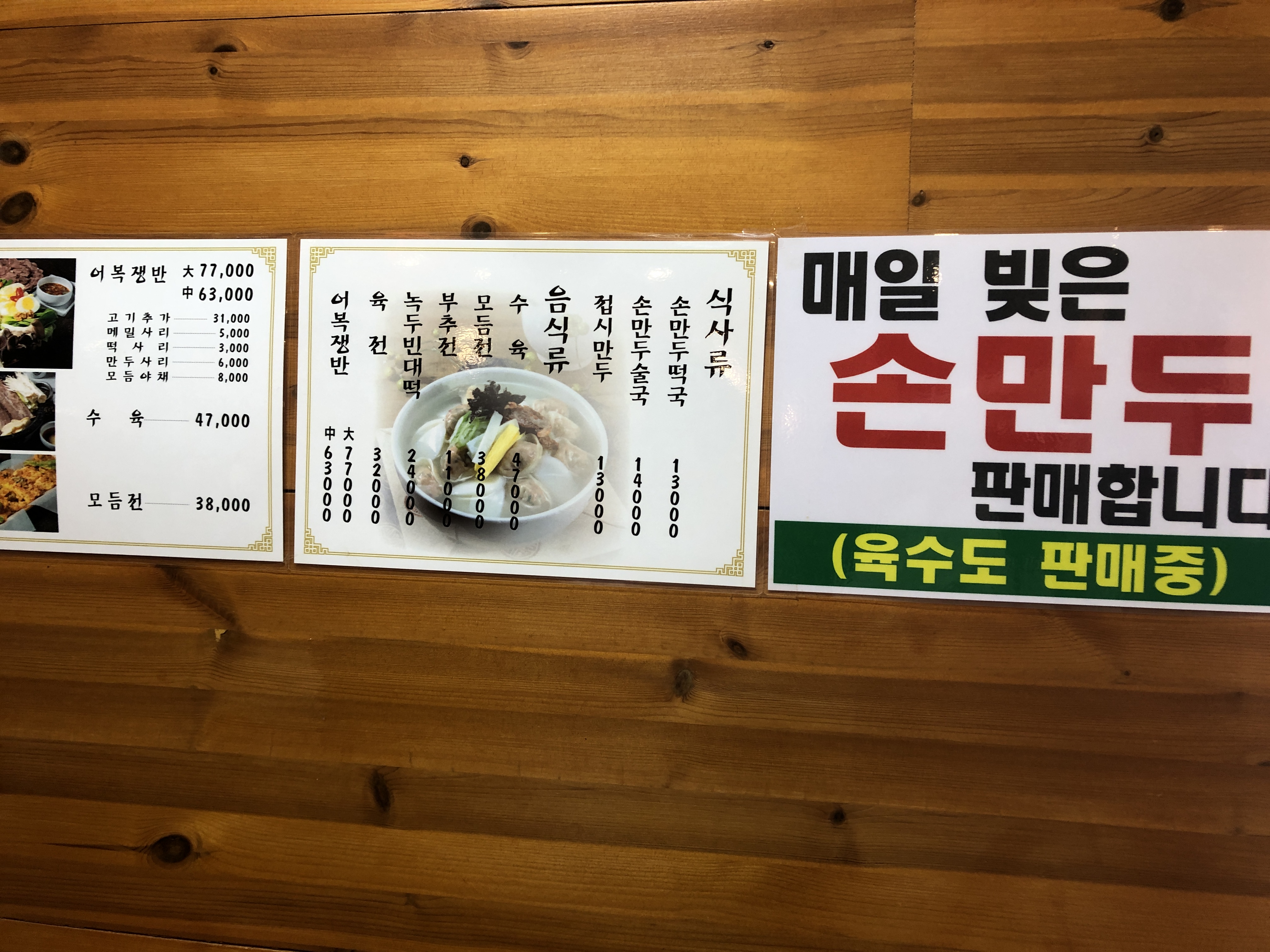 항상 낮에만 이곳을 방문했는데, 저녁에 방문하니 사람이 완전 가득 메우고 있었다. 각 테이블마다 어복쟁반 하나씩 시키고 술을 마시는 모습을 볼 수 있었다. 우리는 경제사정이 그리 좋지 못한 관계로 부추전과 손만두술국을 시켰다.