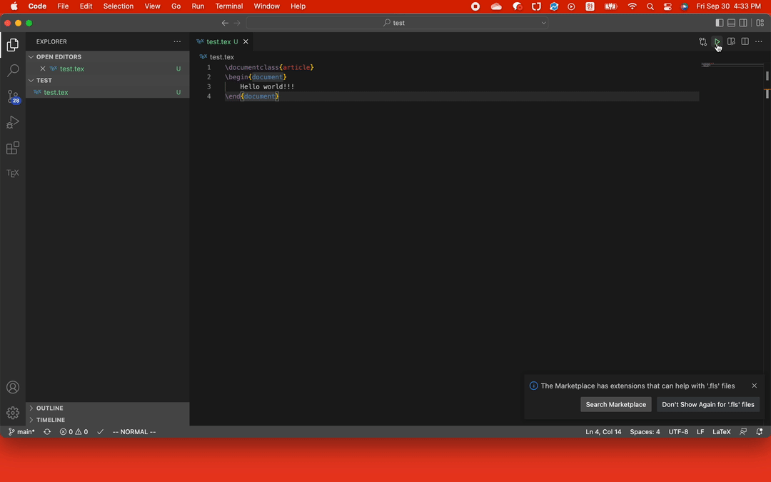다시 말해 터미널을 통해 실행하지 않으면 recipe terminated with fatal error: spawn latexmk enoent.라는 에러가 뜬다.