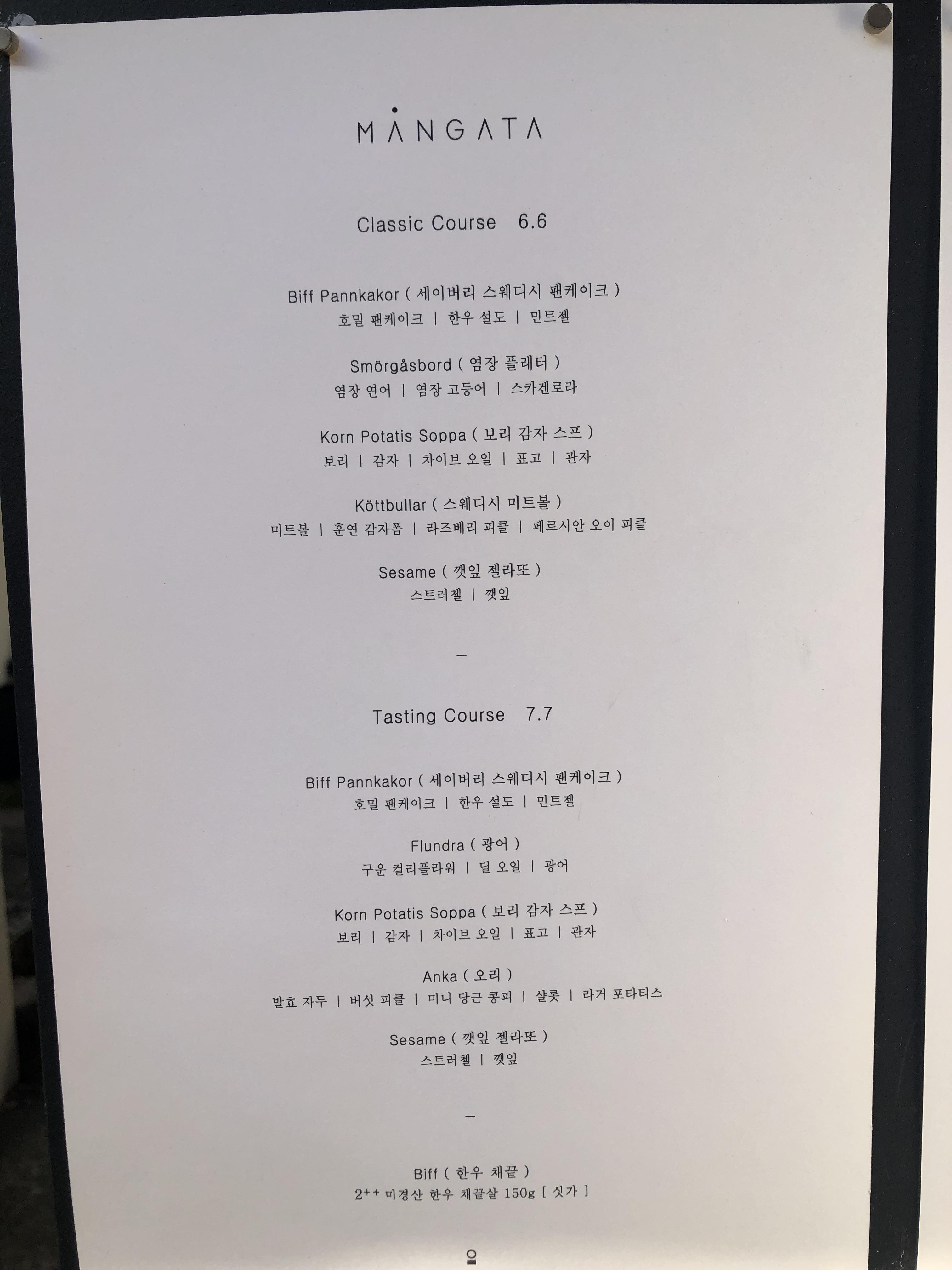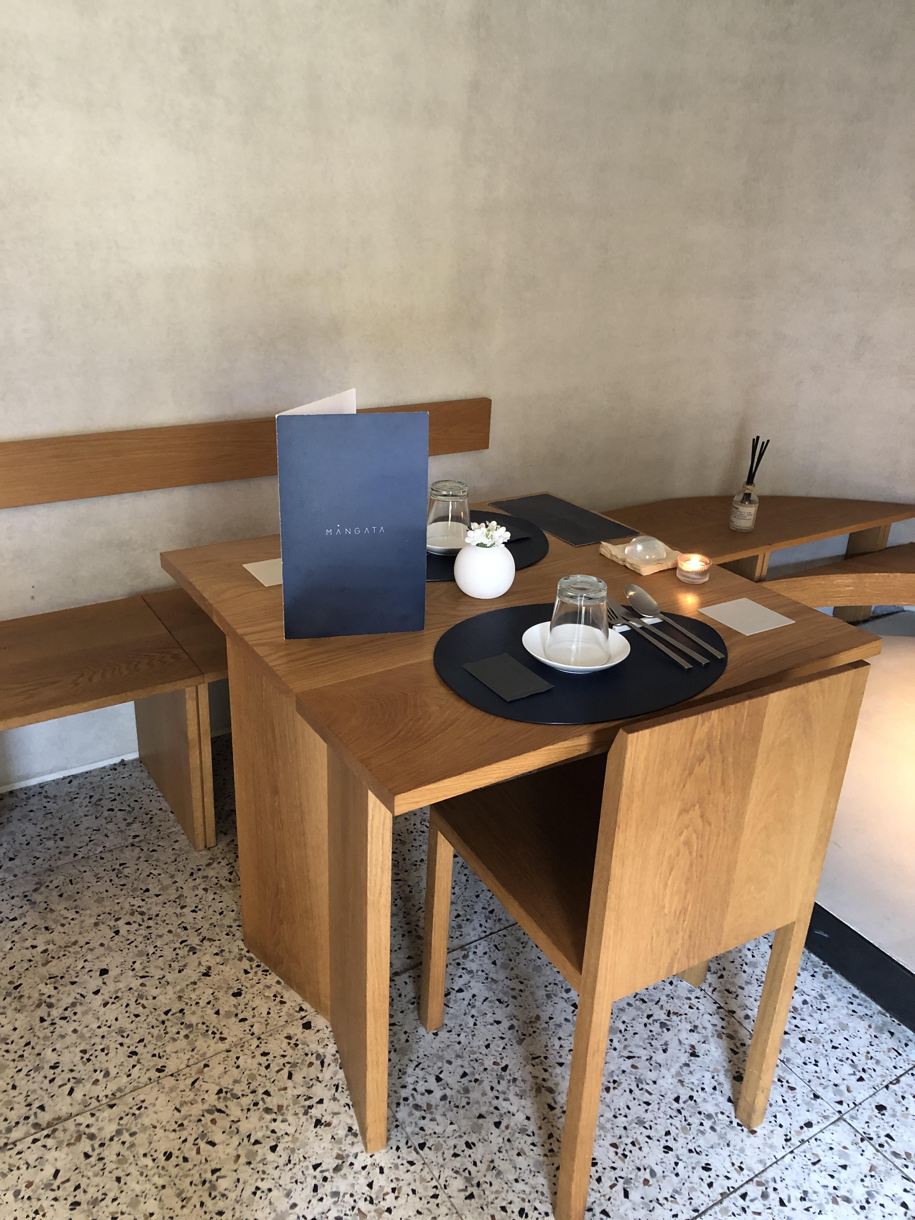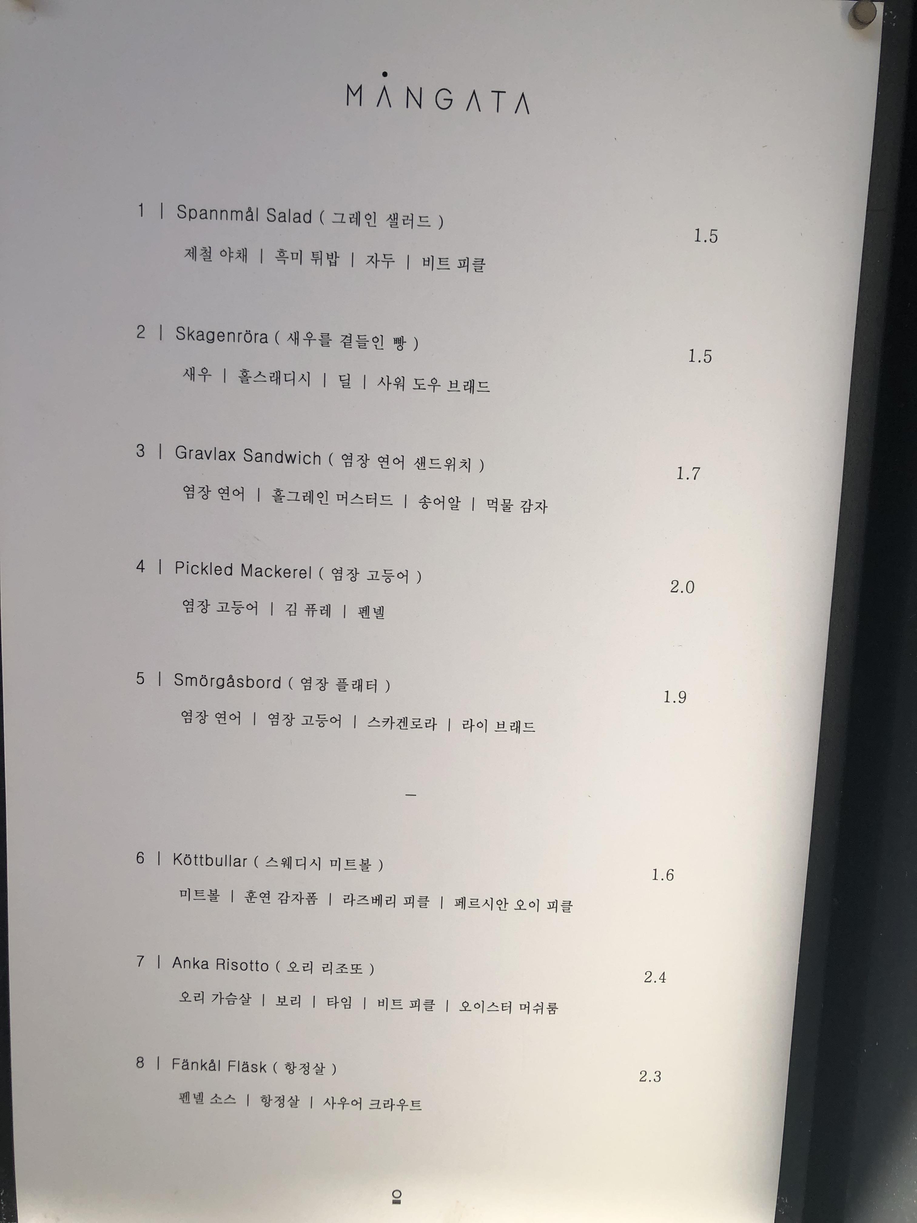 만가타란 스웨덴어로 ‘어두운 밤에 달이 강 수면에 떠오르는 모습’을 뜻한다2). 건축가의 말을 보니 셰프의 음식에는 거침 속에 부드러움이 공존하기 때문에 이런 음식의 특징과 북유럽의 밤공기의 차가움과 그와 상반되는 따뜻함이 공존하도록 설계했다고 한다. 갑자기 건축 얘기가 되어버렸다. 아무튼 스칸디나비안 레스토랑이라고 한다.