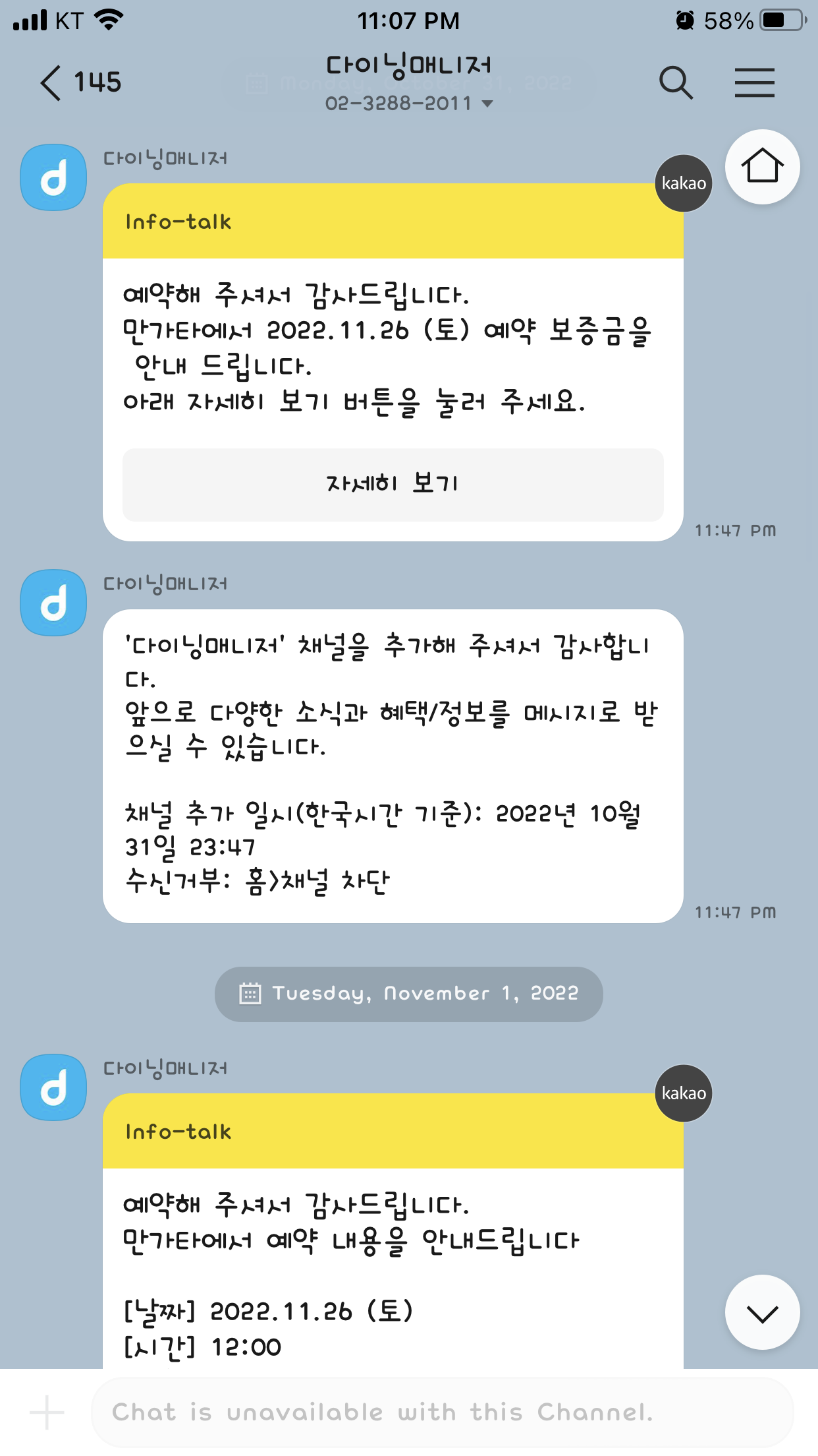예약은 네이버 예약1)을 통해서 할 수 있고, 다소 특이한 점은 예약금 지불을 위한 링크가 카카오톡으로 따로 전송된다는 점이다. 그러니까 예약을 오늘 한다고 하면 1~2일 후에 예약했다는 것을 만가타에서 확인하고 약 3일차 쯤에 예약금 관련된 안내가 카카오톡으로 전송된다. 다이닝메니저라는 이름으로 오는데 그 안에 입금 정보 등등이 포함돼서 온다. 노쇼를 방지하기 위한 만가타 측 정책인가 부다.