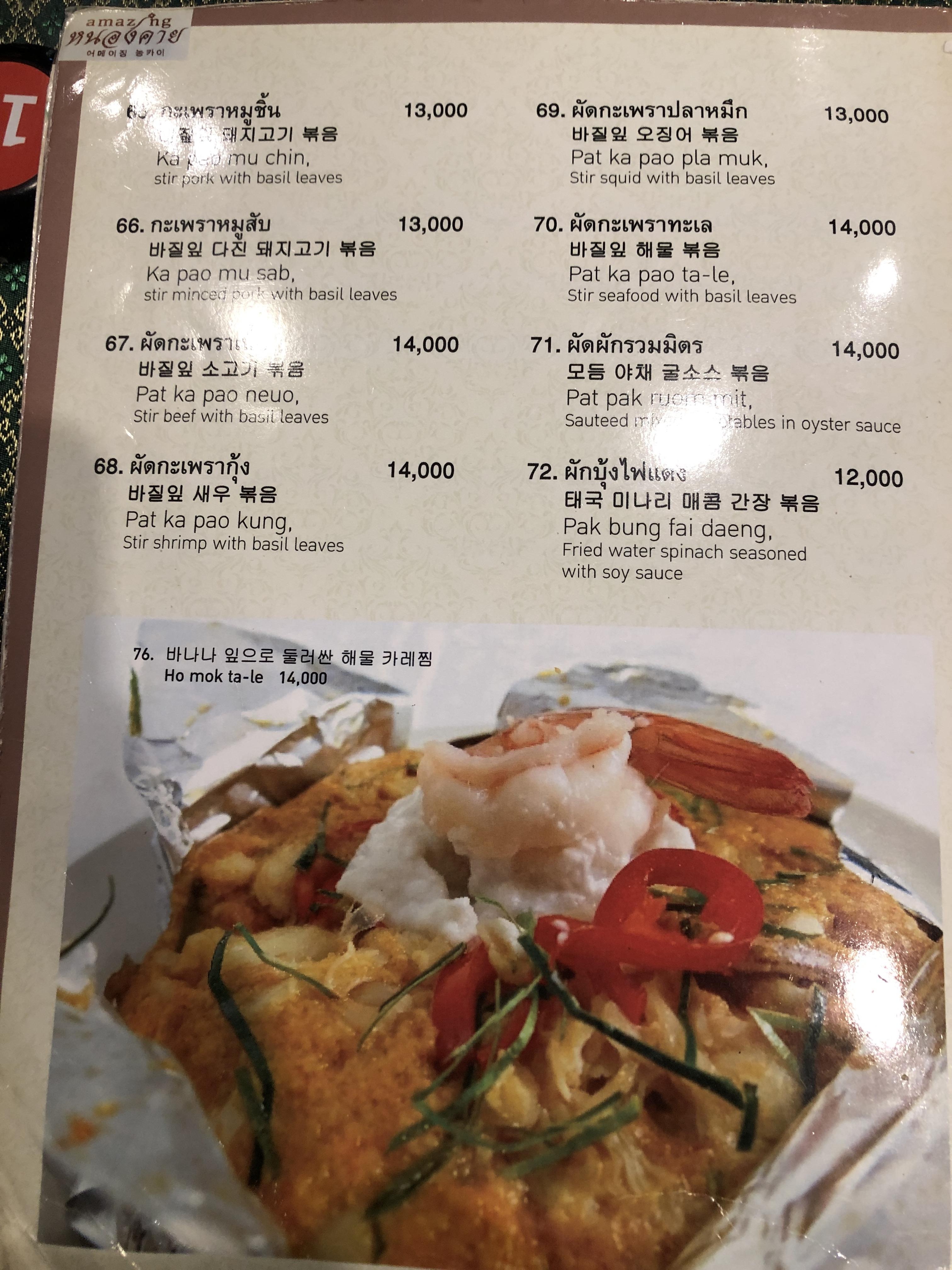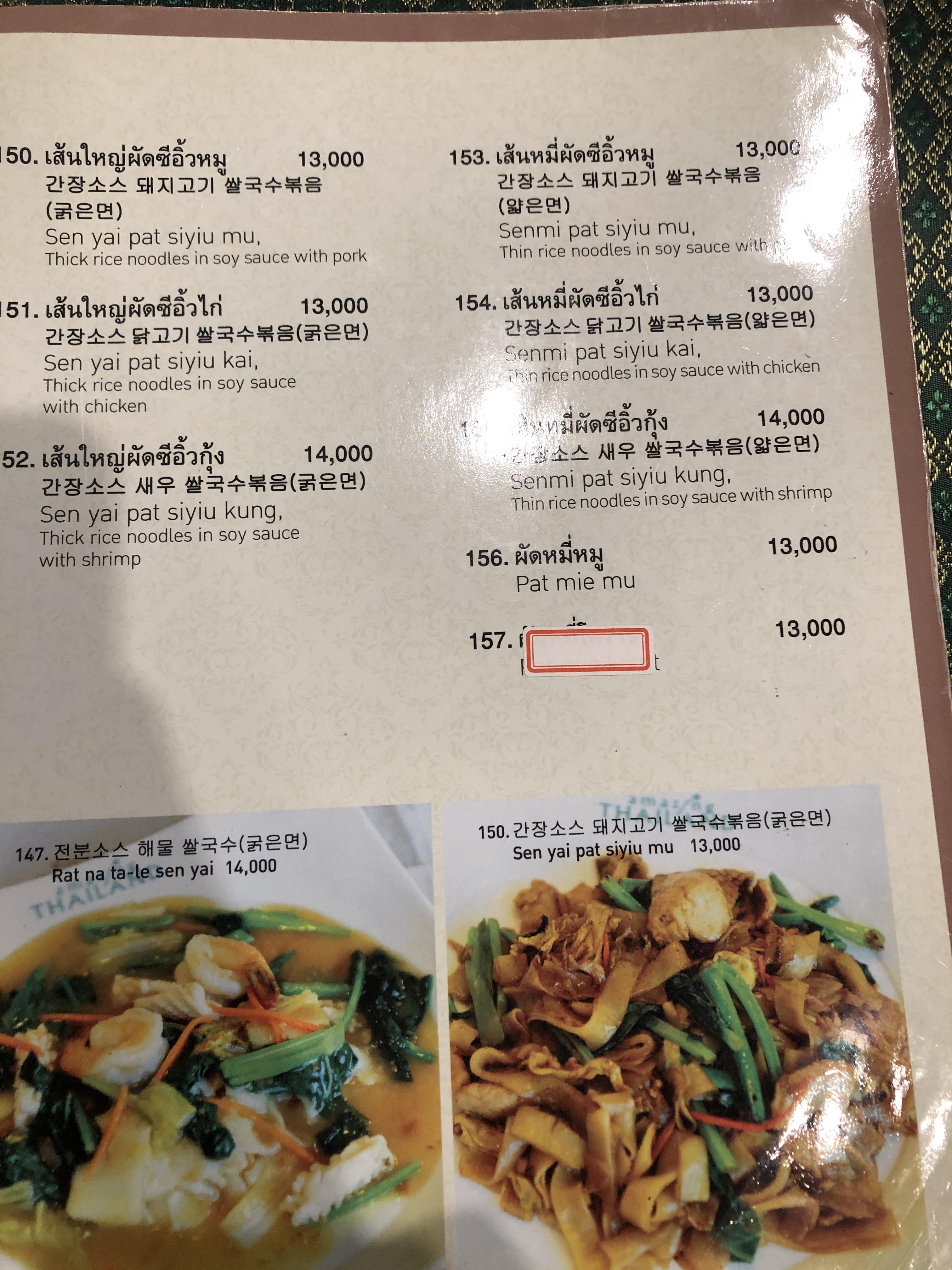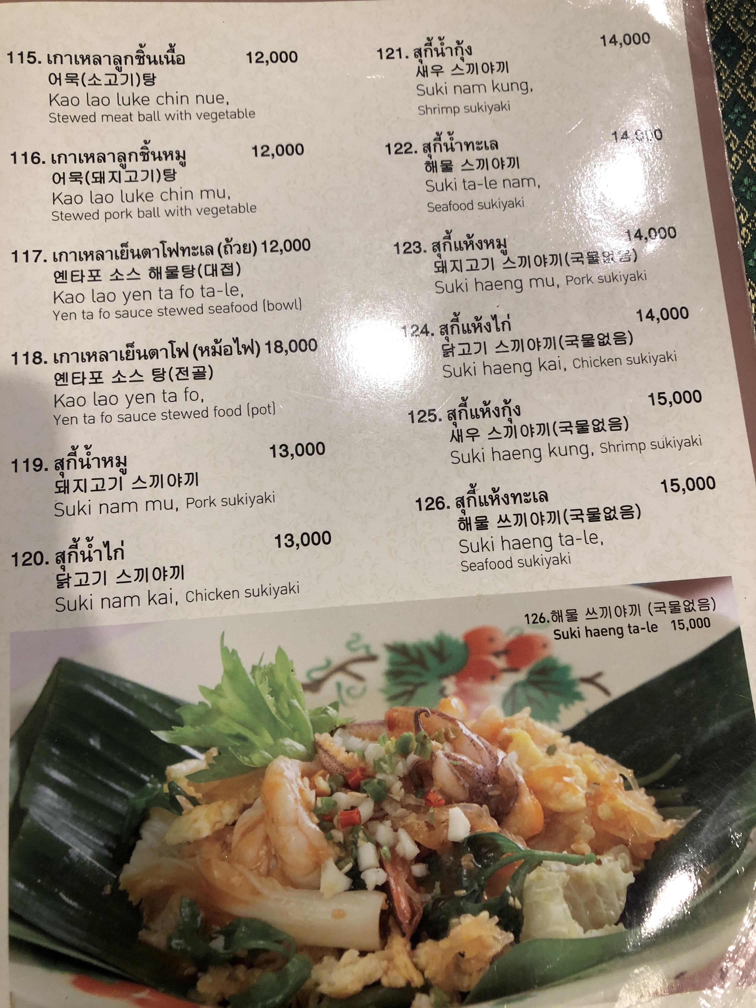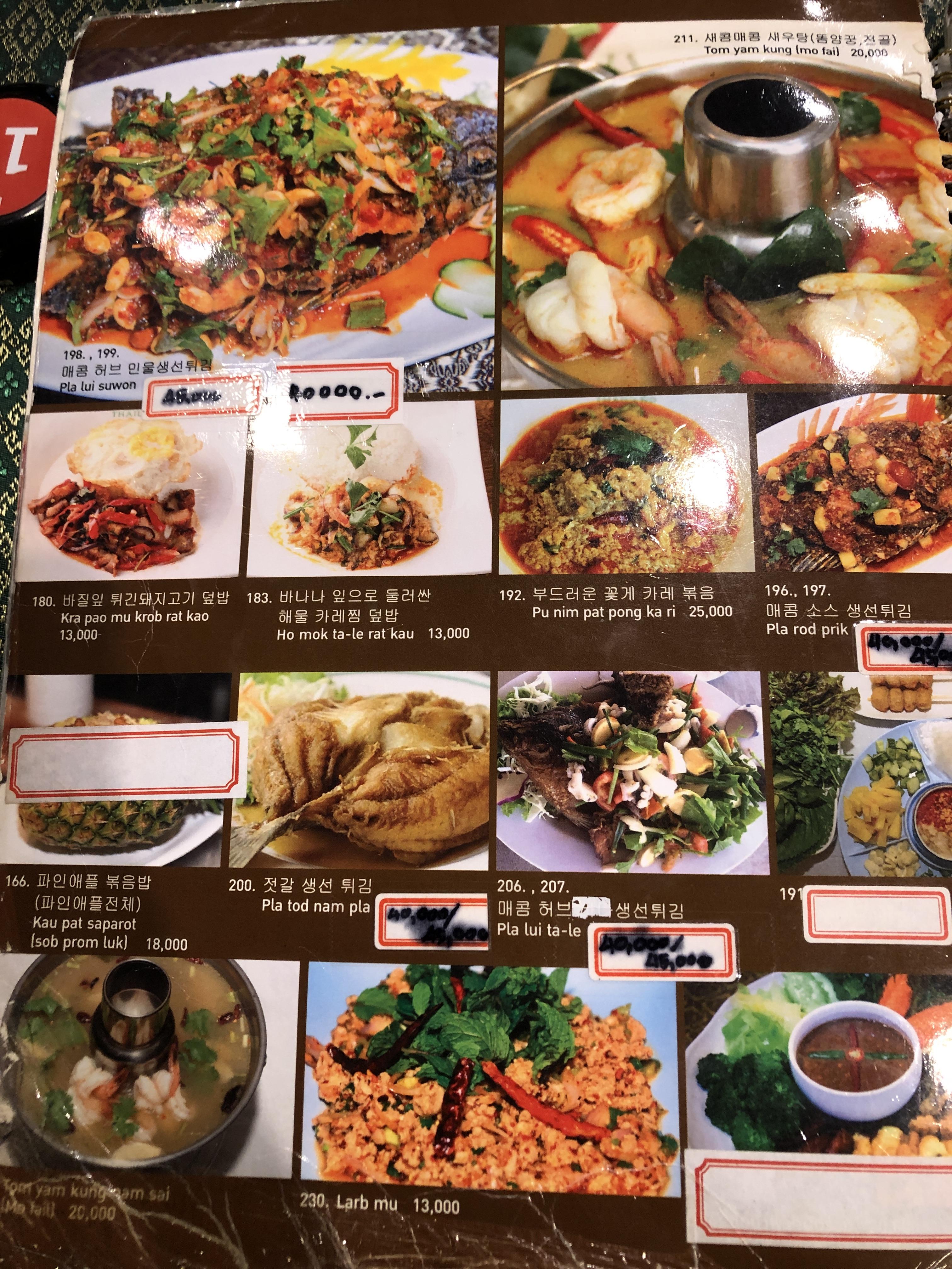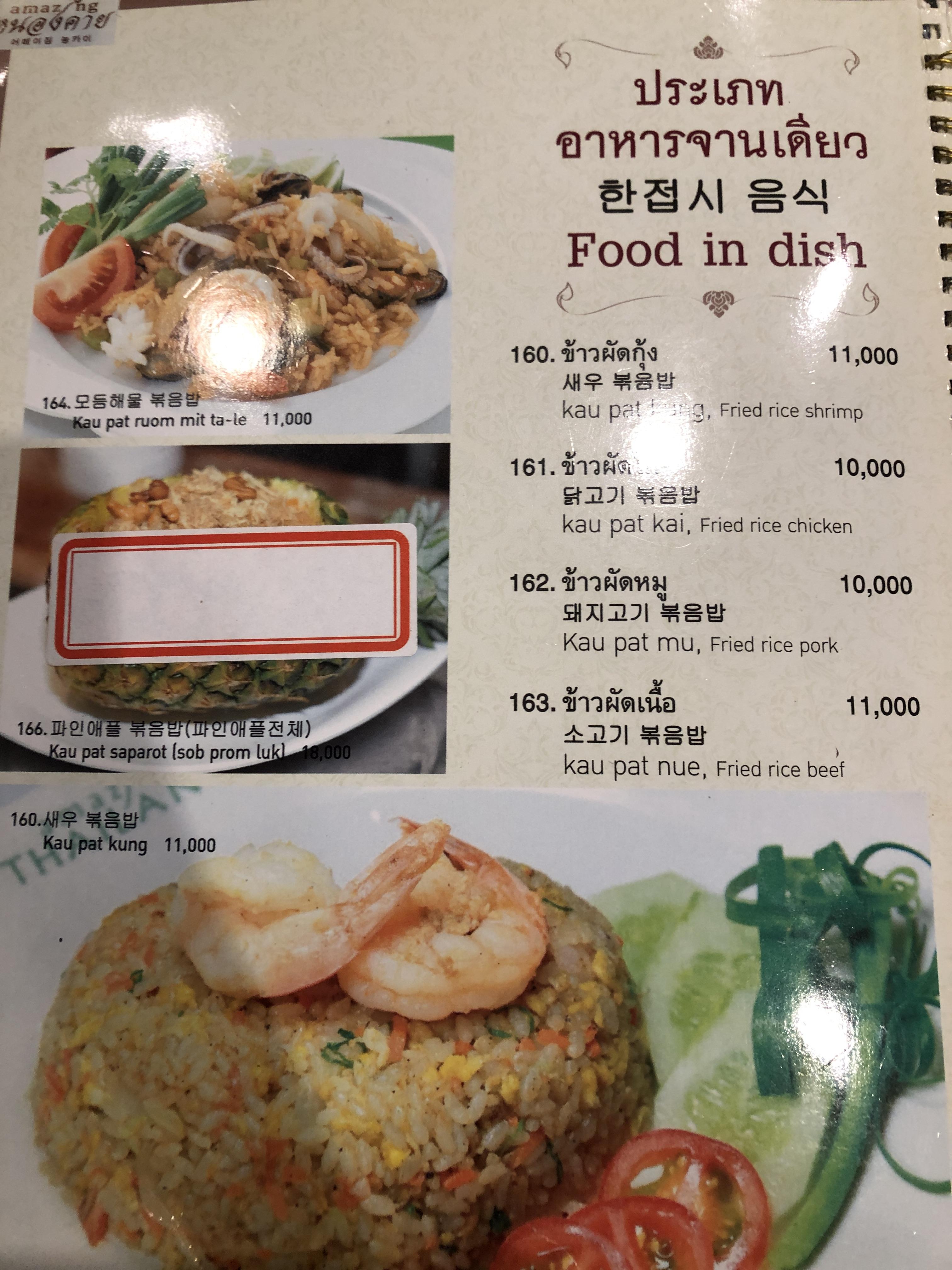 메뉴가 어마어마하게 많다… 앞에 몇페이지가 추천 메뉴인 것같다. 우리는 똠냥꿍, 쏨땀, 파인애플 볶음밥을 시켰다. 쏨땀은 메뉴판에 다른 이름으로 적혀있어서 종업원께 직접 얘기를 드려야 했다. 똠냥꿍이 적혀있던 페이지를 누락한 것 같다. 큰사이즈와 작은사이즈 똠냥꿍을 파는데 210번이 작은 사이즈 똠냥꿍이었던 것으로 기억한다.