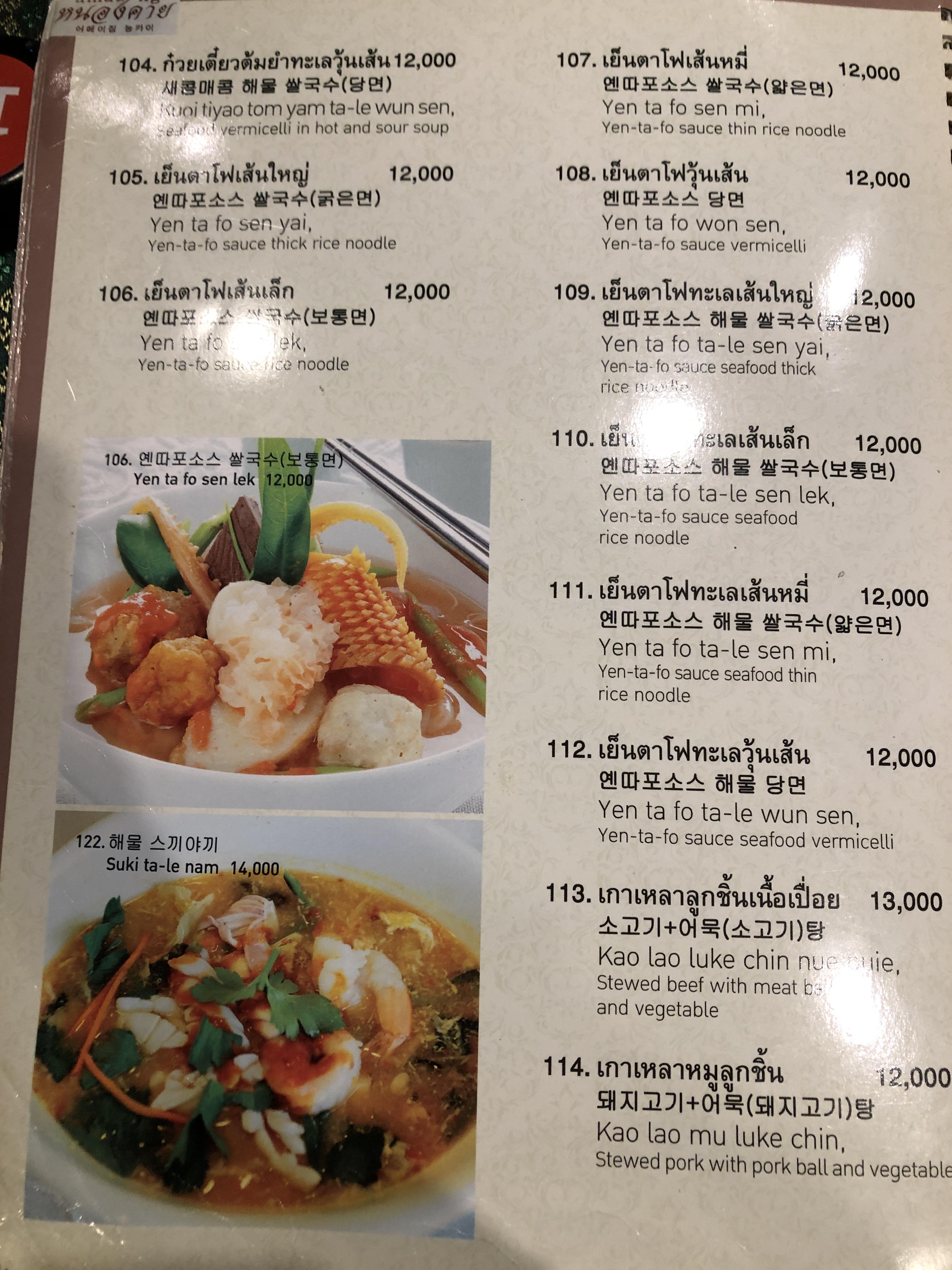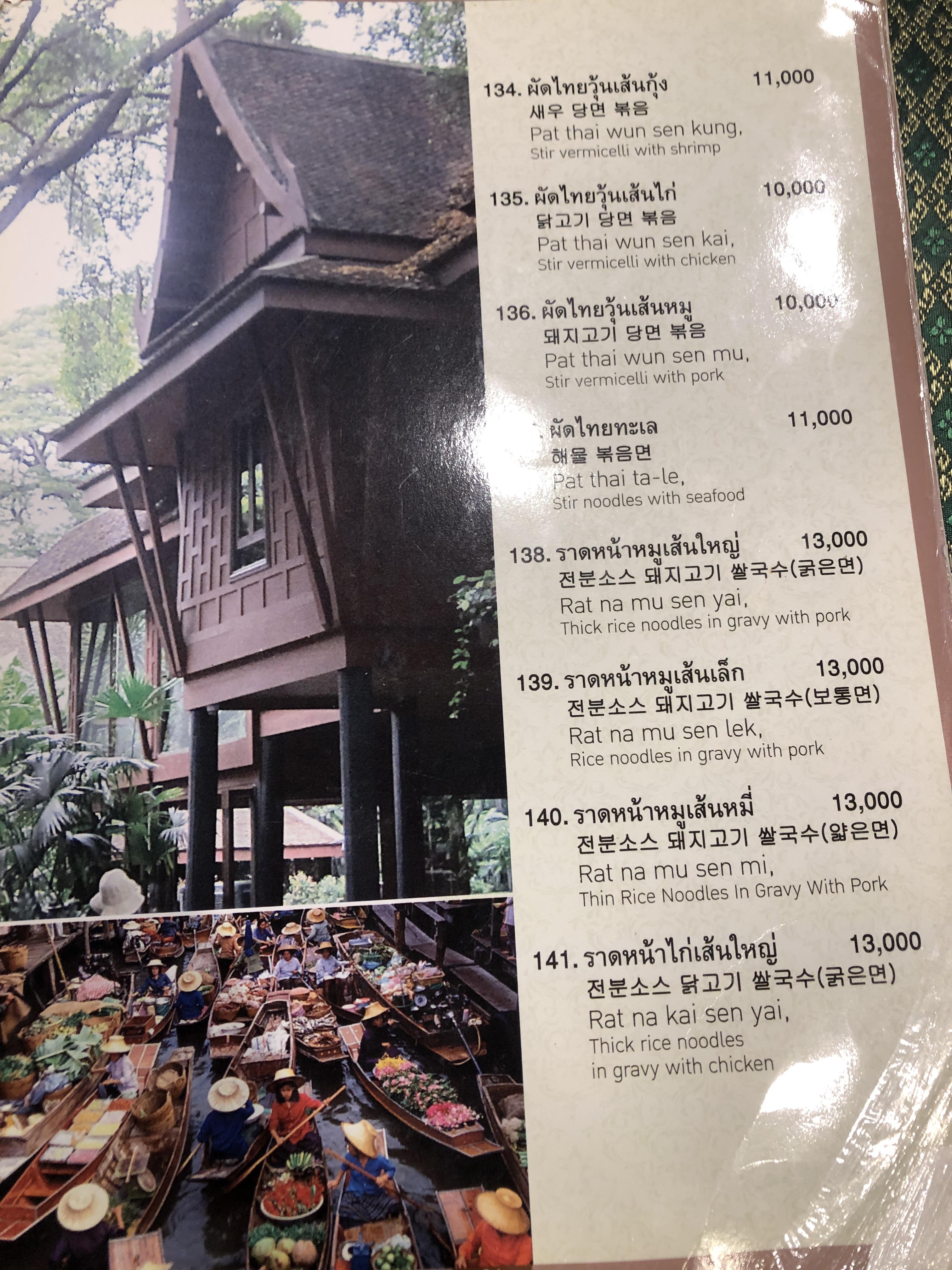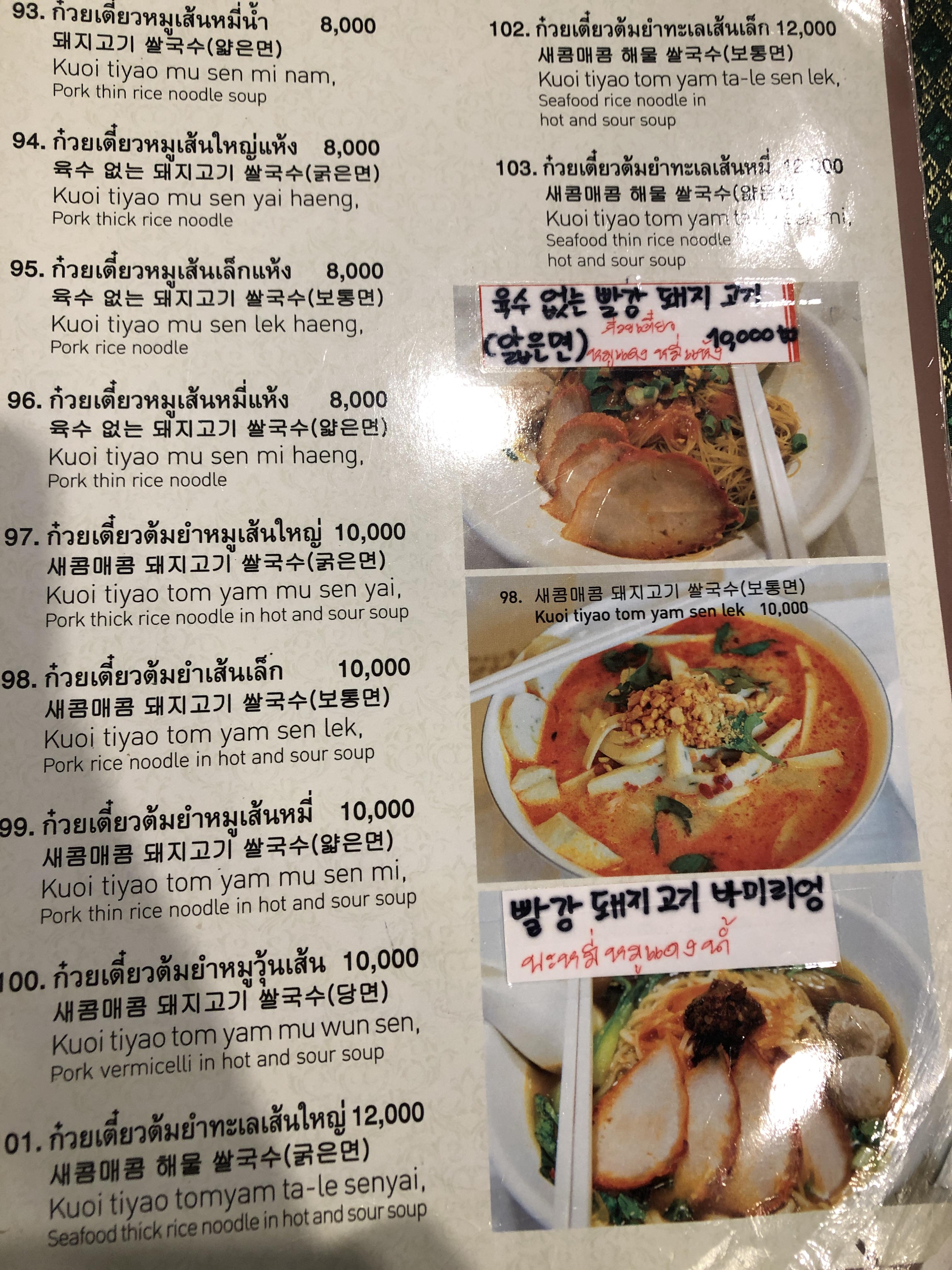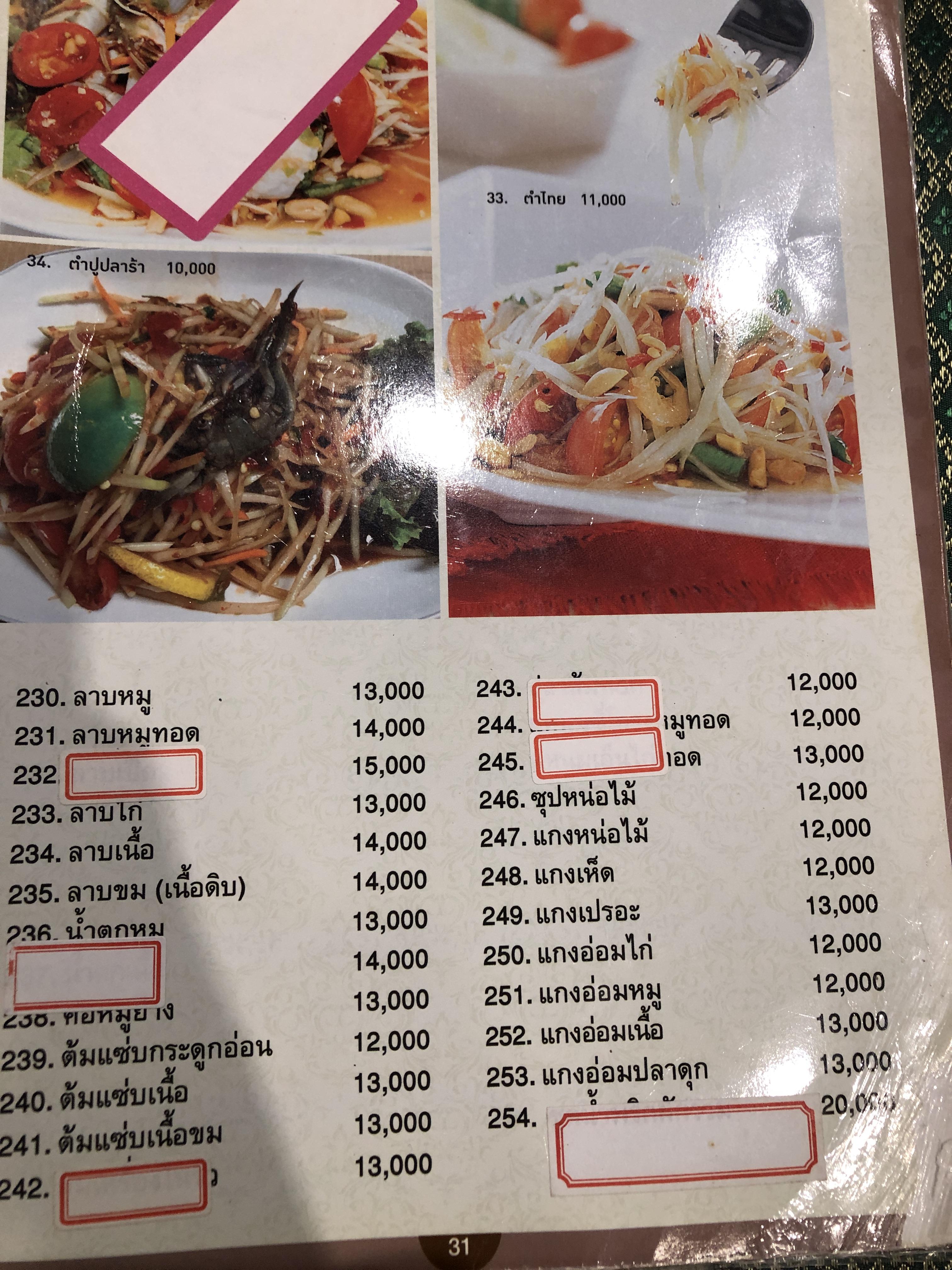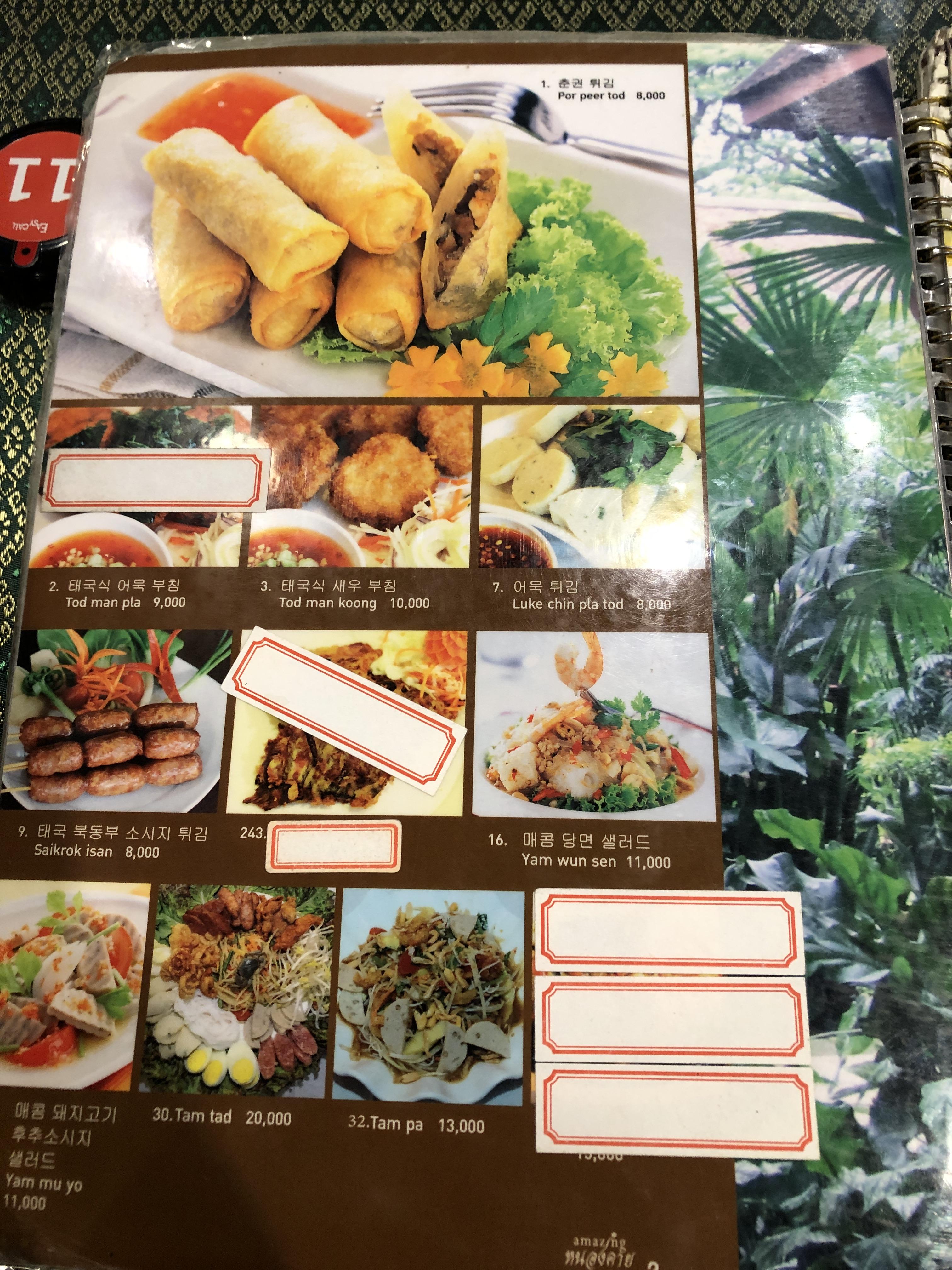 메뉴가 어마어마하게 많다… 앞에 몇페이지가 추천 메뉴인 것같다. 우리는 똠냥꿍, 쏨땀, 파인애플 볶음밥을 시켰다. 쏨땀은 메뉴판에 다른 이름으로 적혀있어서 종업원께 직접 얘기를 드려야 했다. 똠냥꿍이 적혀있던 페이지를 누락한 것 같다. 큰사이즈와 작은사이즈 똠냥꿍을 파는데 210번이 작은 사이즈 똠냥꿍이었던 것으로 기억한다.