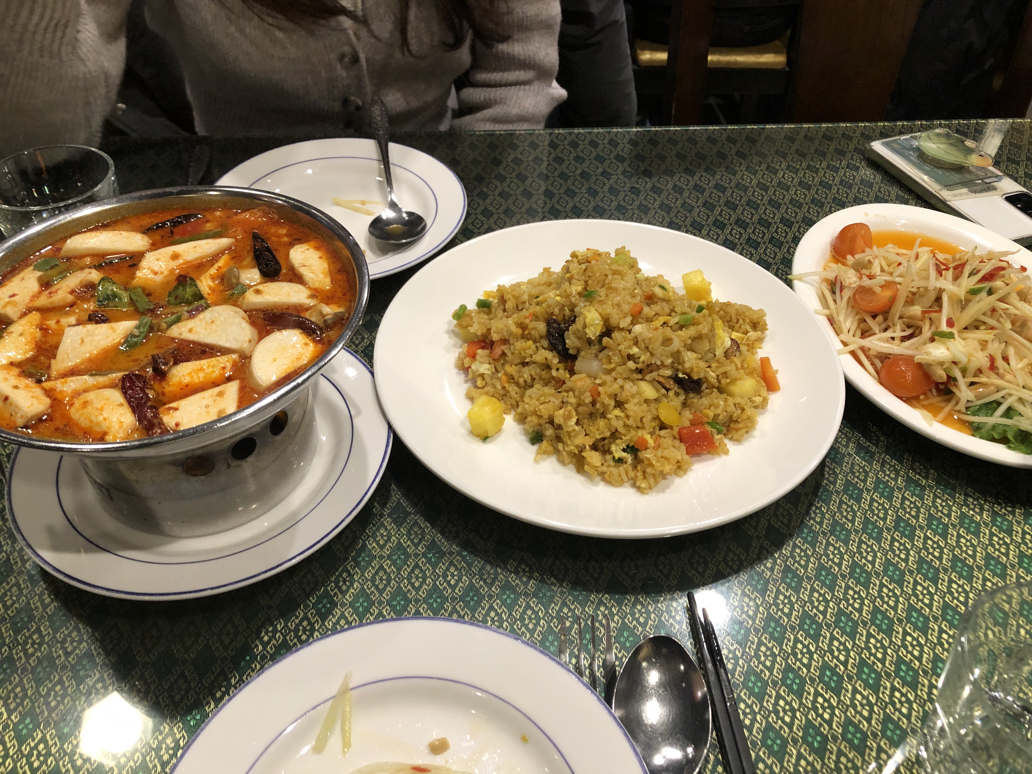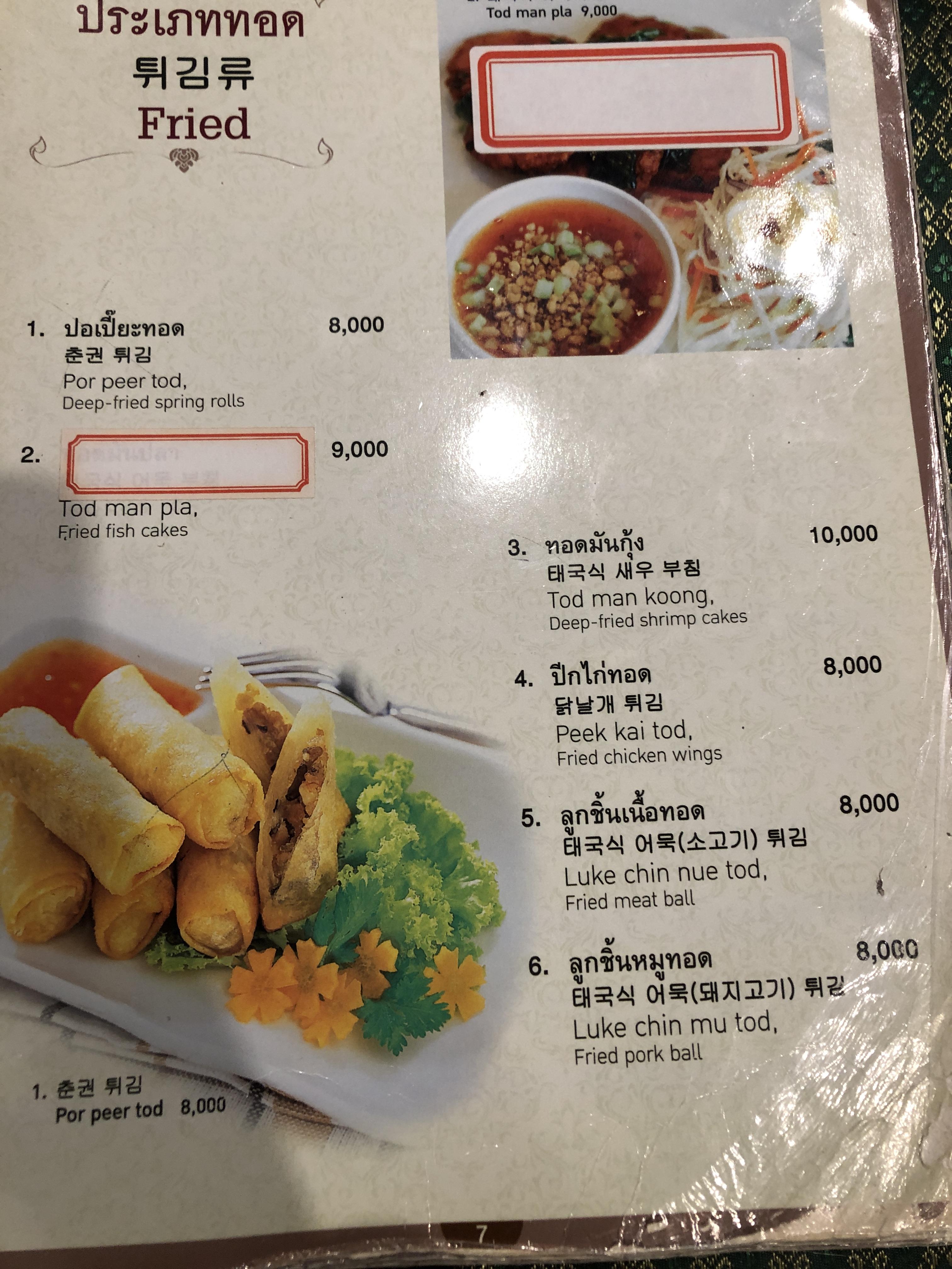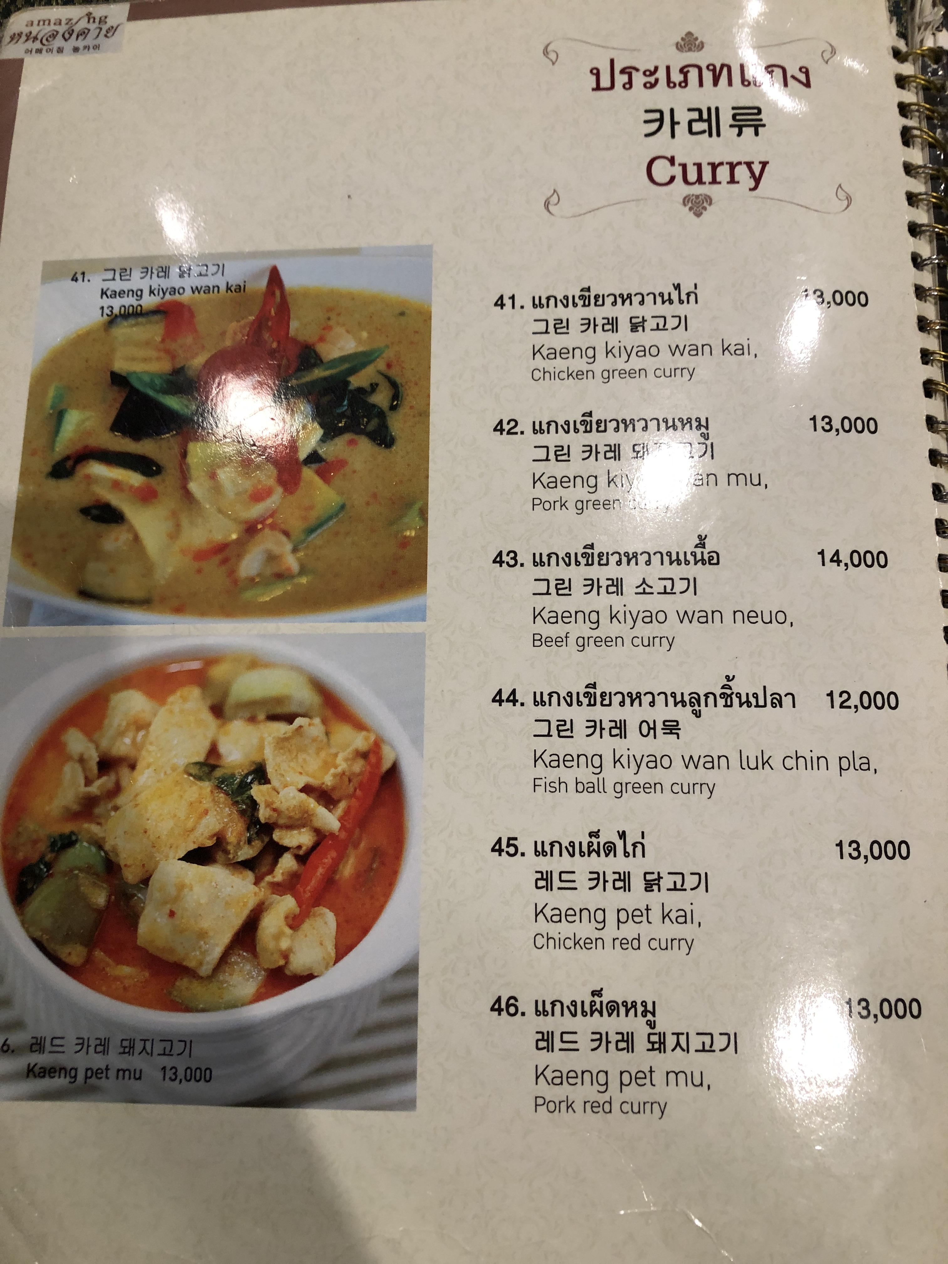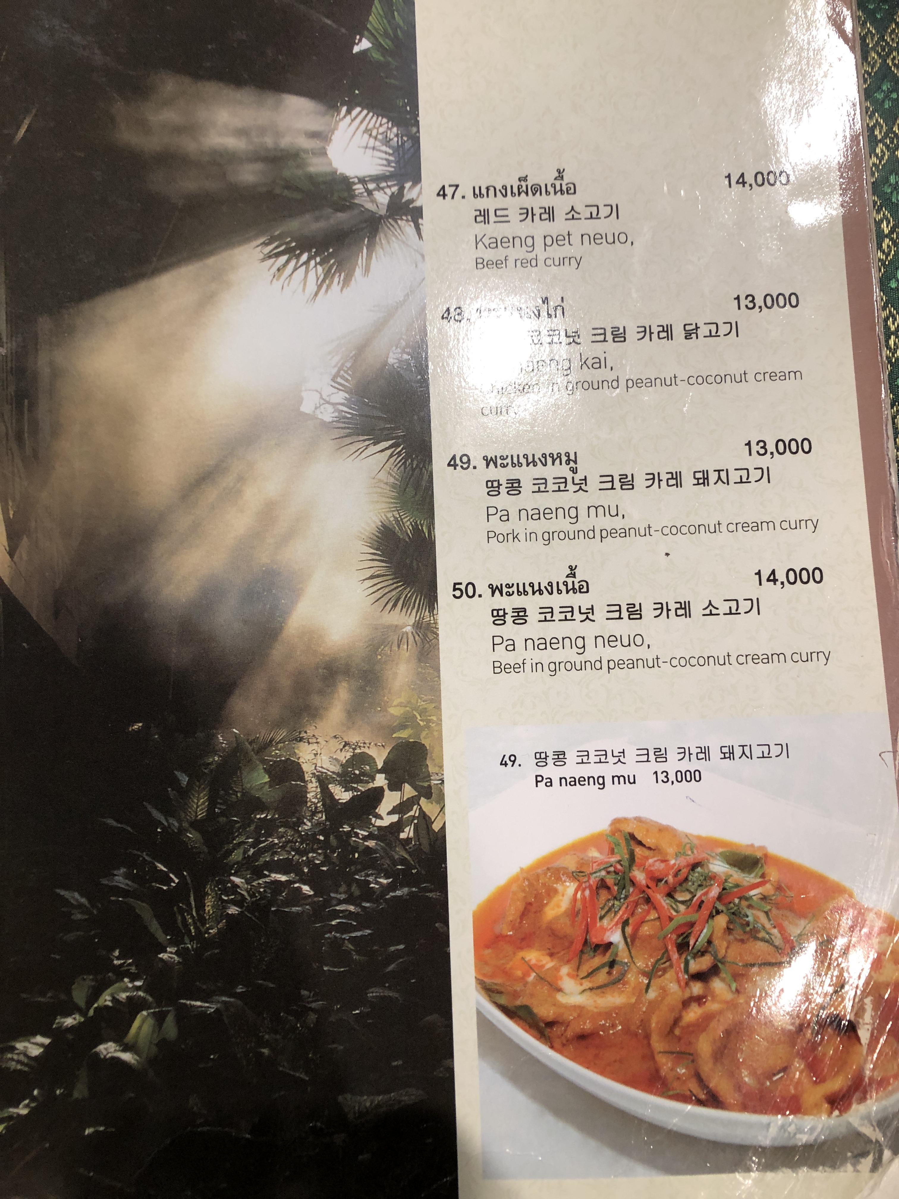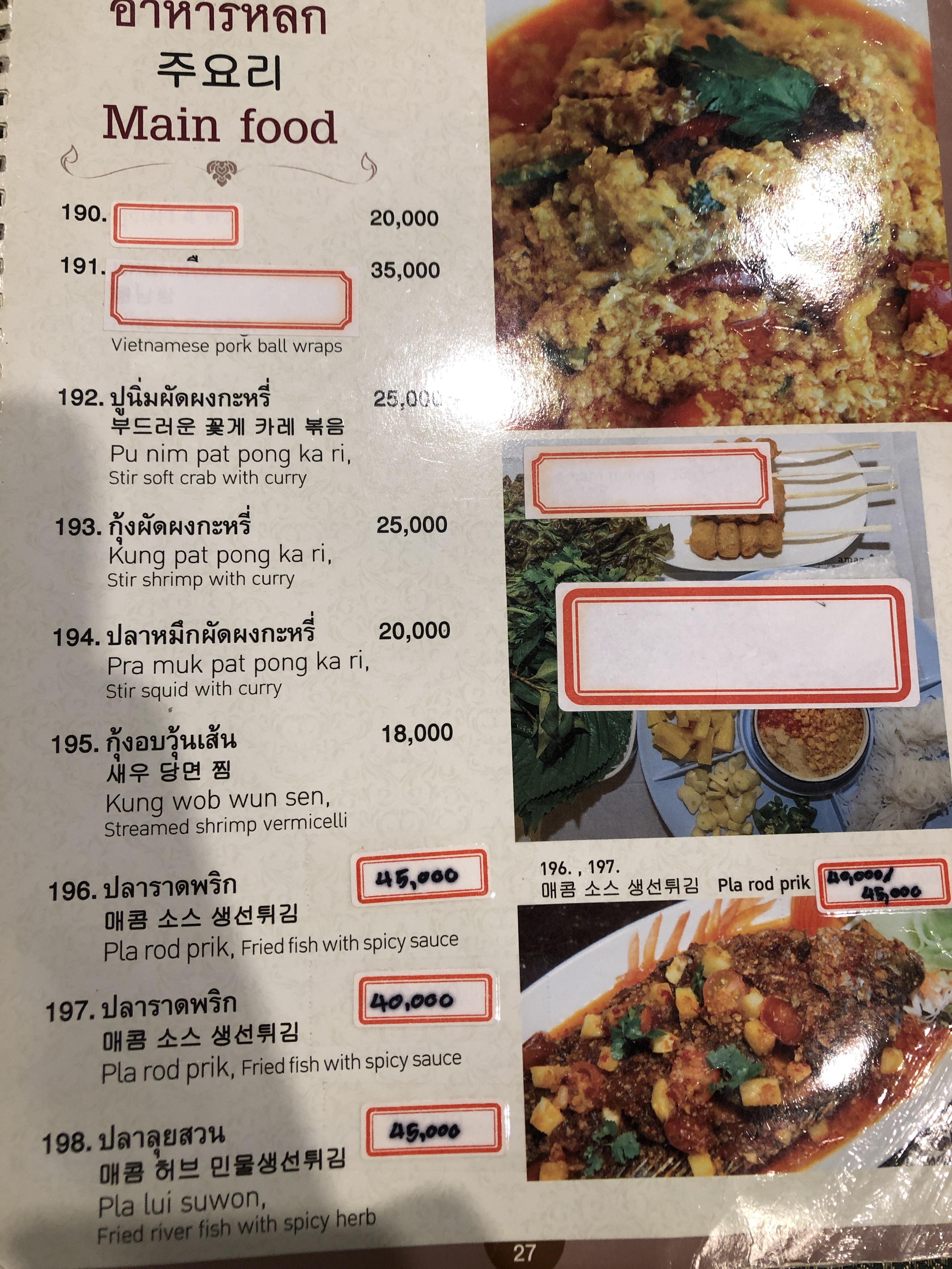 메뉴가 어마어마하게 많다… 앞에 몇페이지가 추천 메뉴인 것같다. 우리는 똠냥꿍, 쏨땀, 파인애플 볶음밥을 시켰다. 쏨땀은 메뉴판에 다른 이름으로 적혀있어서 종업원께 직접 얘기를 드려야 했다. 똠냥꿍이 적혀있던 페이지를 누락한 것 같다. 큰사이즈와 작은사이즈 똠냥꿍을 파는데 210번이 작은 사이즈 똠냥꿍이었던 것으로 기억한다.