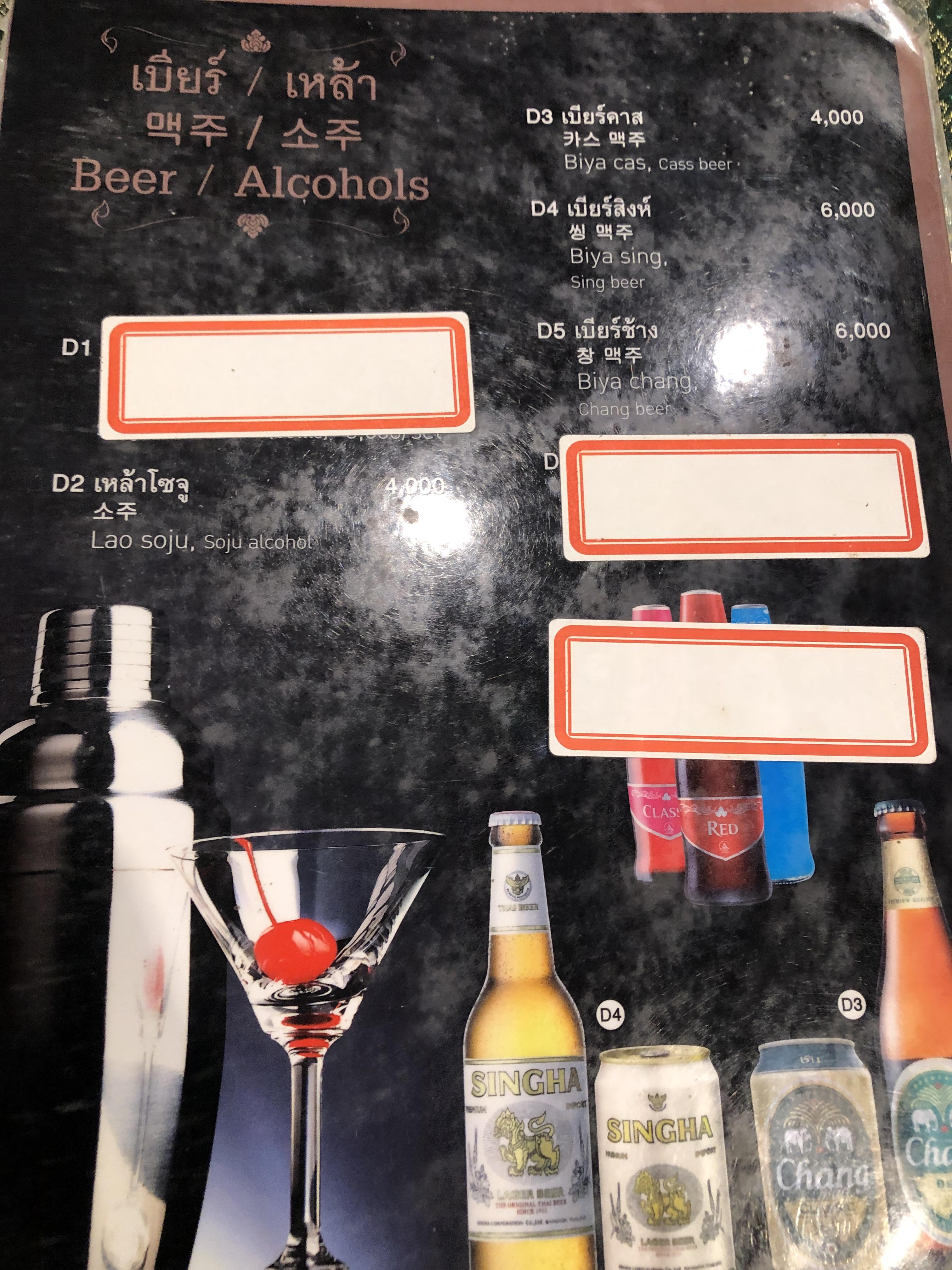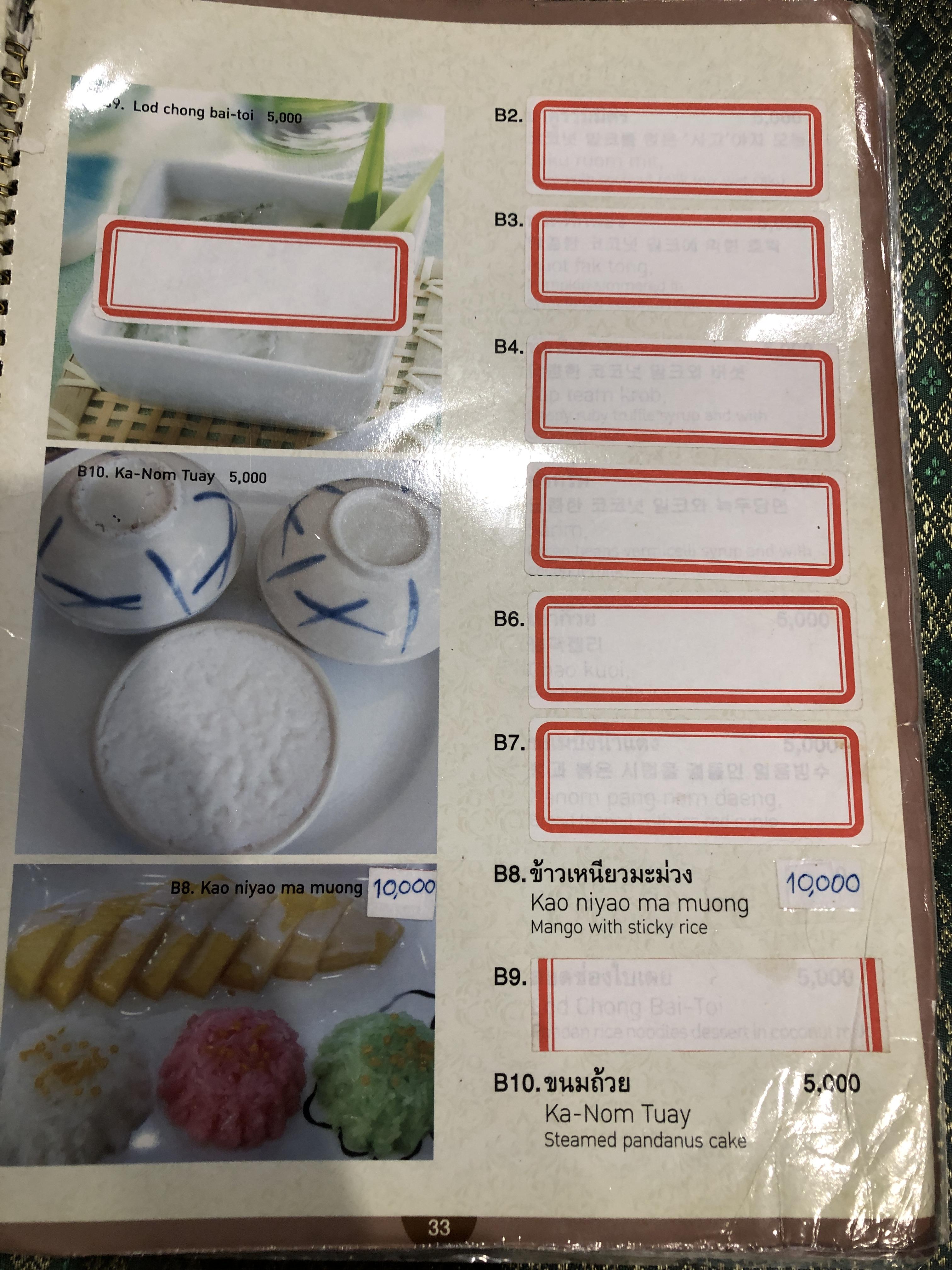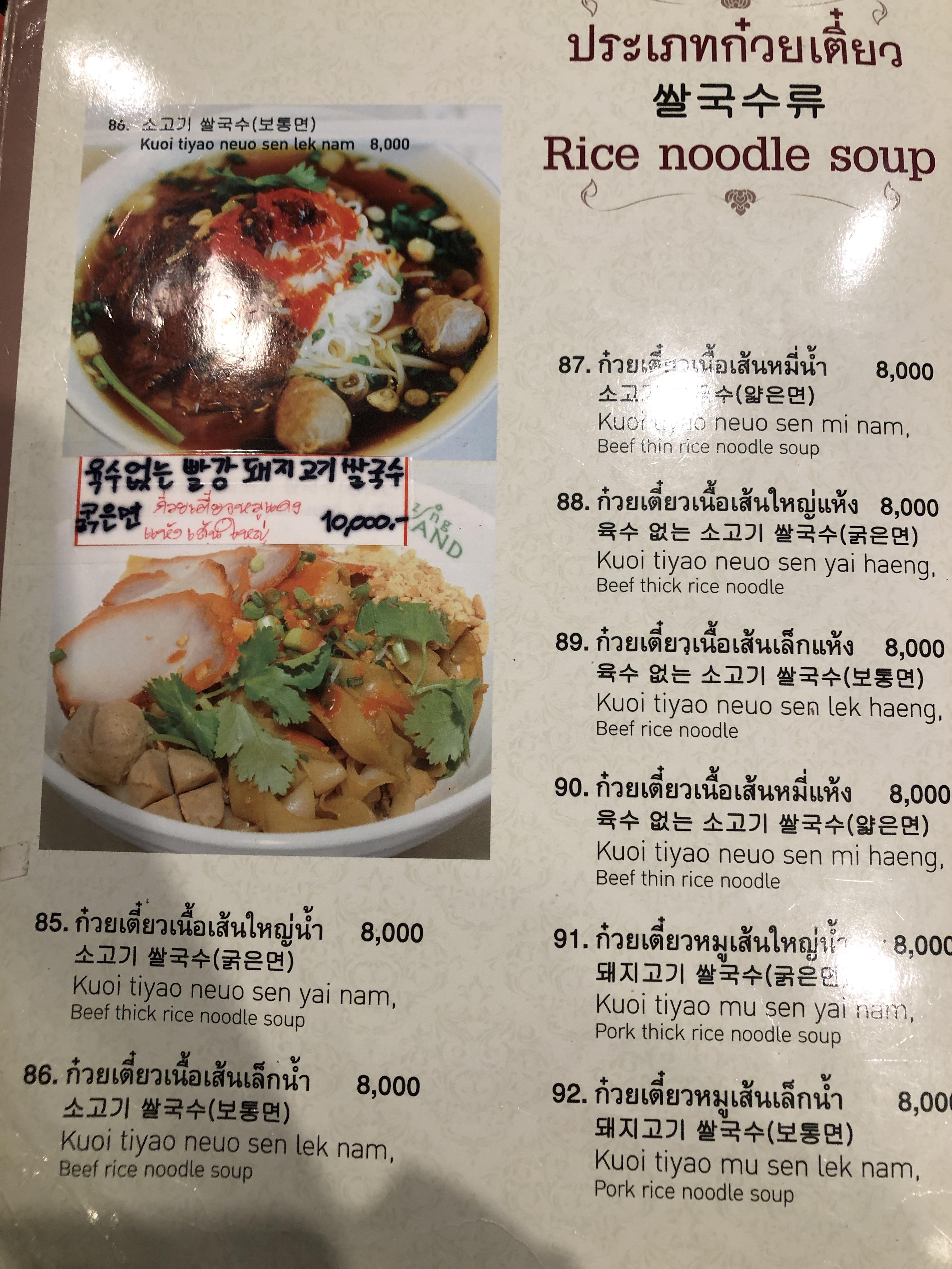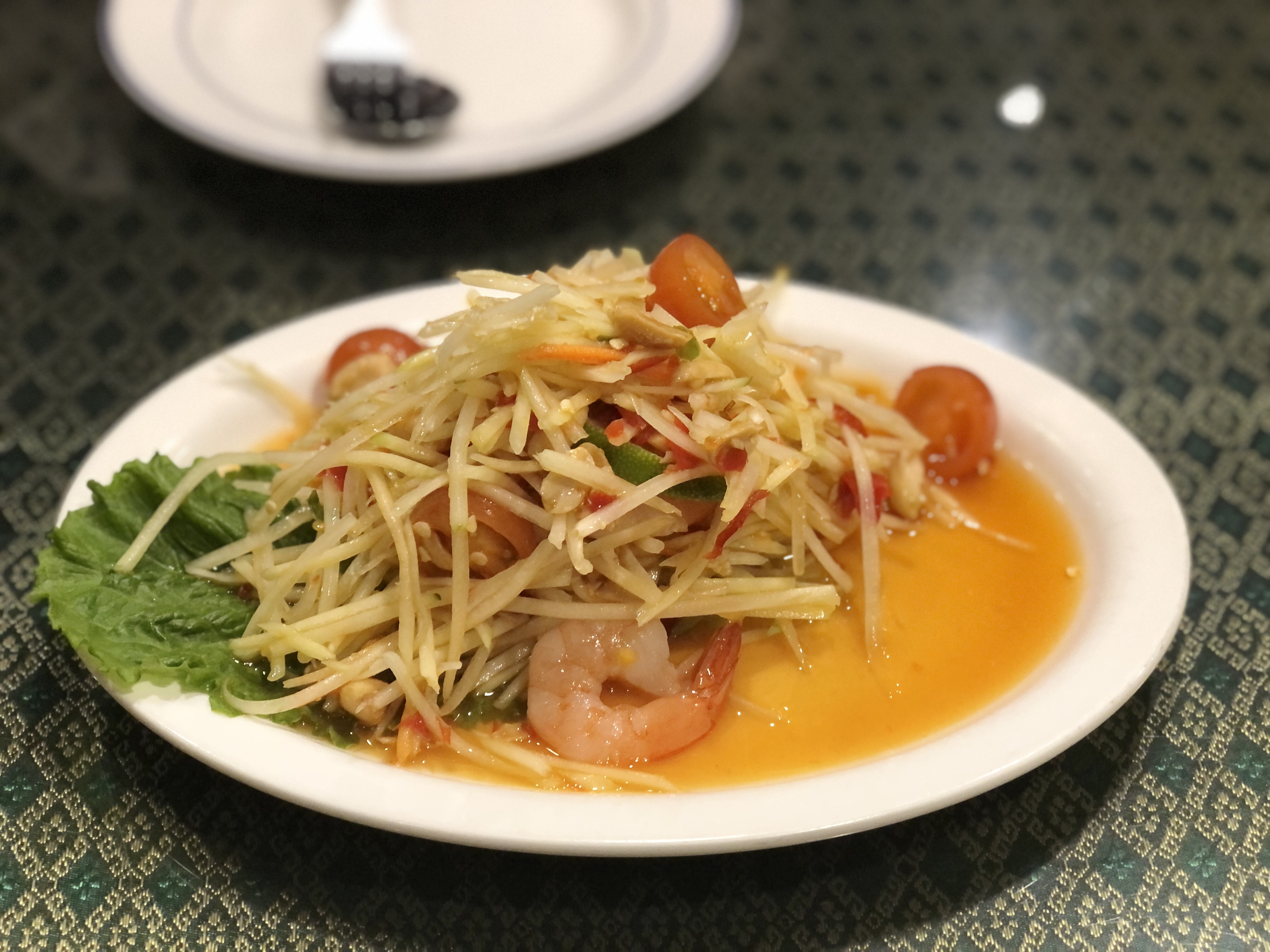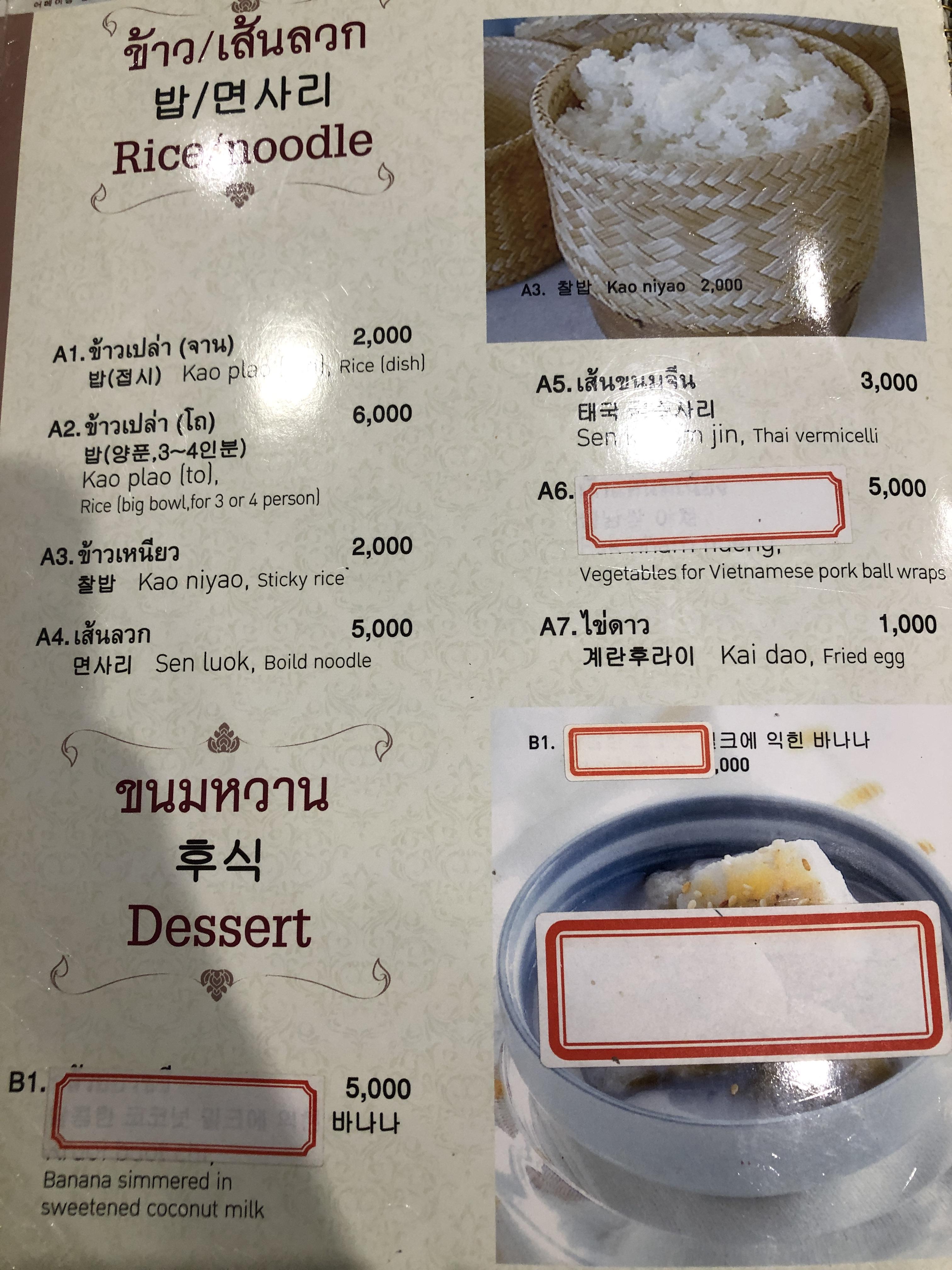 메뉴가 어마어마하게 많다… 앞에 몇페이지가 추천 메뉴인 것같다. 우리는 똠냥꿍, 쏨땀, 파인애플 볶음밥을 시켰다. 쏨땀은 메뉴판에 다른 이름으로 적혀있어서 종업원께 직접 얘기를 드려야 했다. 똠냥꿍이 적혀있던 페이지를 누락한 것 같다. 큰사이즈와 작은사이즈 똠냥꿍을 파는데 210번이 작은 사이즈 똠냥꿍이었던 것으로 기억한다.