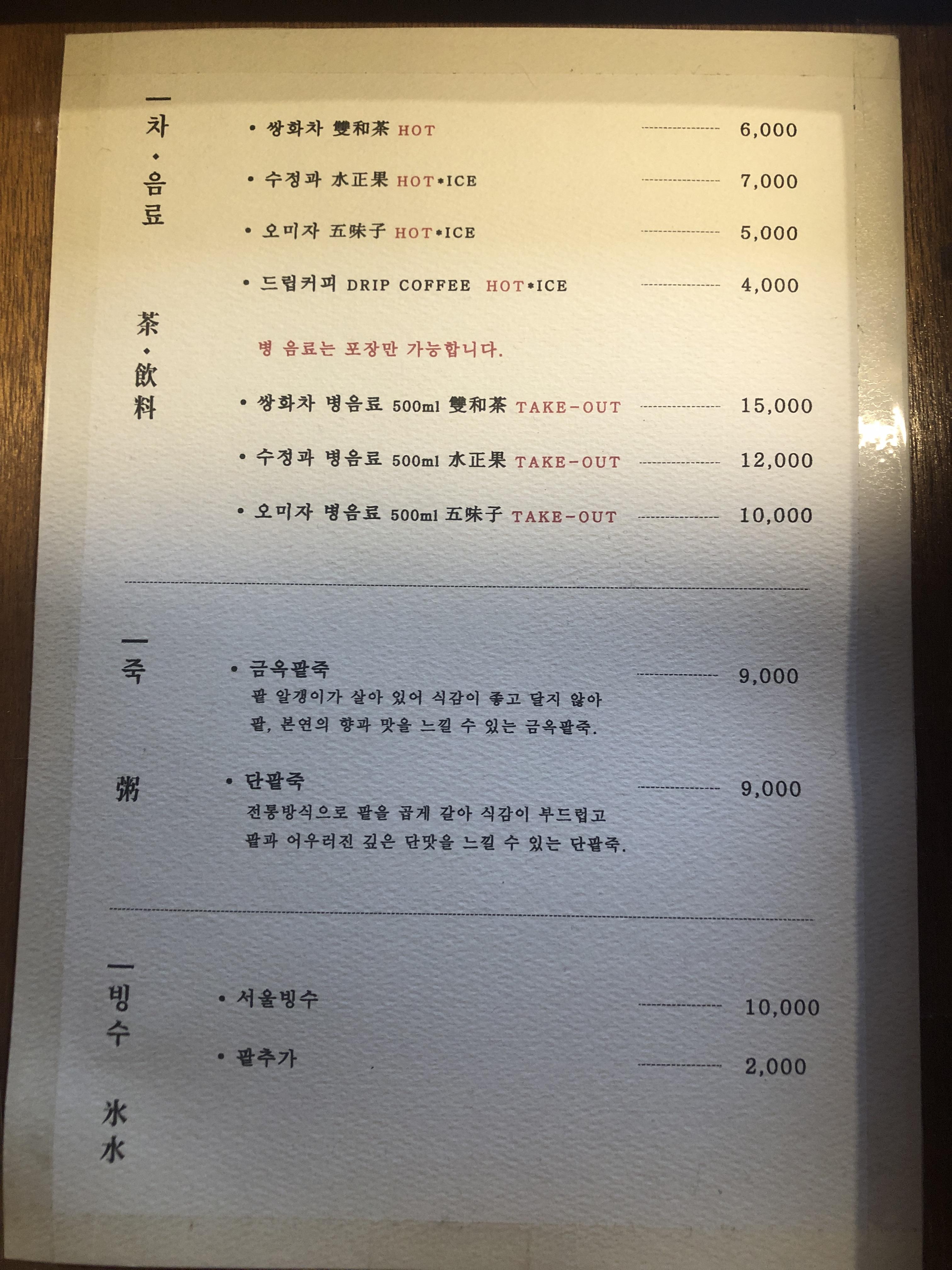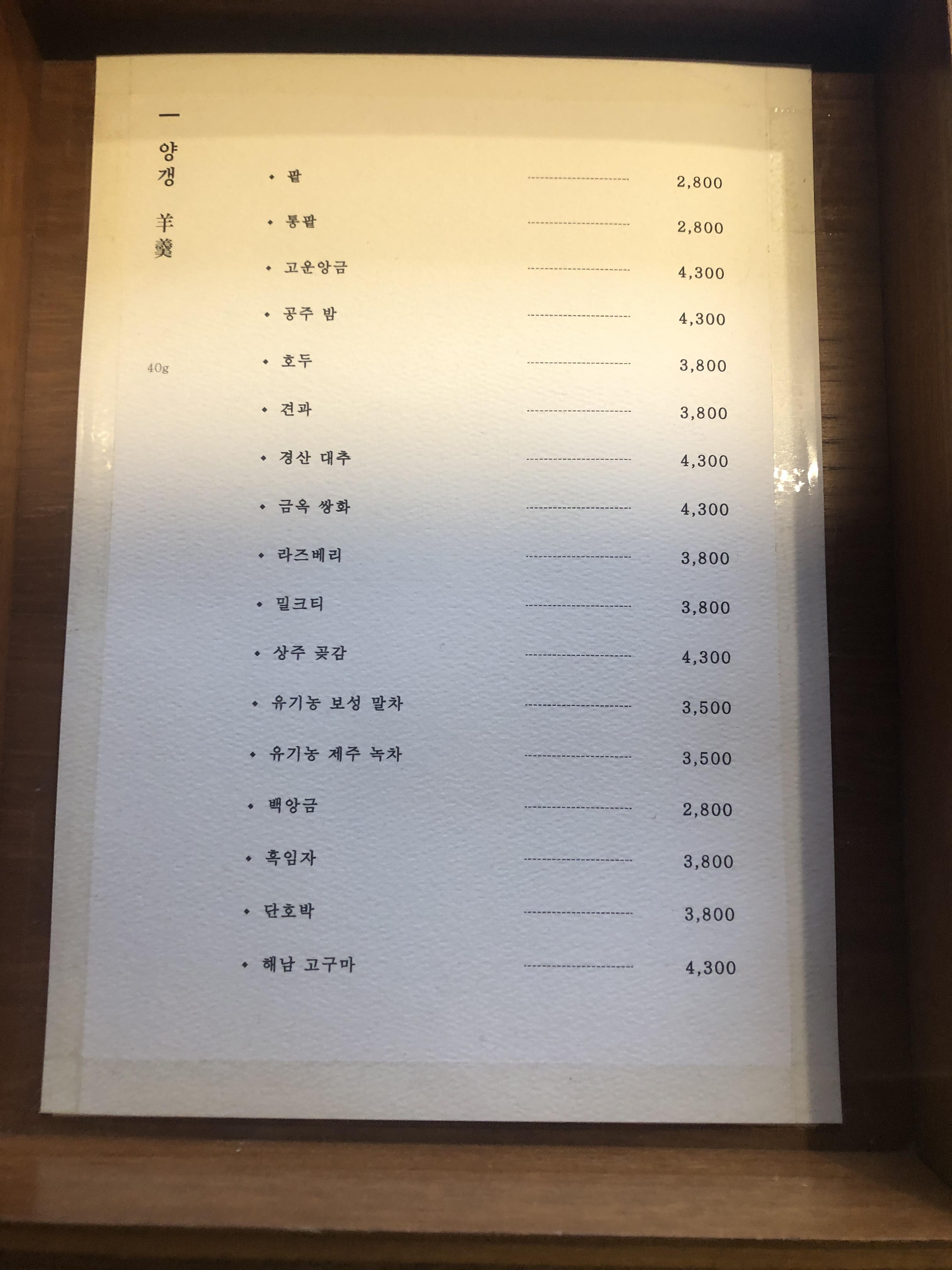 메뉴는 크게 양갱, 빙수, 죽, 빙수로 나눠 볼 수 있다. 매번 양갱만 포장해가는 탓에 다른 메뉴를 맛보진 못했다. 앞서 언급했듯, 수제양갱이기 때문에 포장해간다면 몇시간내에 냉장 보관을 해야한다. 여름에 갔을때는 1시간이라도 했던거 같은데, 지금 겨울에 가니 3시간이라고 말씀해 주셨다. 다행히 모르고 왔을 분들을 위해 보냉팩도 판매하고 보냉팩 가격은 1,000원이다.
