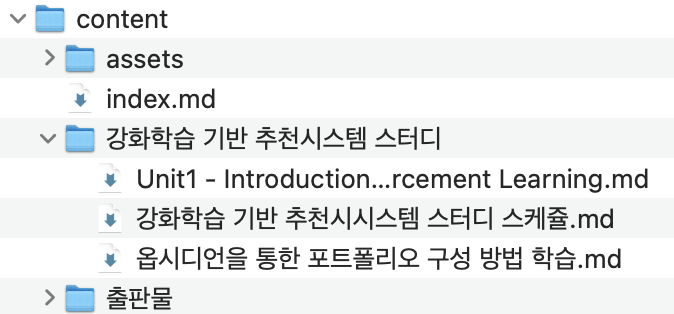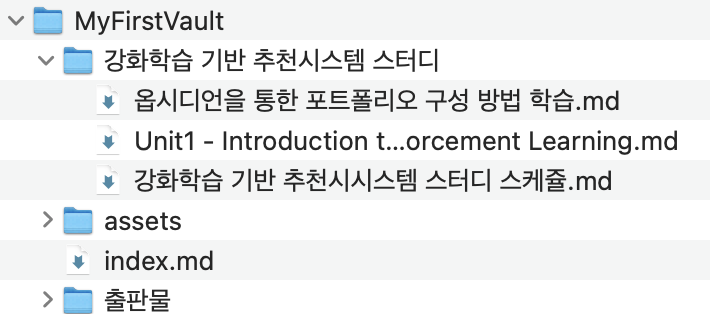 파일 순서가 조금 차이가 있지만 기본적이 내용은 동일함을 볼 수 있다. 이제 내용을 바꿀때마다, iCloud의 Vault 내용물을 quartz에 옮겨주기만 하면 된다. 이런 작업을 항상 수작업으로 할 수 없으니 자동으로 바꿔줘야 한다. 해당 내용은 5 옵시디언 - Quartz4 자동화에서 다룬다