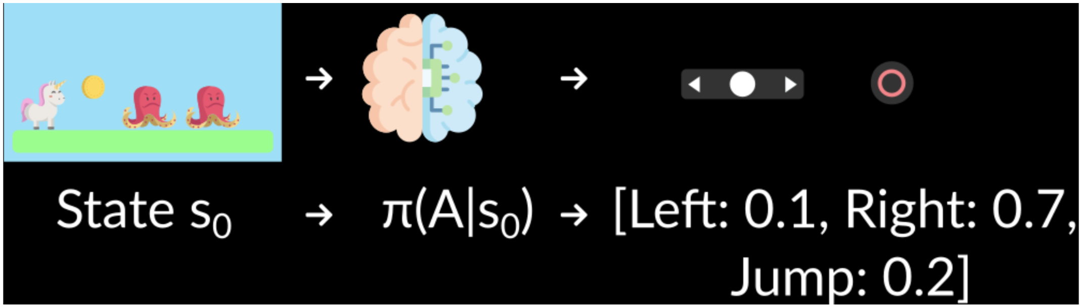 - 각 state에서 최적 액션의 mapping을 정의함. 또는 해당 State에서 취해야 할 행동의 확률 분포를 생성함