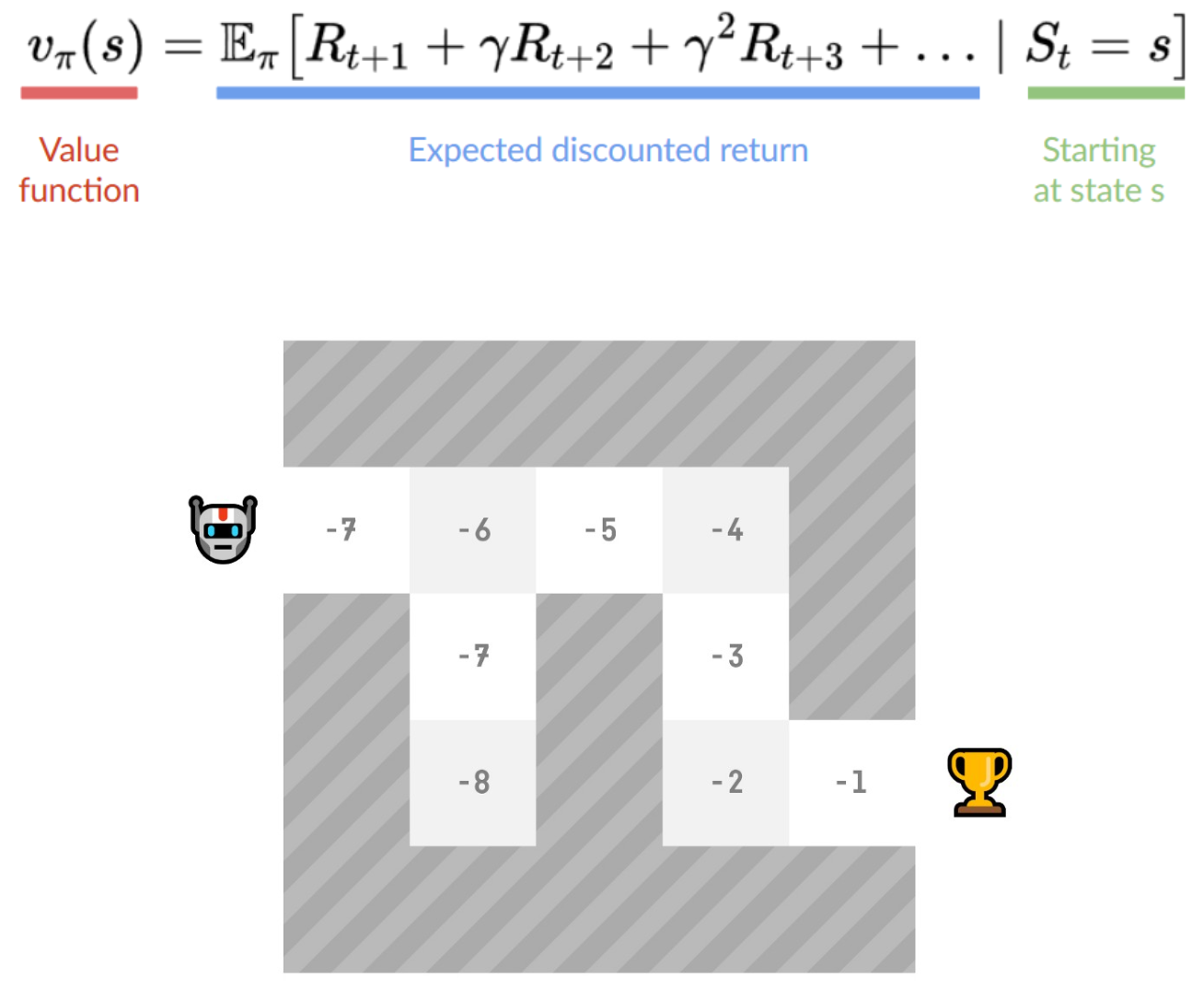 - 어느 한 state에서 시작해, 해당 Policy를 따라갈 때 얻을 수 있는 보상으로 정의함