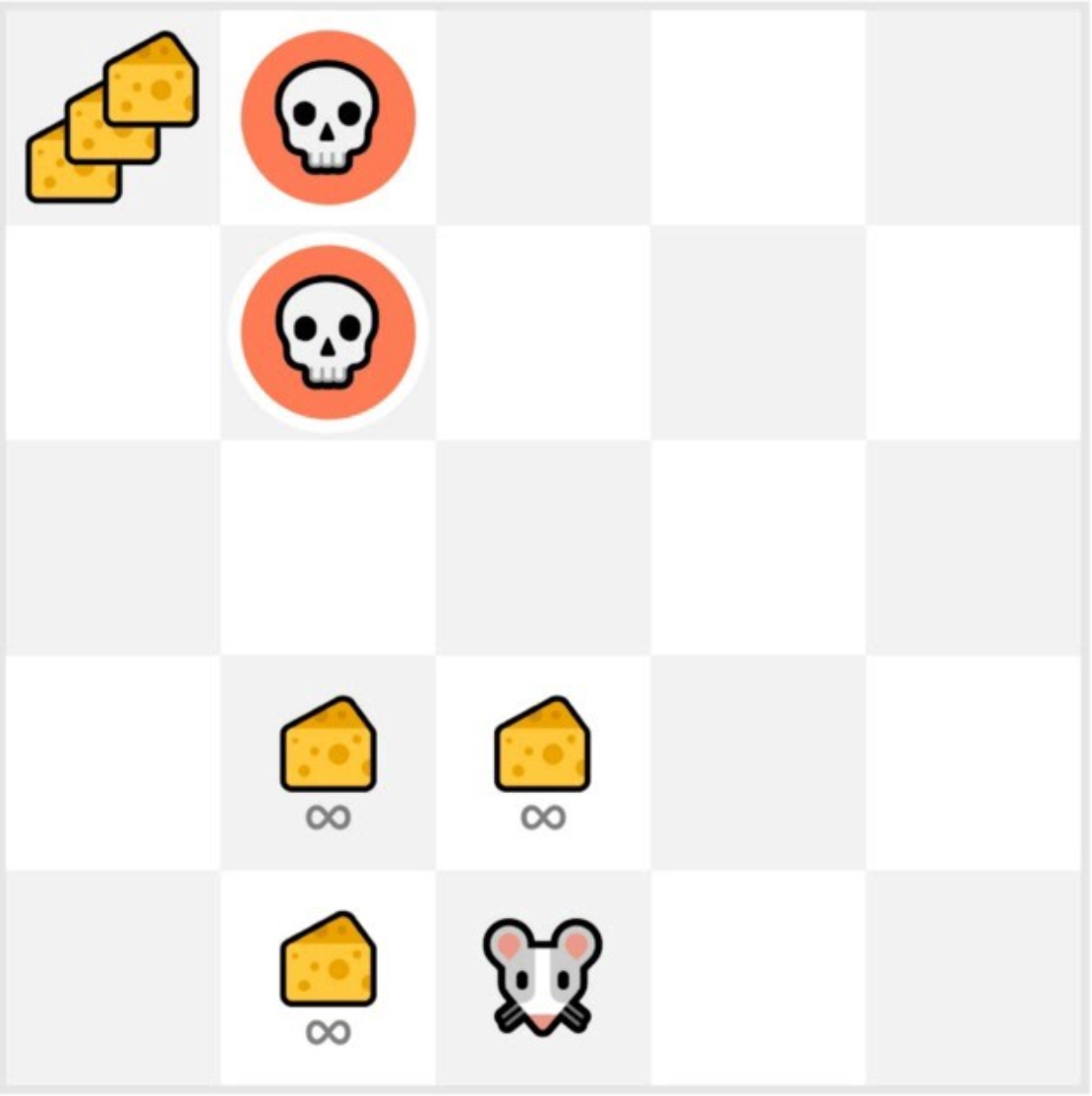 위 그림에서 치즈 1개는 +1의 보상을 뜻하고, 치즈 3개는 +1000의 보상을 뜻한다. 그리고 직관적이게 해골은 사망을 뜻한다.