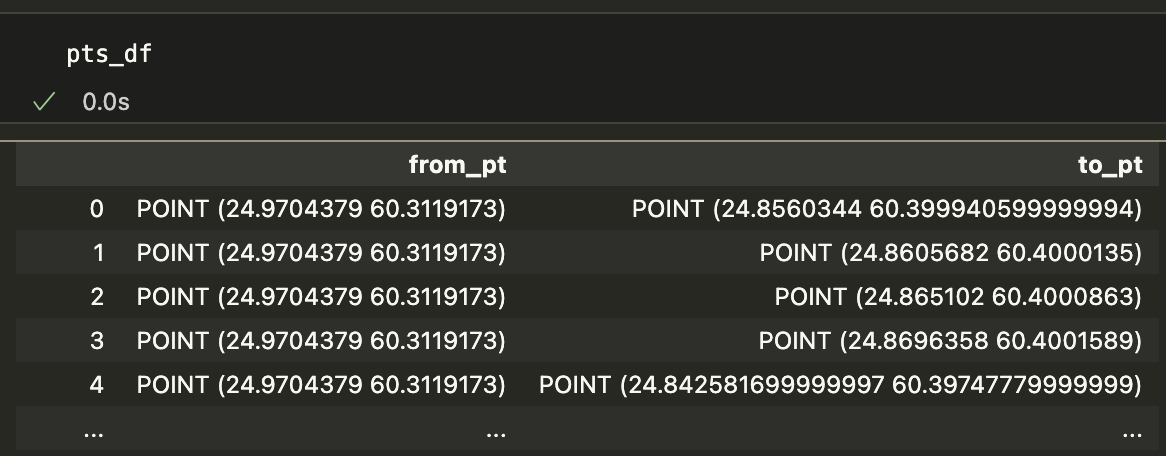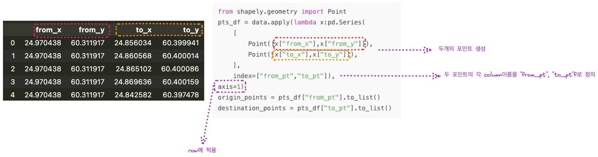 2개의 row로 된 데이터 프레임인 pts_df를 만듭니다. 이를 위해 data라는 데이터 프레임의 각 row(index=1)에 어떤 기능을 apply합니다. 이 기능은 두 개의 포인트를 만들며 첫 번째 포인트는 data의 column 중 "from_x"와 "from_y"를 참조하고 두 번째 포인트는 "to_x"와 "to_y"를 참조합니다. 이렇게 생긴 두 포인트의 column을 "from_pt", "to_pt"라고 정의합니다.