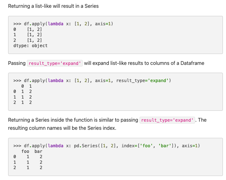 어떤 dataframe이 있을때 각 열에 어떤 기능을 적용시키고 싶다면 위와 같습니다. lambda function을 통해 각 열에 대해서 하고자 하는 기능을 입력합니다. 만약 이 기능을 통해 나오는 결과가 두 개 이상이라면 index를 통해 각각의 column이름을 넣어줍니다. 그리고 해당 apply가 각 row에 대해 적용되는 것을 알리기 위해 axis=1로 설정합니다.