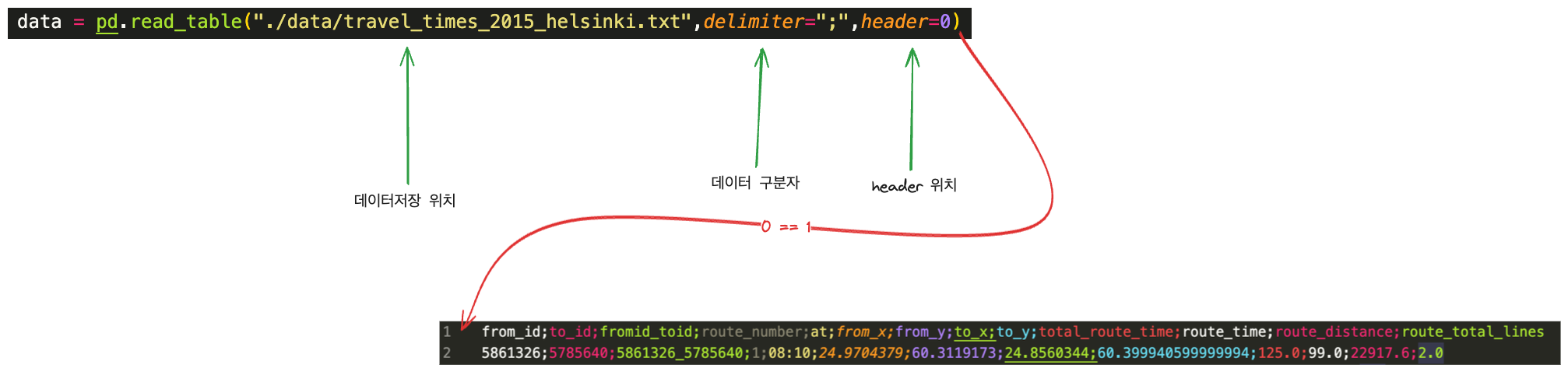 마지막은 header입니다. 각 column이 어떤 뜻을 가지는지 설명하는 제목이라고 볼 수 있습니다. pd.read_table을 기준으로, header=0이면 가장 첫 행을 column의 제목으로 쓴다는 뜻입니다. 만약 header가 없는 데이터를 쓴다면 해당 header=None으로 설정하면 됩니다.