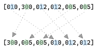 편의상 array에 0을 붙여서 자리수를 맞췄습니다. 여기에 각 자리수에 대해 stable한 sort를 진행하면 다음과 같습니다.