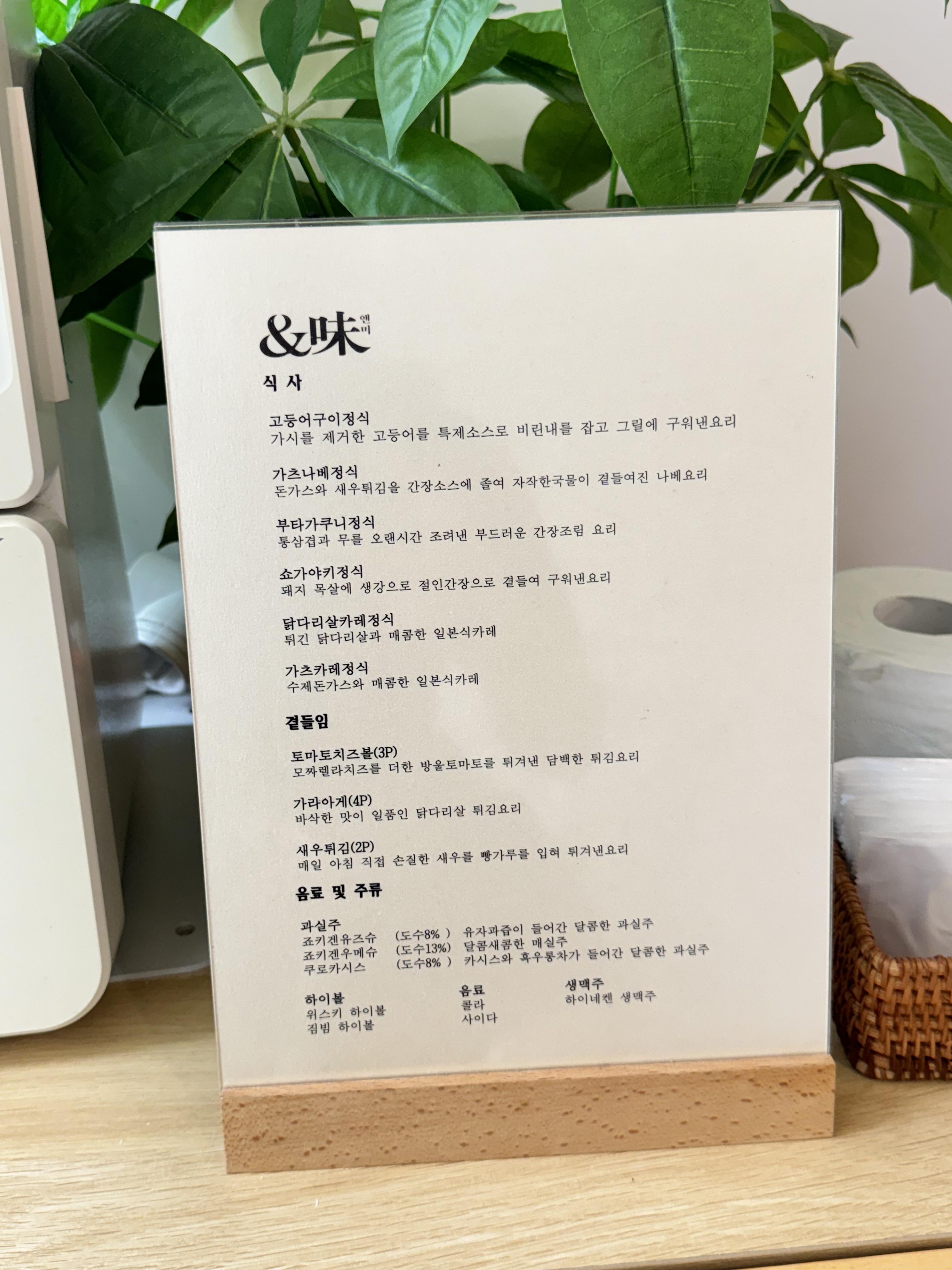 내부는 우드톤으로 따뜻한 분위기를 자아내며, 잔잔한 음악이 흘러 조용히 식사하기 좋습니다. 샤로수길 메인에서 벗어나 있어 전체적으로 조용한 곳입니다. 뒤에 옷걸이도 있어 편리합니다.