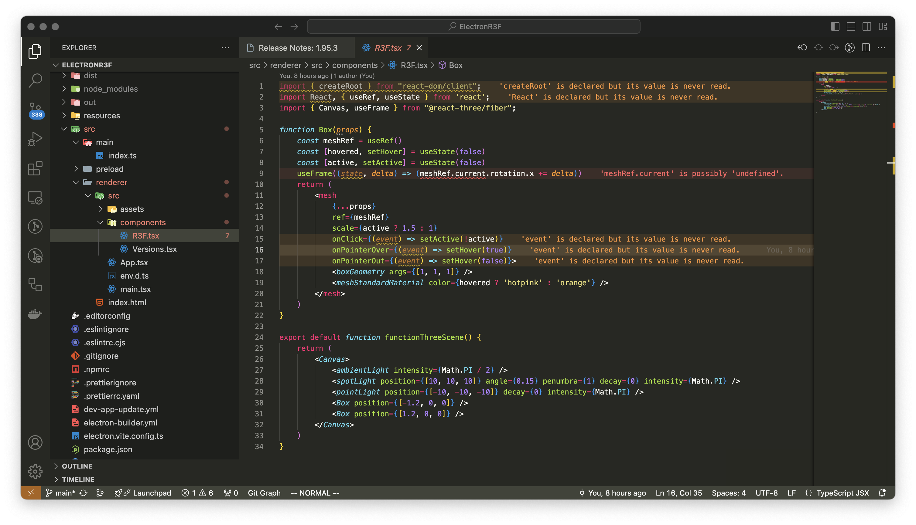 위 App.tsx에 다양한 내용이 들어있습니다. 하지만 저는 R3F 내용으로 바꿧습니다.