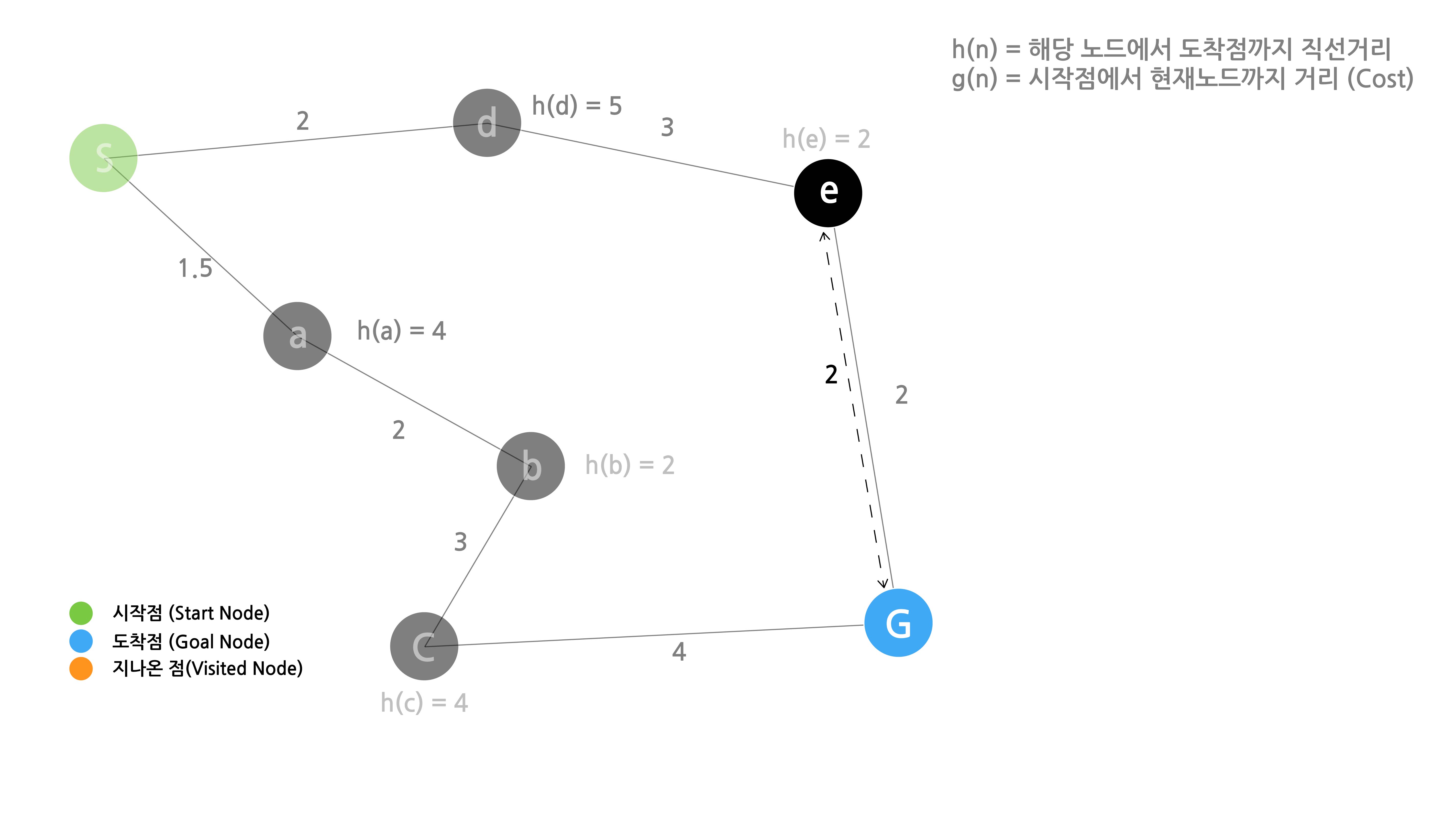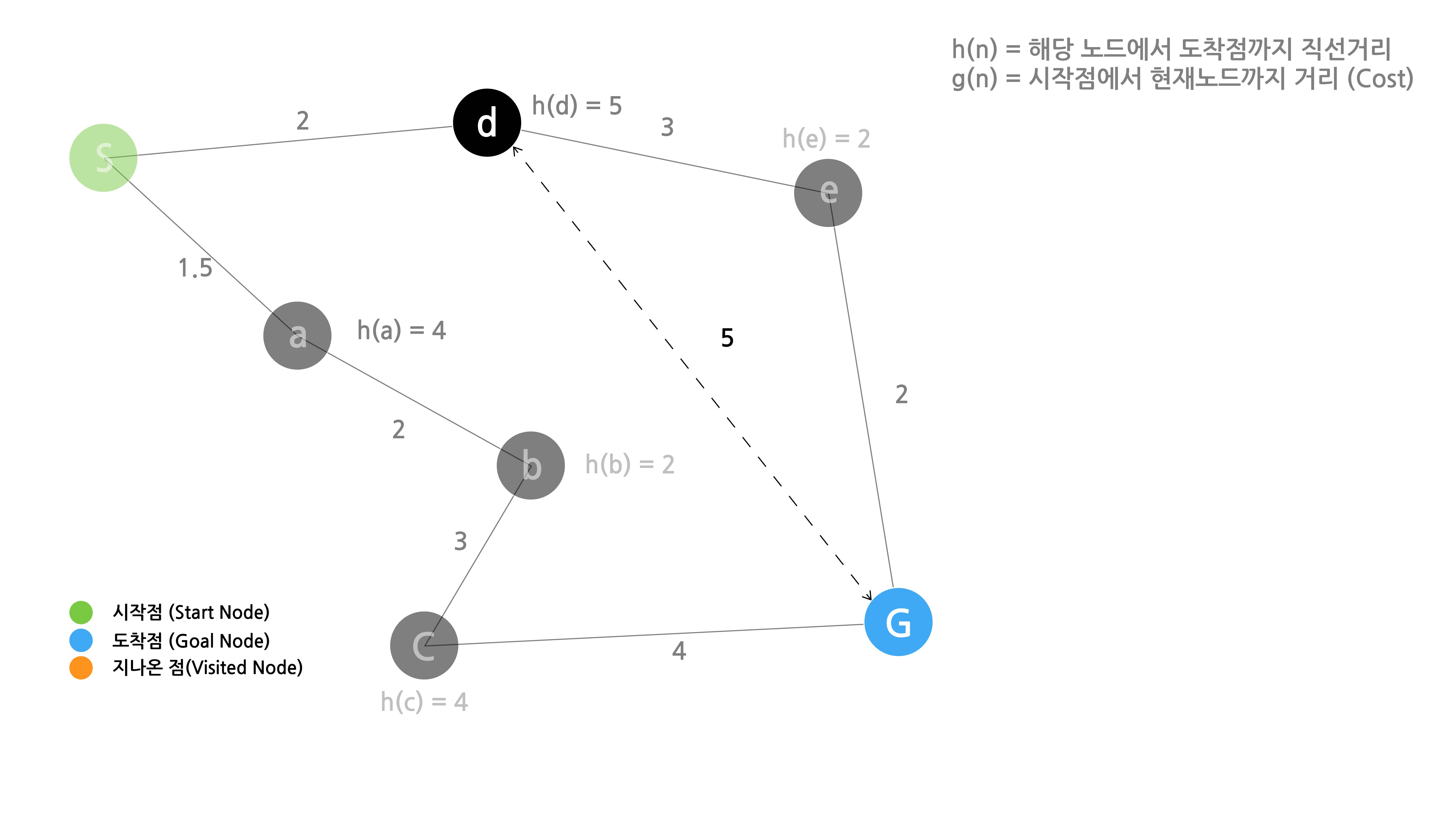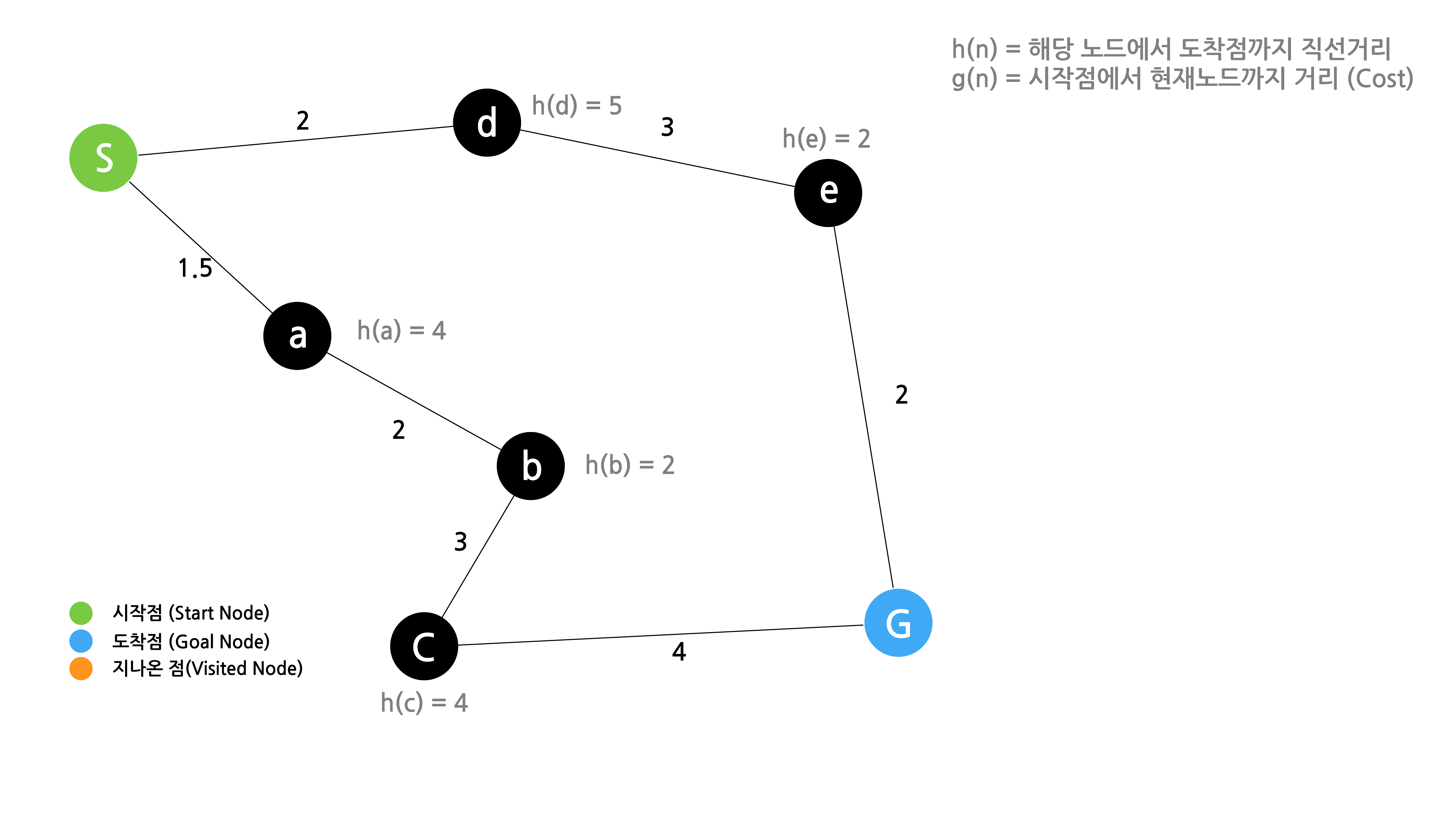 $g(n): 시작노드에서 현재 노드까지 Cost(여기선 거리)$