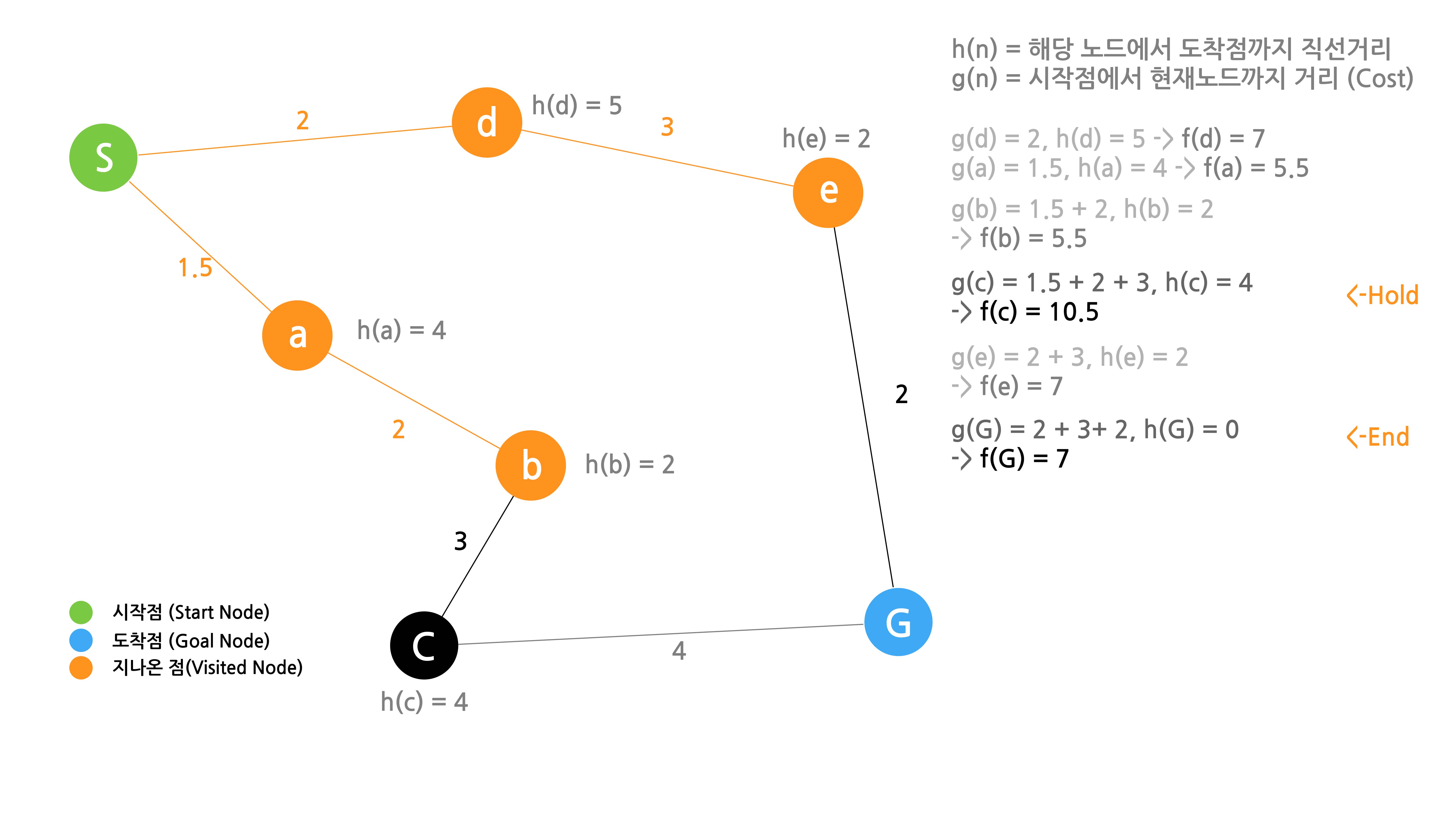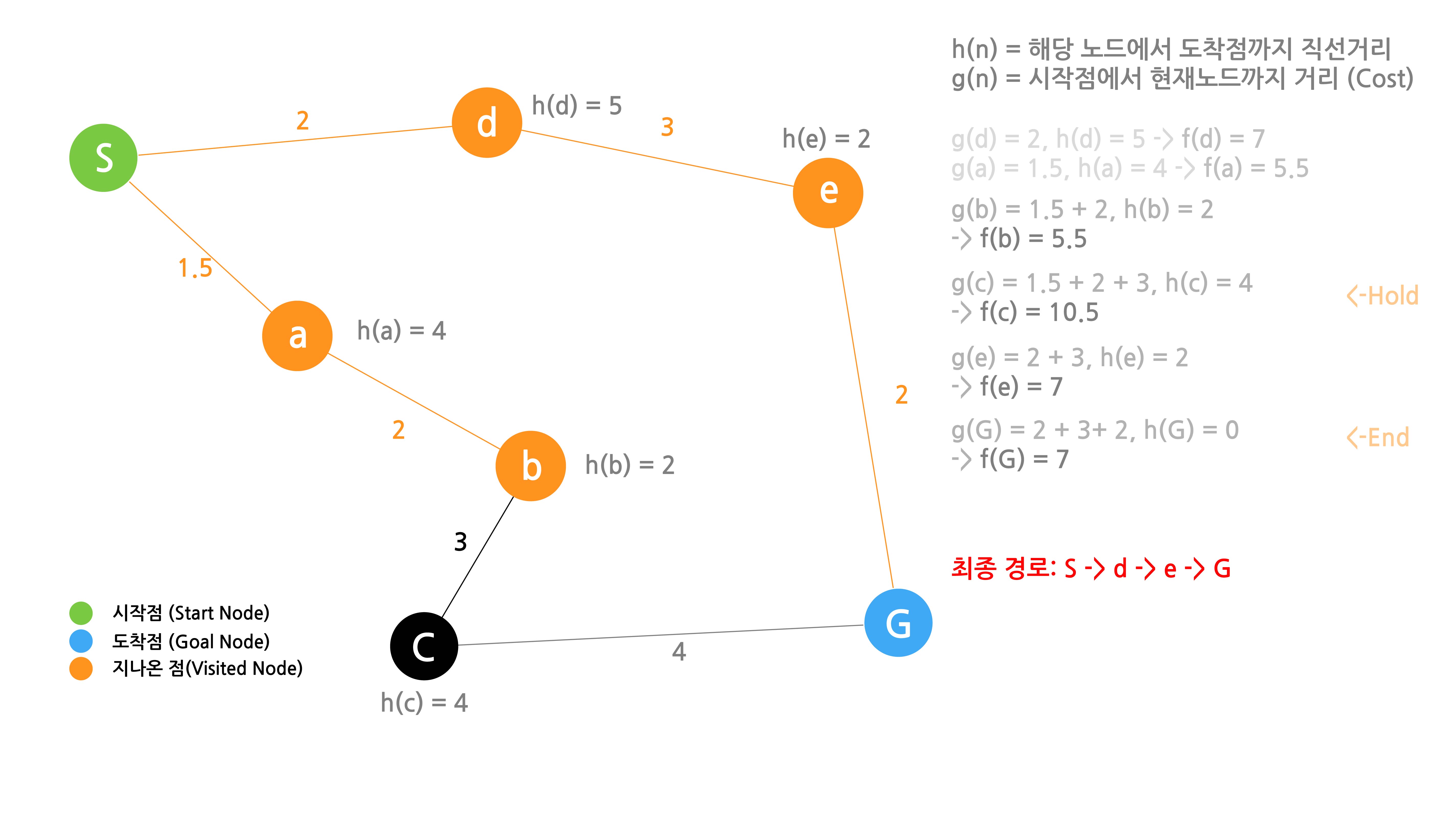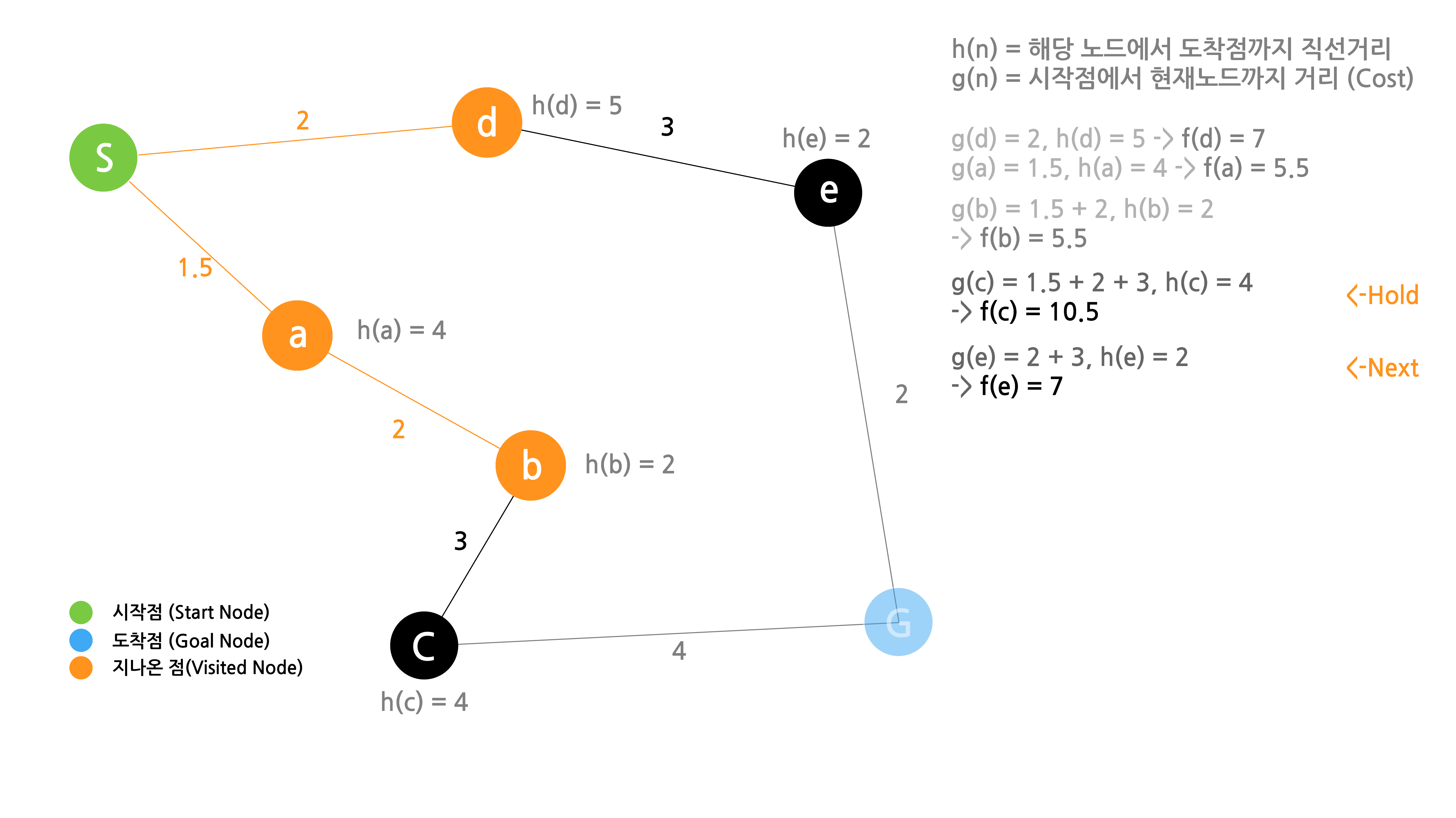 인접 노드들의 $f(n)$ 계산 -> 비교 -> $f(n)$이 작은쪽을 노드를 선택, 큰쪽은 Hold -> 선택된 노드의 인접 노드들의 $f(n)$ 계산 -> ... -> 선택된노드 == 도착점인 경우 멈춤