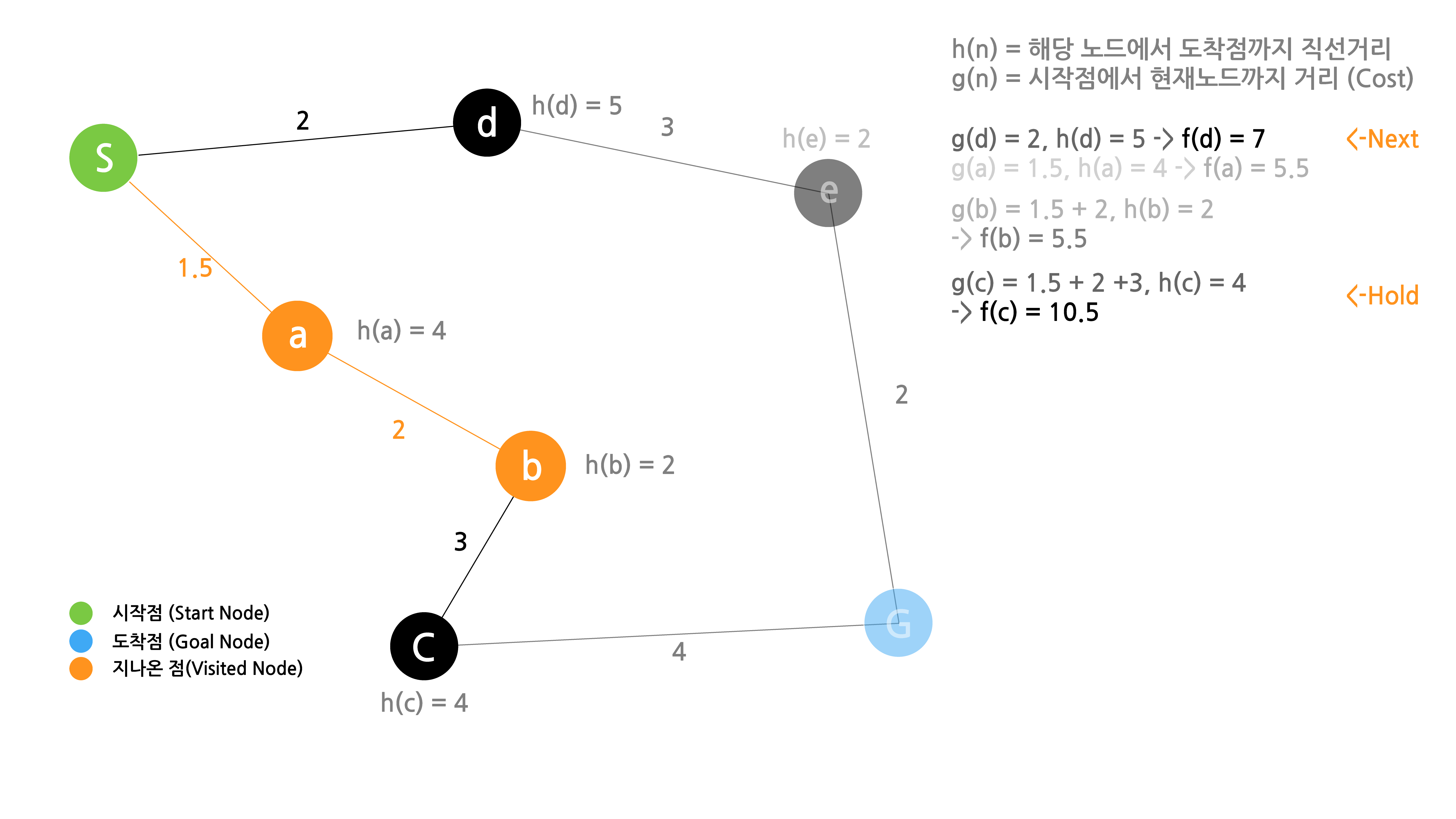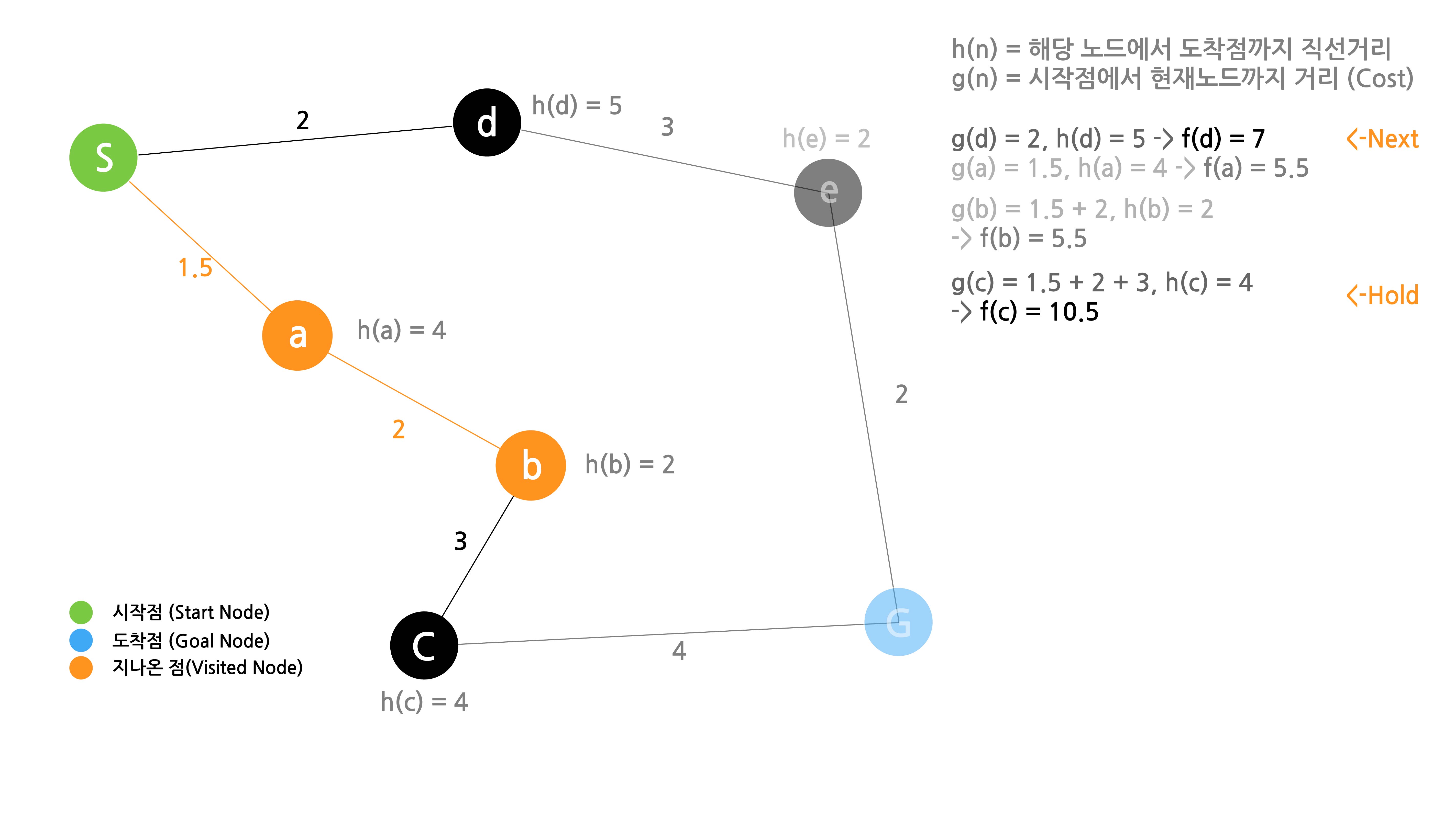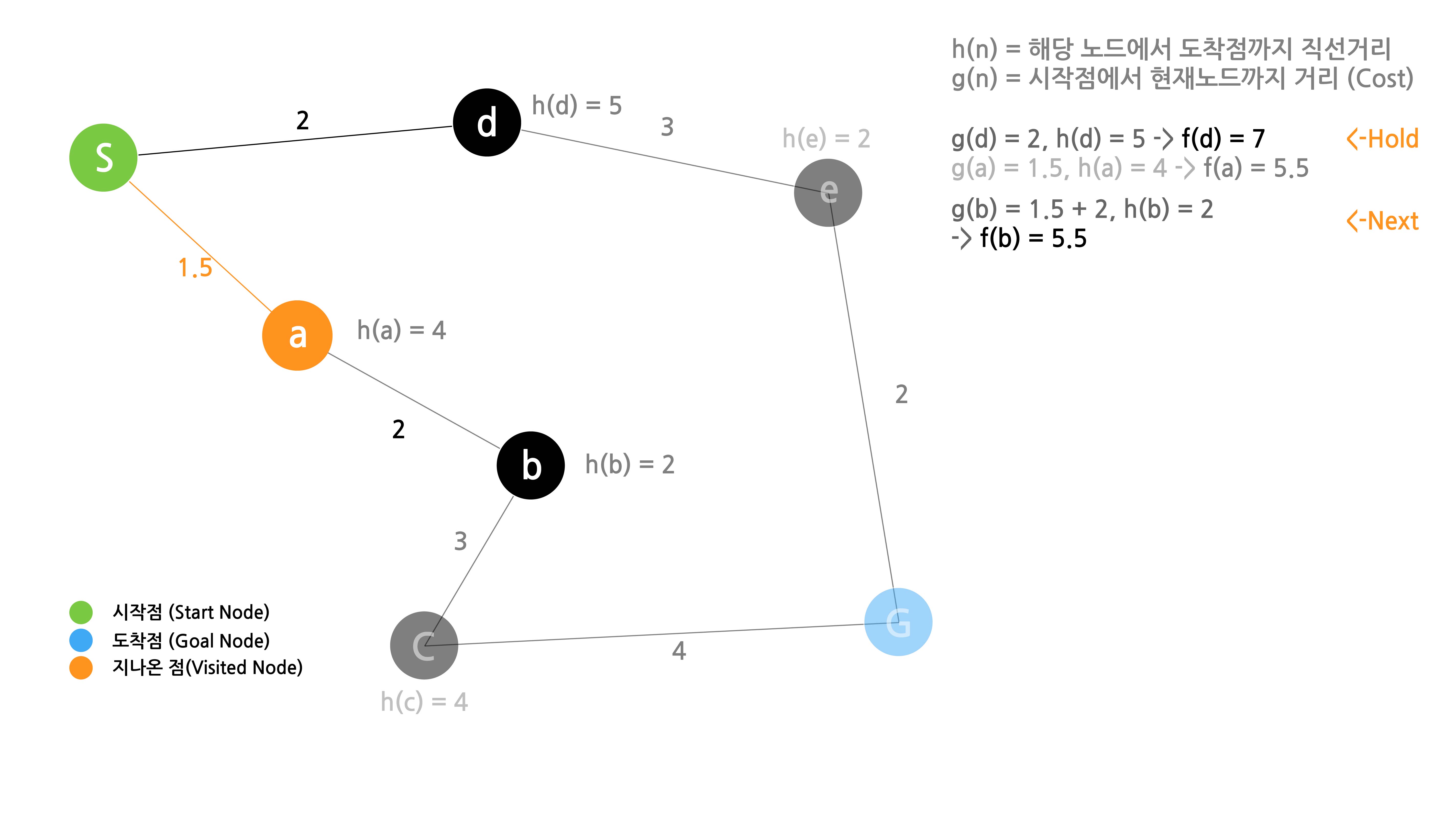 인접 노드들의 $f(n)$ 계산 -> 비교 -> $f(n)$이 작은쪽을 노드를 선택, 큰쪽은 Hold -> 선택된 노드의 인접 노드들의 $f(n)$ 계산 -> ... -> 선택된노드 == 도착점인 경우 멈춤