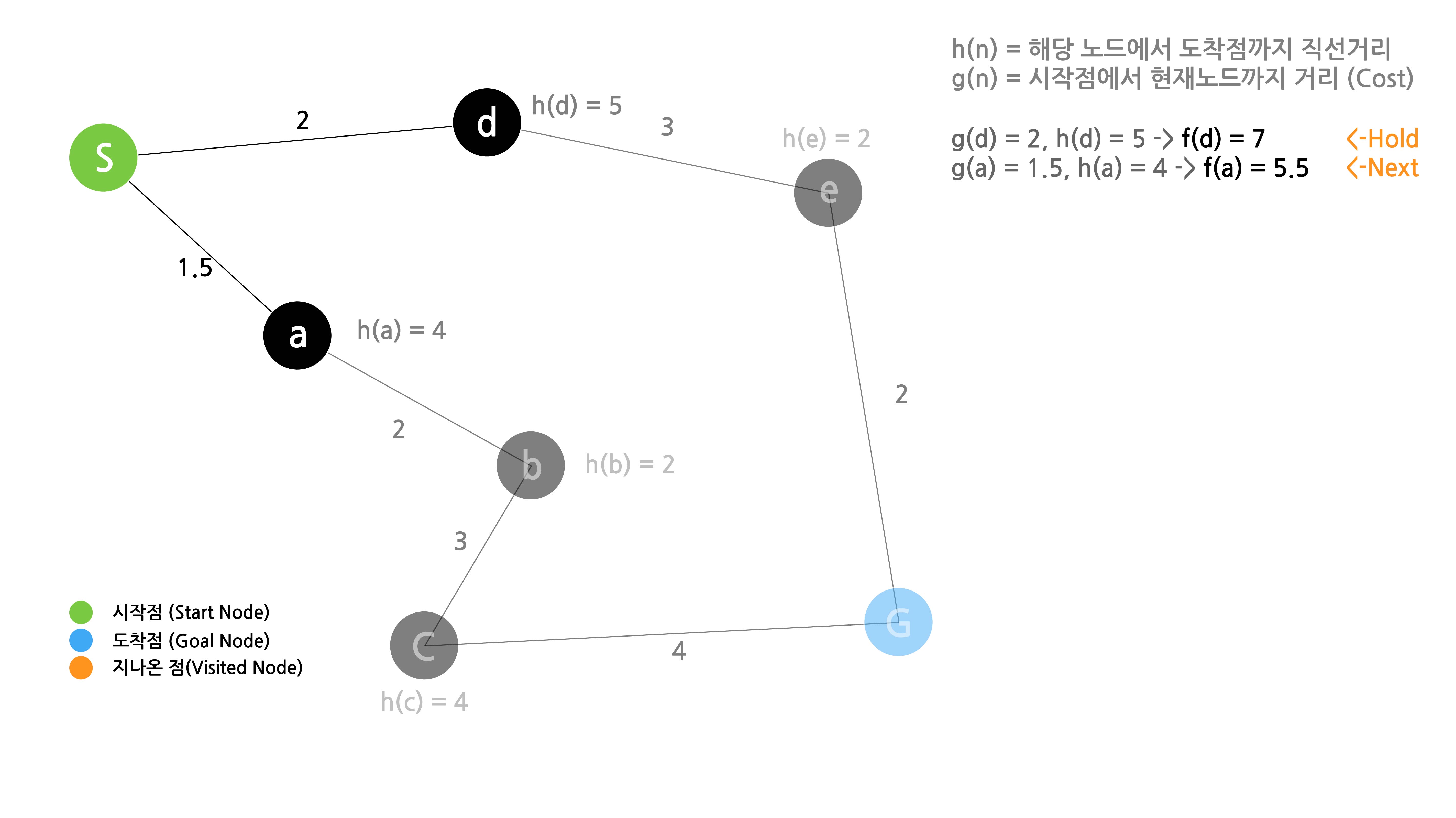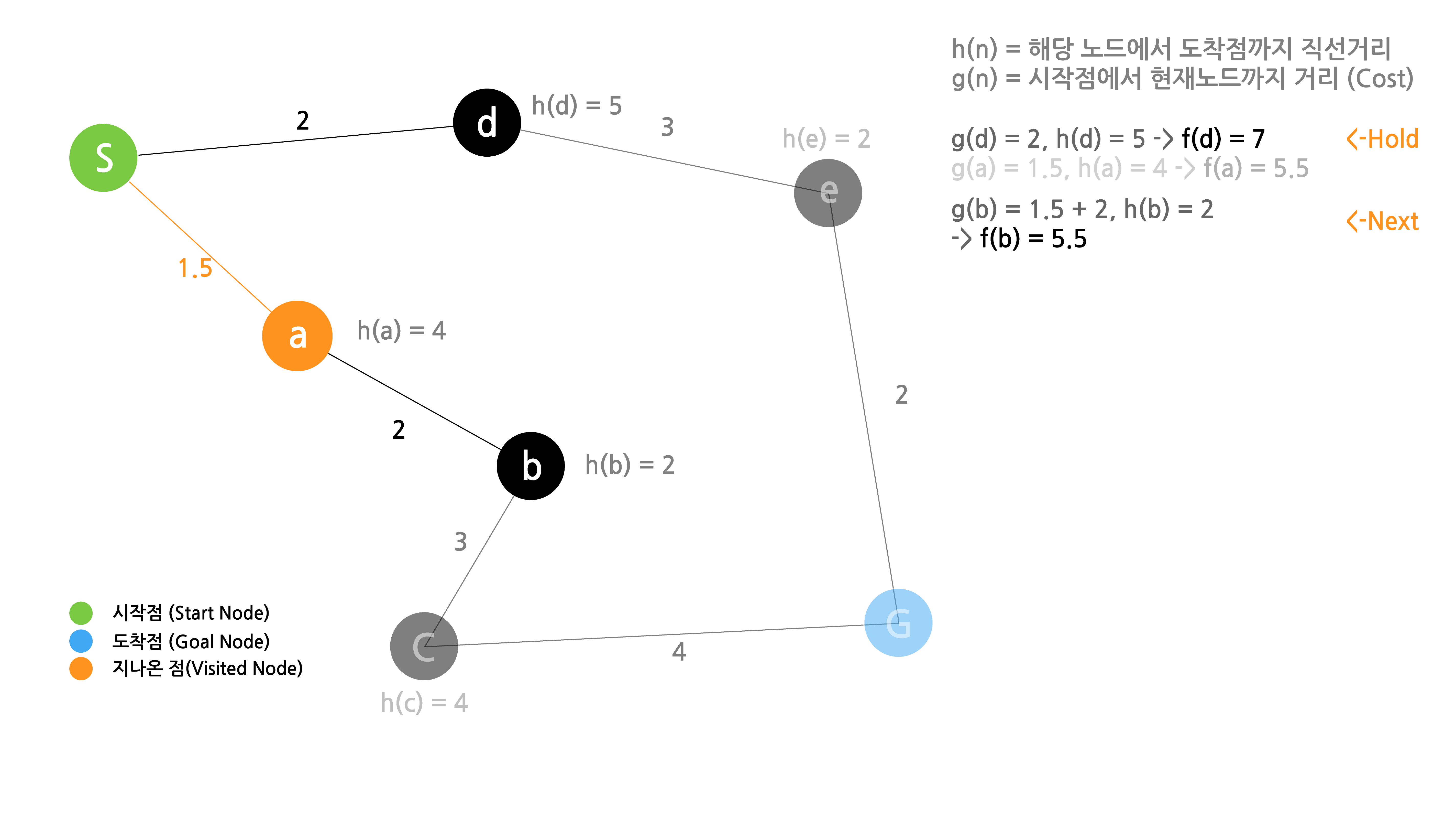 두 값을 비교하여 $f(a)$가 작기때문에 a가 다음 노드로 선택됩니다.