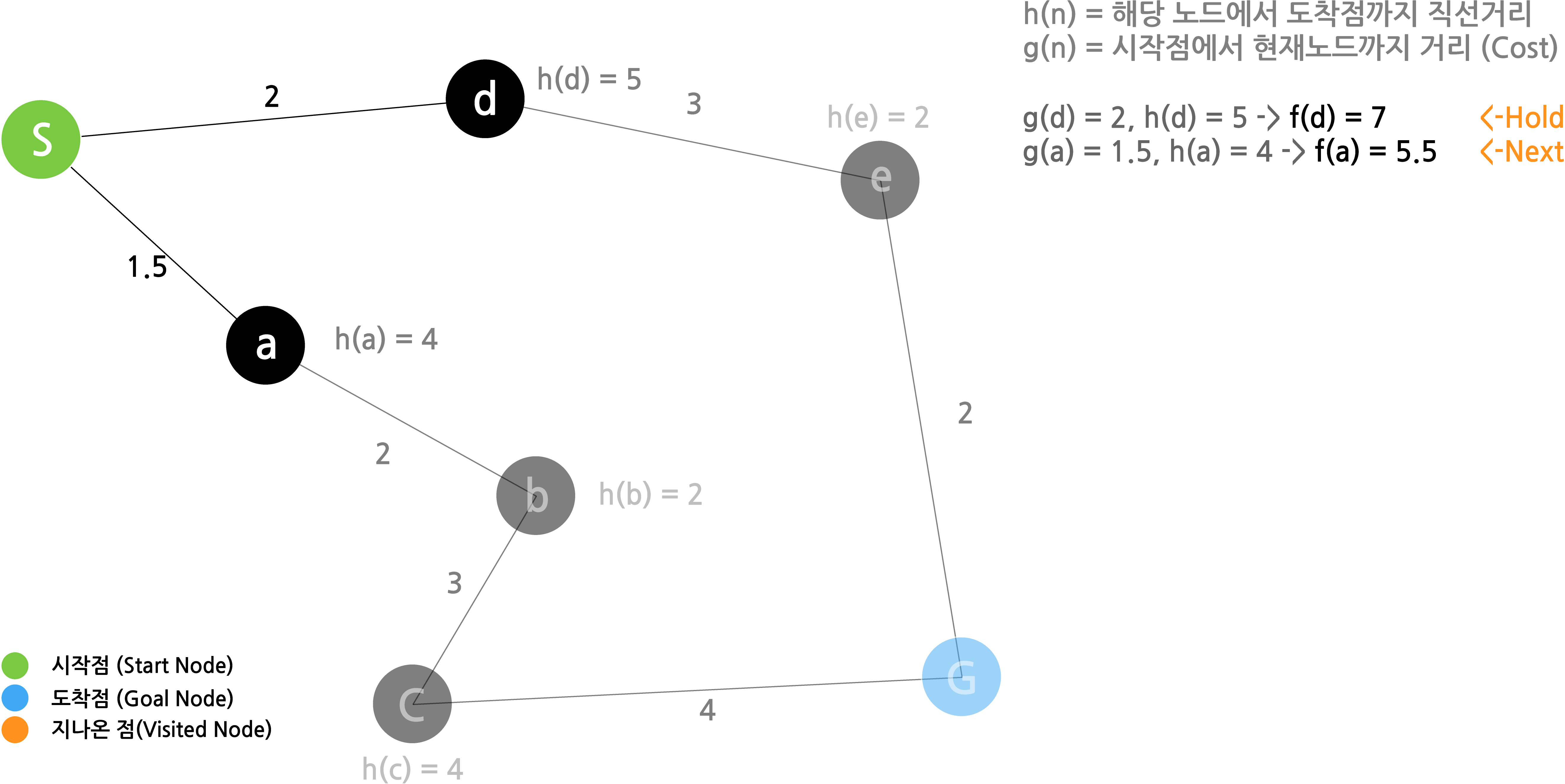 $f(a)$ 값도 마찬가지 입니다. $cost = 1.5 -> g(d) = 1.5$이며 $h(a) =4$ 입니다. 따라서 $f(a)=5.5$입니다.