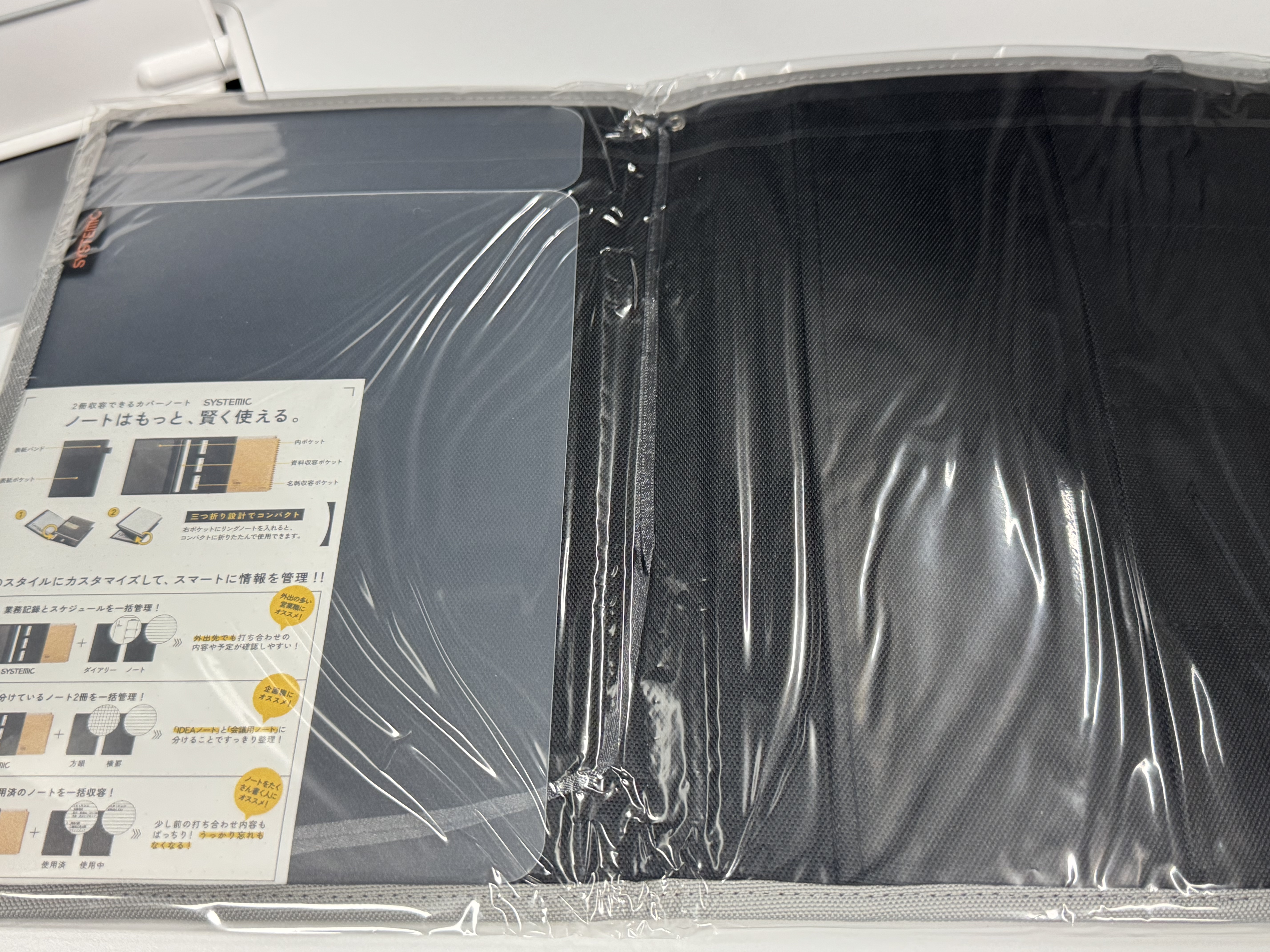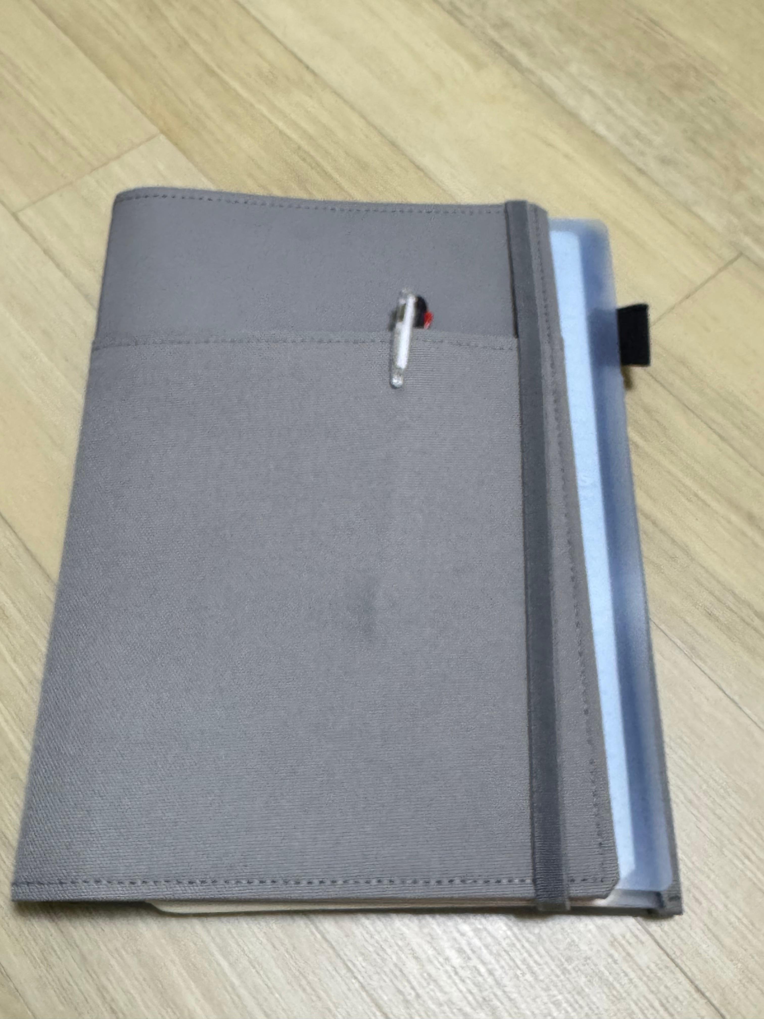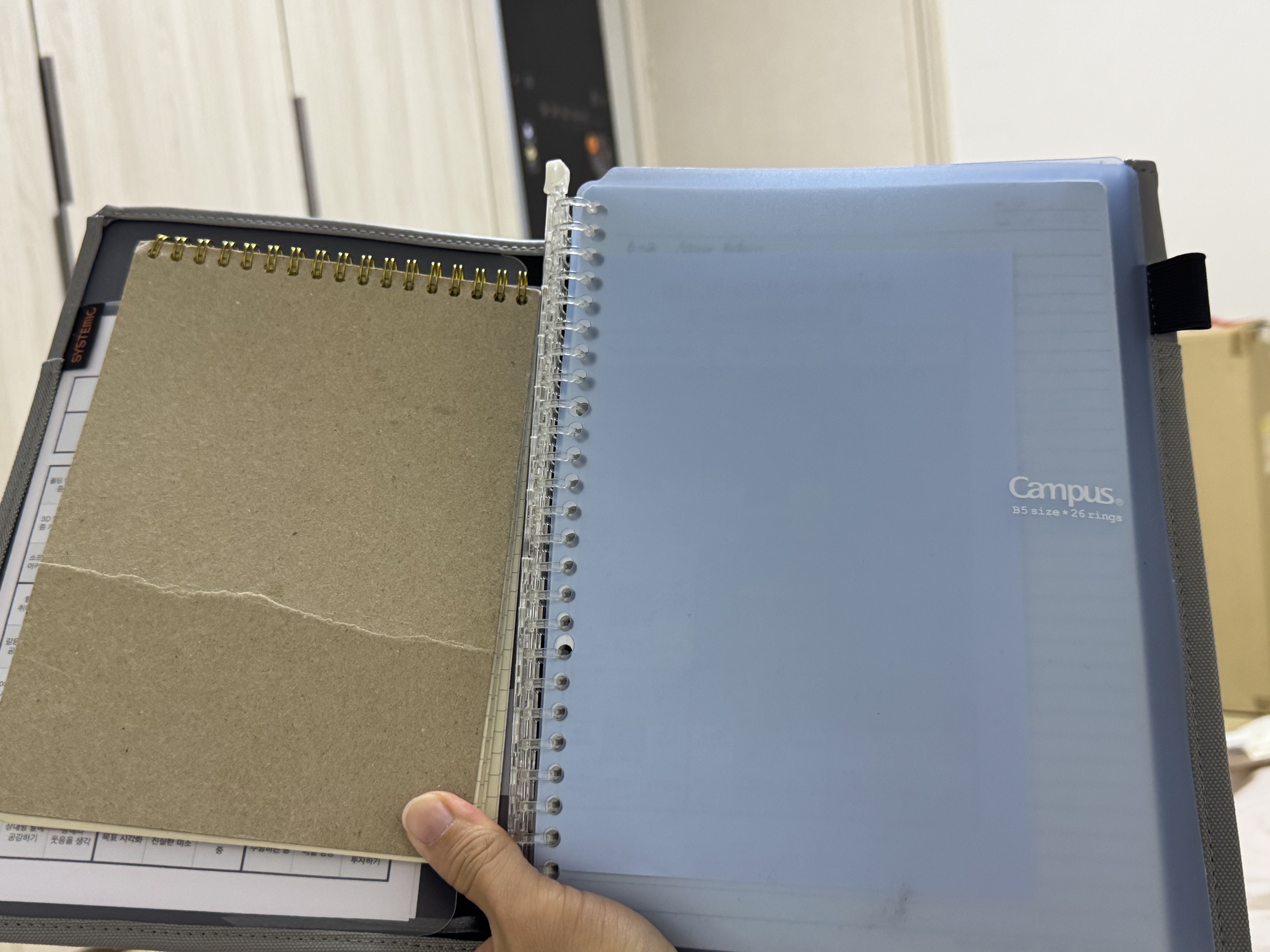 제 본 목적은 기존에 있는 스마트링 노트를 쓰는 것 이었습니다. 시스테믹 커버에 스마트링 노트를 넣어본 결과, 80% 정도 만족스러웠습니다. 한쪽엔 목표나 계획(A5 사이즈)을, 다른 한쪽엔 B5 스마트링 노트를 넣어 사용할 수 있었습니다. 노트링이 약간 튀어나오긴 했지만 불편하지는 않았습니다.