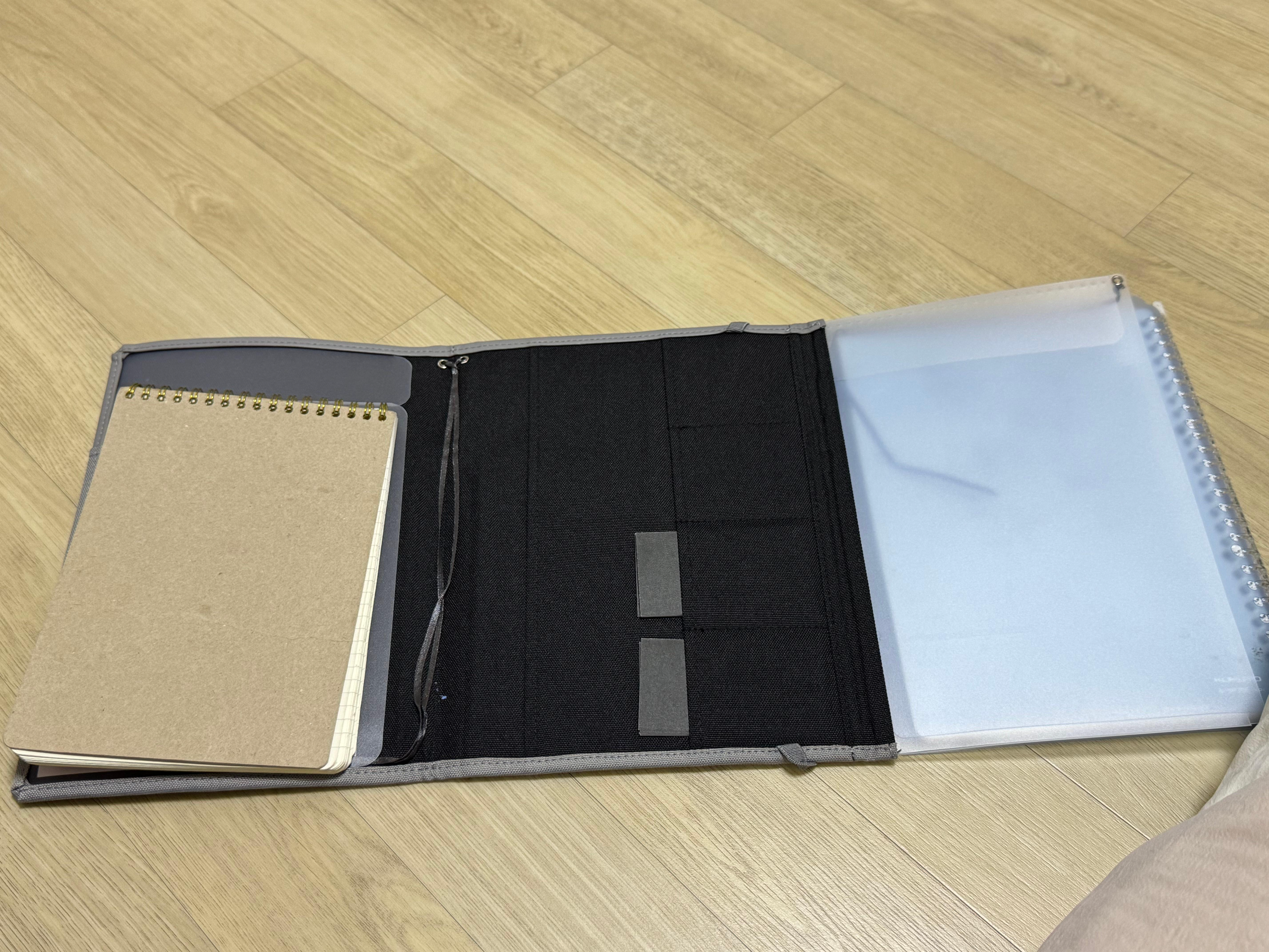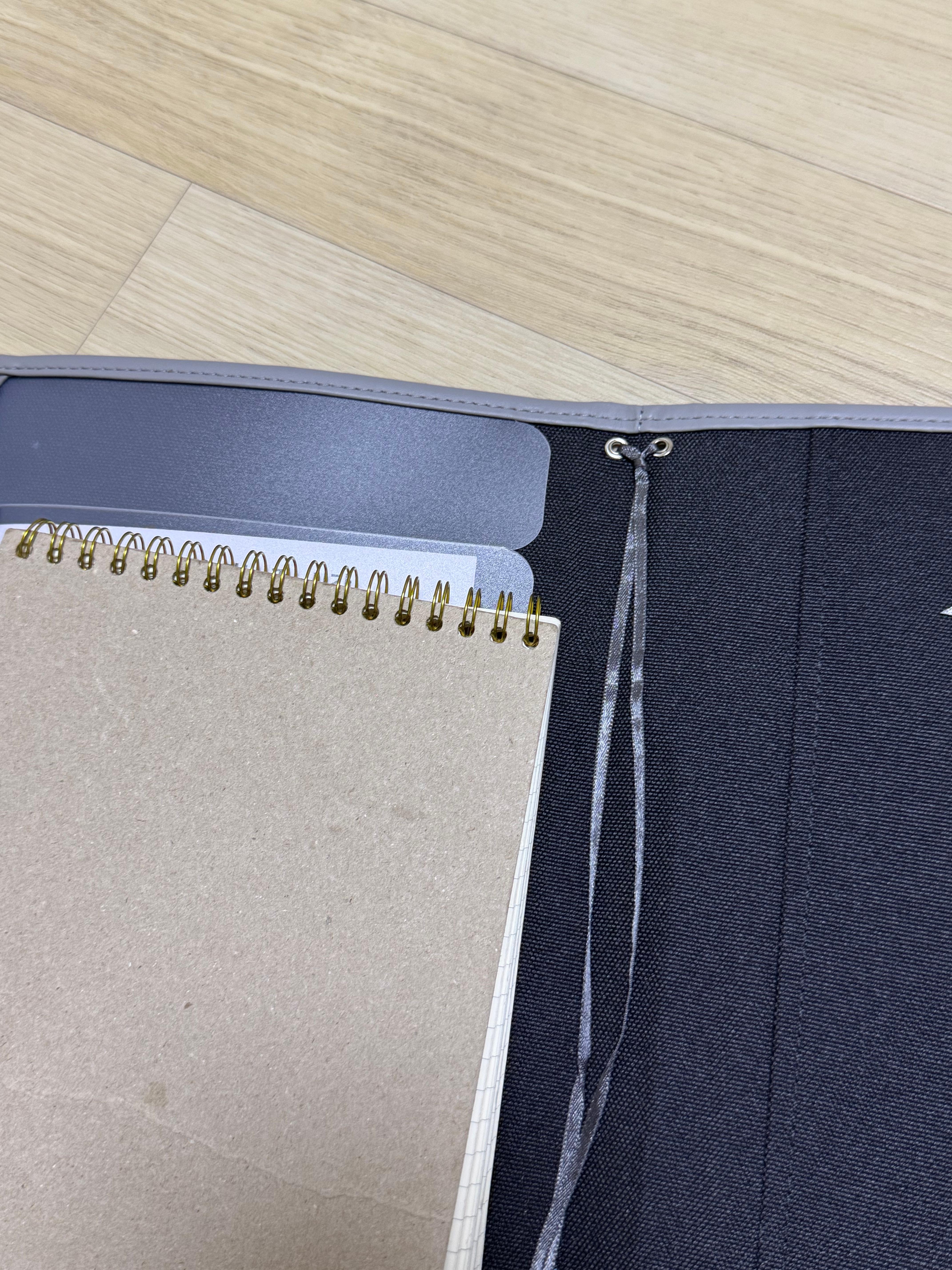 일반 커버처럼 한 번만 접히는 게 아니라, 두 권의 노트를 동시에 넣을 수 있도록 좌우로 한 번씩 더 펼쳐지는 방식이죠.