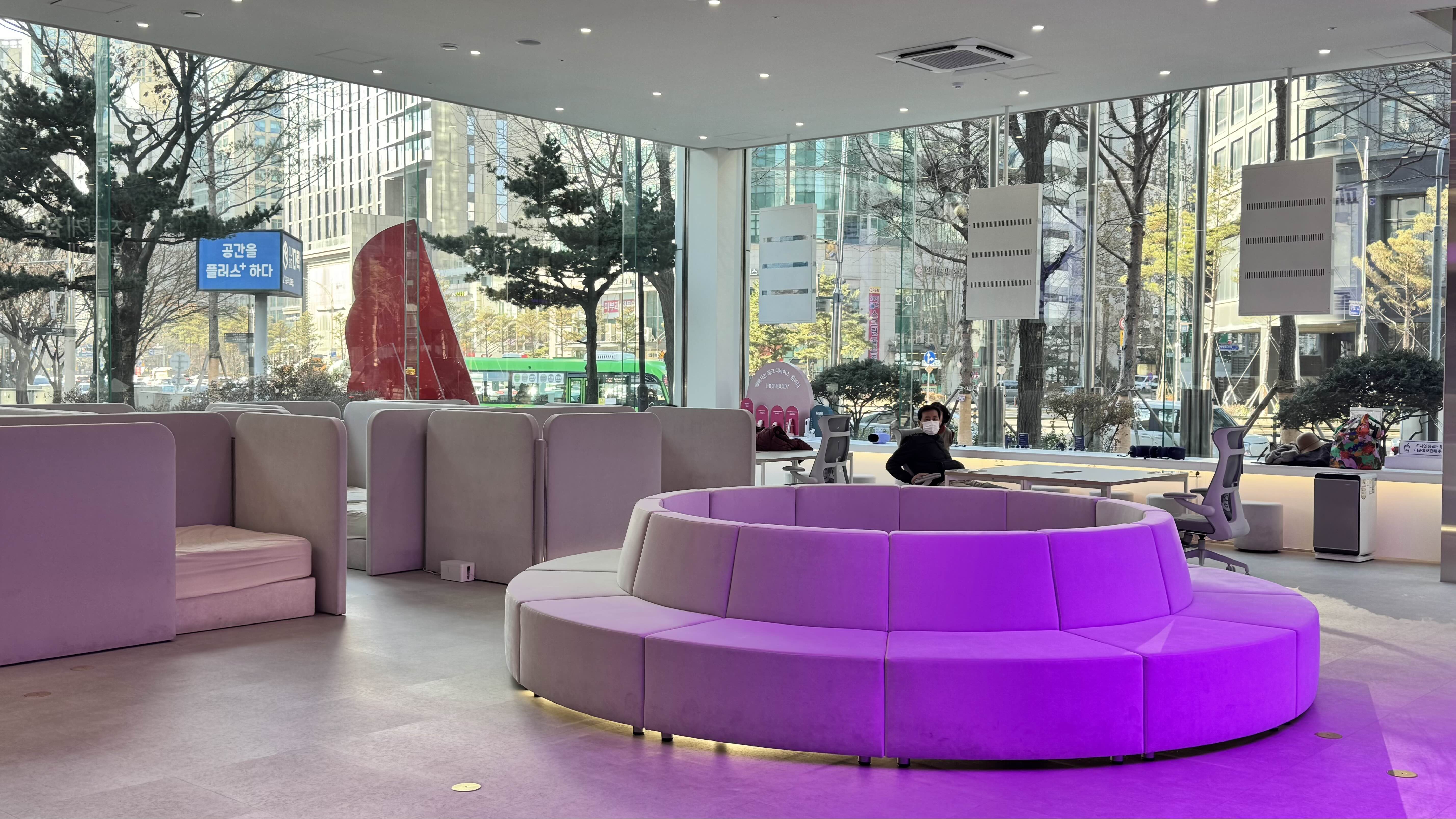 매장 내부를 보시면 아시겠지만, 칸막이가 있는 프라이빗한 체험 좌석이 마련되어 있습니다. 신발 벗고 들어가서 누워 있으면 여기가 매장인지 우리 집 안방인지 헷갈릴 정도예요. 폴리오의 보라색 조명도 잘 녹아든 공간이었습니다.
